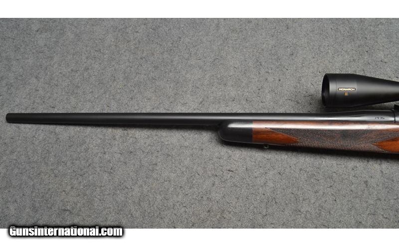 Description: This beautiful walnut stock bolt action rifle is a Montana Rifle Company Model 1999 chambered in .270 Winchester. The Montana Rifle Company are the folks who in 1999 came out with a hybrid action that combined the best features of the `98 Mauser and the Winchester Model 70, but also incorporated unique design features of their own, which improved on both of those iconic designs. On cursory examination of a Winchester Model 70 and an MRC Model 1999 side by side, about the only readily observed difference is in the bolt stop/release. On the Model 70 it's a simple lever made of sheet stock that pivots vertically in a slot on the left underside of the receiver bridge. A small extension of this lever juts up just behind the left bridge wall, and when pushed forward, pivots the lever downwards out of the left lug raceway. On the Montana action the bolt stop is more Mauser-like in that it's housed on the side of the receiver bridge. It's more obtrusive, but classier. By dovetailing the lock lugs and machining the raceways to match, it provides more lateral stability to the bolt, smoother operation, and less tendency to bind. .270 Winchester SOLD Chambers: 4 round internal magazine Metal Condition: Bluing is in excellent condition Wood Condition: Beautiful walnut stock with ebony tip on fore end is in excellent condition Bore Condition: Bright and shiny with rifling intact Barrels: 24 inch barrel Stock Dimensions: "13¾ LOP, 45 inches overall length Fore End: Extra deep diamond checkering on fore arm and on pistol grip Butt Pad: Rubber butt pad Weight: 8 lb 5 oz Sights: Nikon Monarch 3 4-16X40 Long Range Hunting Reticle Item Location: Wichita, KS |