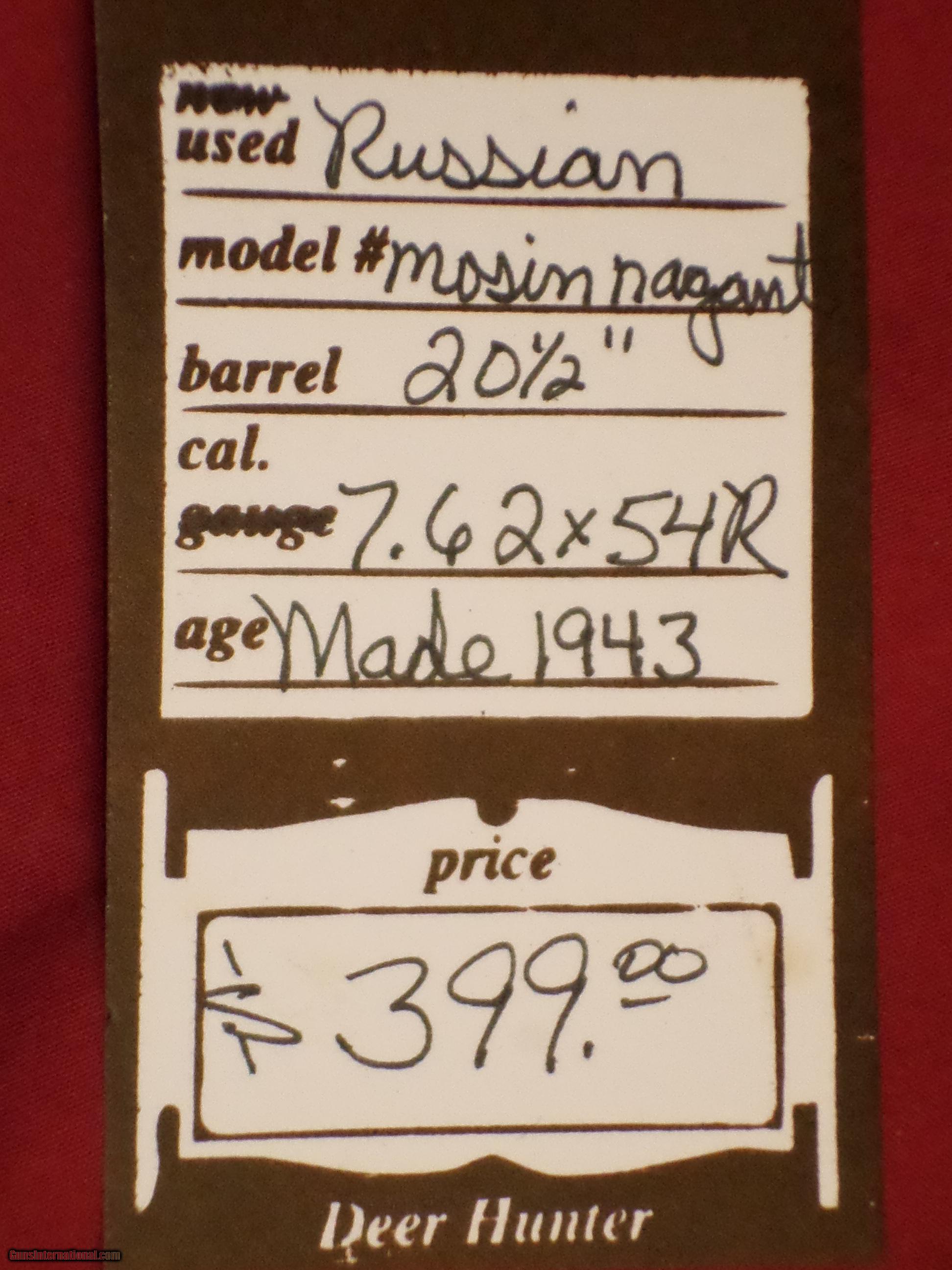Description: SOLD For sale, Mosin Nagant 91/59 Carbine, 20 1/2" bbl, Circa 1943. SOLD To see more of our inventory, visit deerhunterguns,com We accept MC, Visa and Discover, no AmEx. No Sales to California. Like us on Facebook: Deer Hunter Guns SOLD |