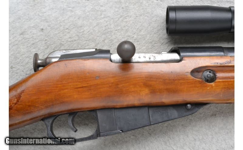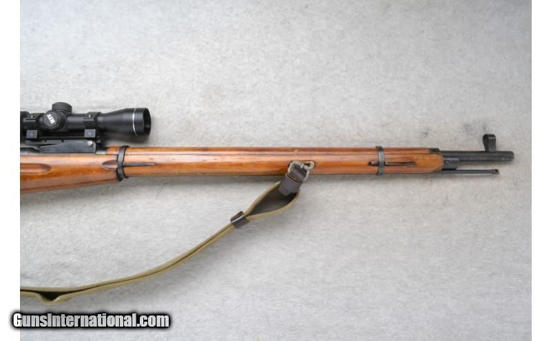 Description: This Russian State Factories Model M91/30 is a right hand bolt rifle in 7.62x54 Rimmed Cal. The barrel is 30 inches has a hooded bead front sight and AIM 2-7x32 scope. The forearm is a smooth grip two-piece walnut. The butt stock is a smooth grip walnut pistol grip with a smooth metal butt plate. 7.62X54R SOLD Chambers: 4 round hinge plate magazine Metal Condition: Very good with handling marks. Bolt has freckling. Wood Condition: Very good. Appears refinished Bore Condition: Very good Barrels: 30 inches with 2 piece smooth walnut shroud Stock Dimensions: LOP 13.5 inches Fore End: Smooth two piece walnut with finger grooves Butt Pad: Smooth metal butt plate Weight: 10 lbs 0 oz Sights: Hooded post front sight. AIM 2-7x32 scope Item Location: Richfield, WI |