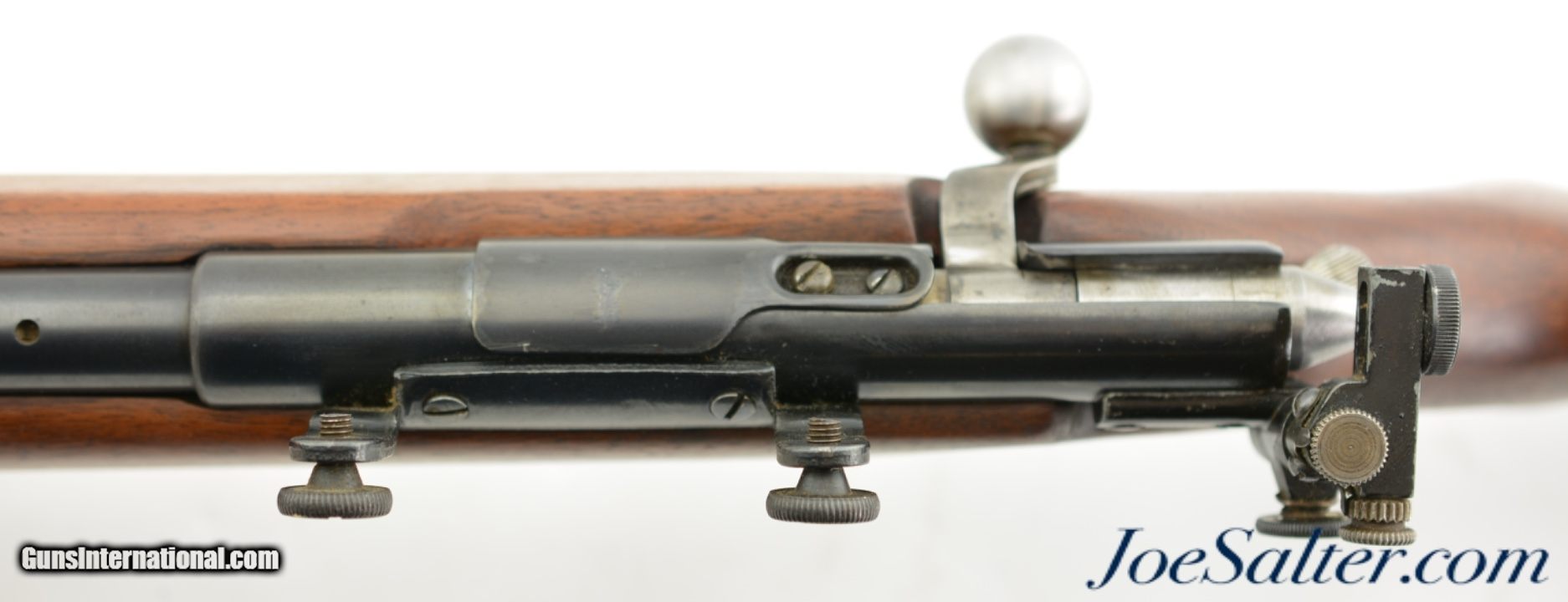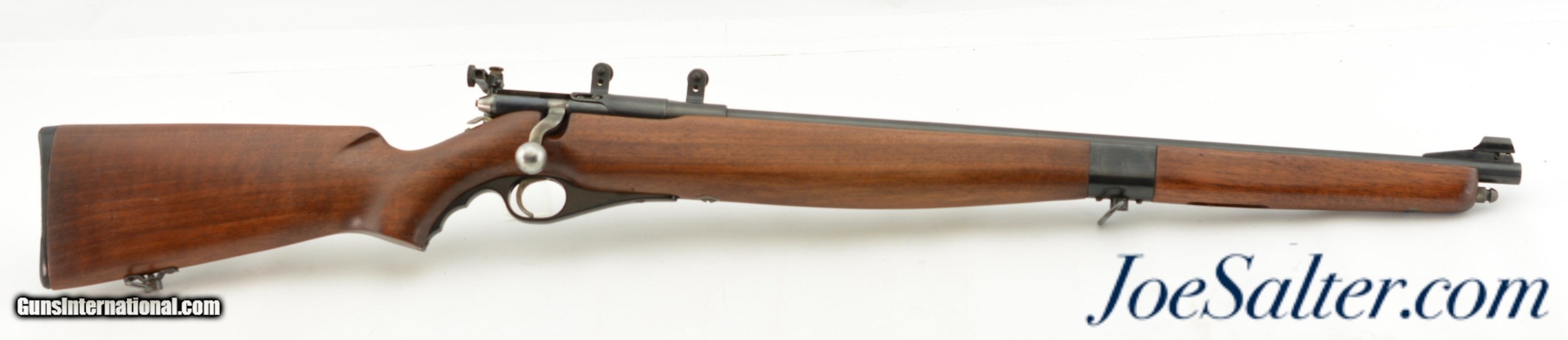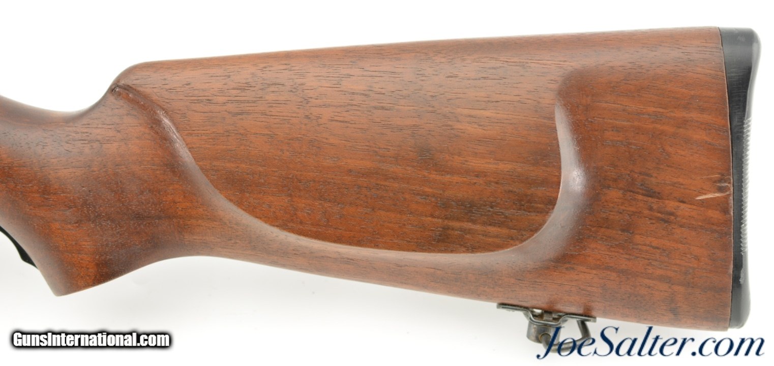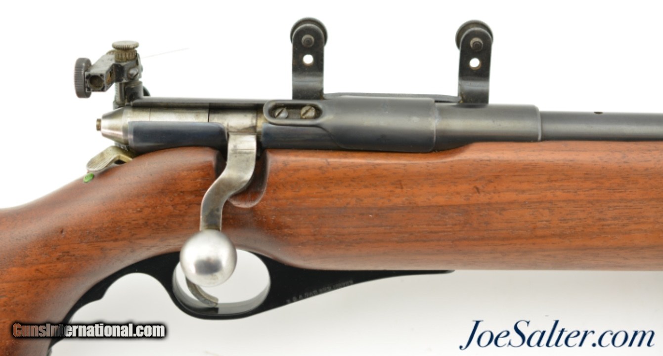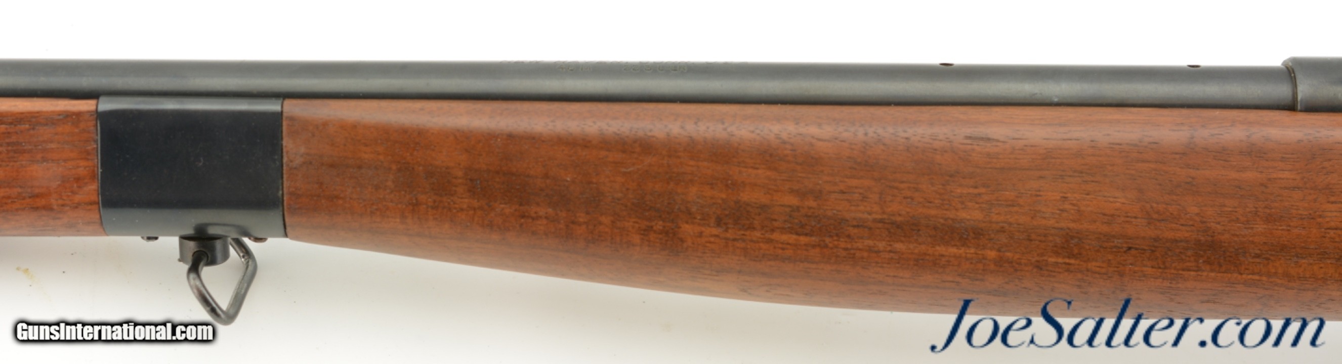 Description: Serial #NSN, .22 S, L, LR, 23 inch barrel with a bright, excellent bore. This is the Mossberg Model 46M bolt action rifle featuring a Mannlicher-style walnut stock and tube fed magazine manufactured from 1940-1945. In excellent condition the blued metal retains virtually all, 97-98% of the original finish with some very minor use marks and several tiny freckles. The walnut stock rates excellent with some scattered use marks. It is equipped with the original No.4 receiver peep sight and hooded front sight in addition the barrel is drilled and tapped and there is a receiver mounted frame for yet another sight option. An excellent example of the Wartime produced Mossberg target rifle. FFL or C&R SOLD Curio/Relic: Yes |