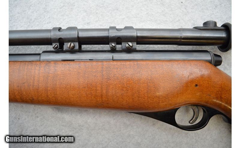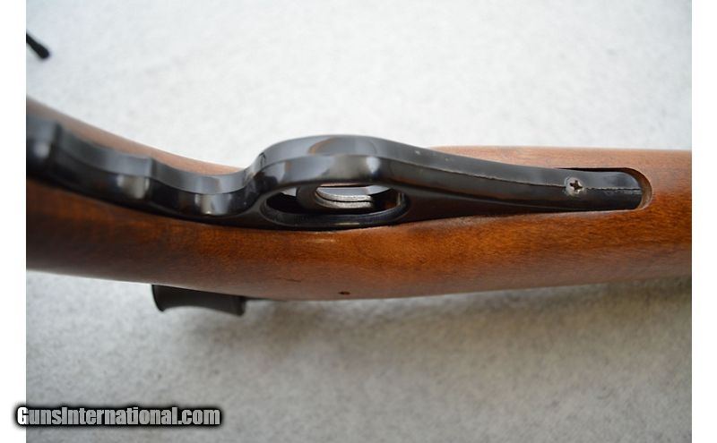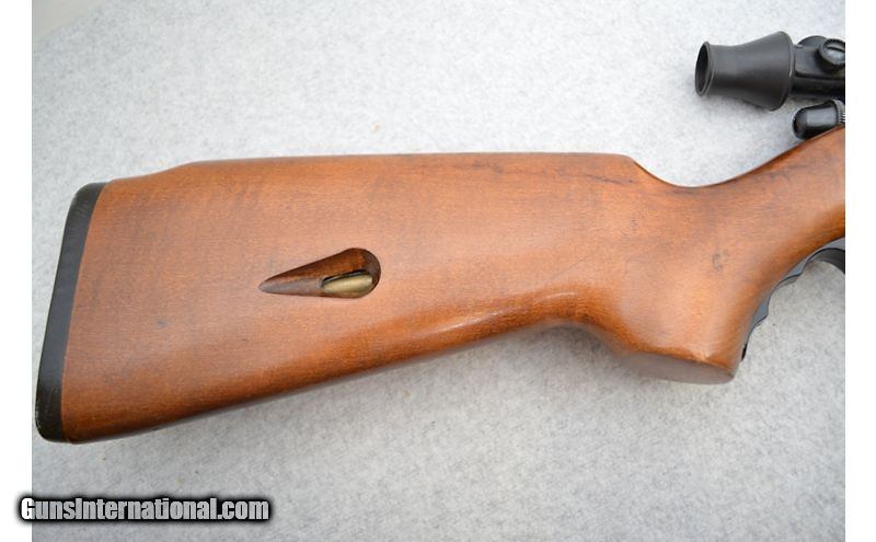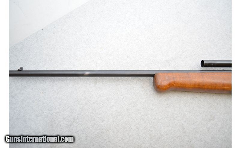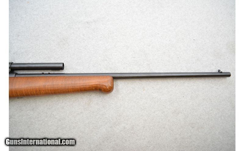 Description: Might be a good rifle if some of the issues can be addressed. Aside from a patch of missing bluing (see pictures) on the barrel, the metal is in good shape as is the wood. As mentioned earlier, the bore has a short length of rifling that is just gone. As concentric as this ring is, it seems an odd flaw to have not been caught at the factory all the years ago. The trigger spring has also lost a lot of its power over the years and sometimes does not reset the trigger after firing. When this happens the trigger must be pushed forward, then it functions "normally". Would be an interesting project gun for someone. .22 Long Rifle SOLD Chambers: Semiautomatic fed from a tubular magazine. Metal Condition: Good. Wood Condition: Good. Bore Condition: Fair. Healthy rifling and bright shine but there looks like there is a ring of missing rifling a few inches from the muzzle. Barrels: 24" Blued. Triggers: Case hardened. Stock Dimensions: Hardwood with 14" LOP. Fore End: Hardwood. Butt Pad: Black plastic plate. Weight: 7lbs 4oz Sights: Fixed front blade. Rear iron sight has been removed. Comes equipped with a fixed 4x scope. Chokes: N/A Item Location: Green Bay |