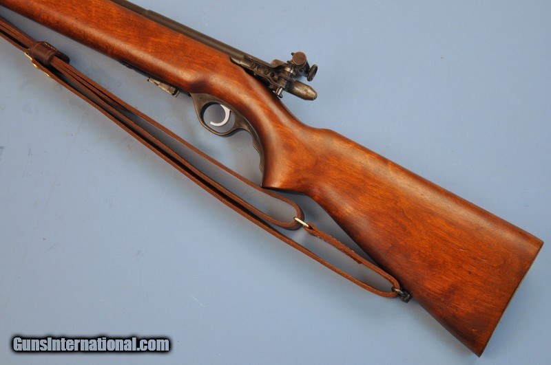 Description: 22 LR. SN, 126610. 24" heavy barrel. Mossberg S-100 receiver peep rear sight with blade front sight. 5 round detachable magazine. Walnut target stock has steel buttplate & leather military style sling on original swivels. Ca. 1943-1945. 75% fading blue showing spots of pitting around markings & bbl band. Stock has added finish over scratches & marks. Sound mechanics. Very good bore. Priority mail to FFL or C&R $25.00 SOLD Curio/Relic: Yes |