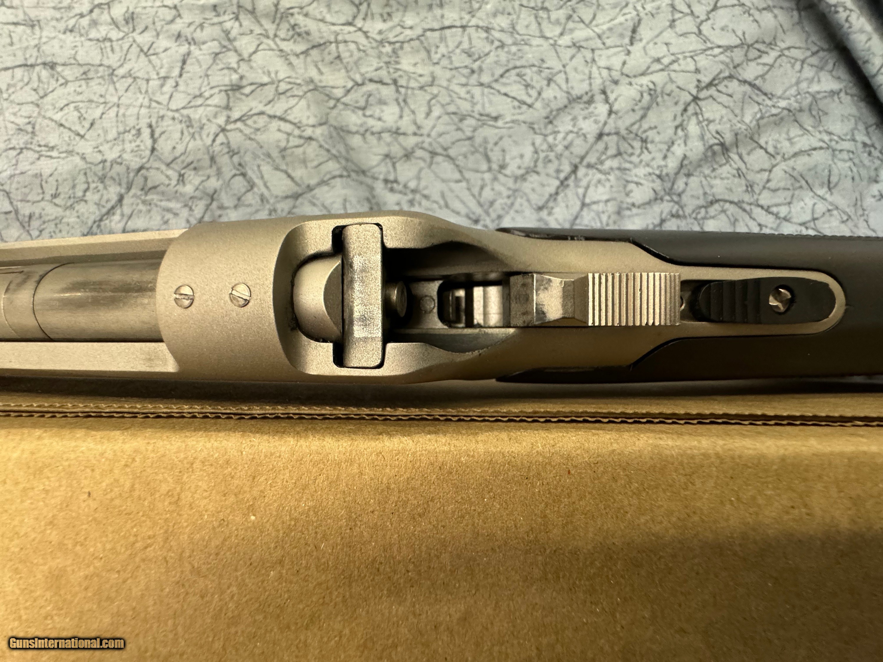 Description: Mossberg 464 Brush Gun made for Davidsons. It is 30-30 with 16" barrel. Metal is satin nickel. Stock and fore grip were grey laminated- I thought they were ugly so I refinished them with a semi flat black automotive epoxy. The black and nickel look good, at least to me. I bought it new and have fired it about 15 rounds and it worked fine. It has one little blemish on the stock next to the butt pad- see photo. S/N LA0002987. This is a light and good handling little rifle. Shipping will be $60. SOLD Rifle Caliber: .30-30 Winchester |