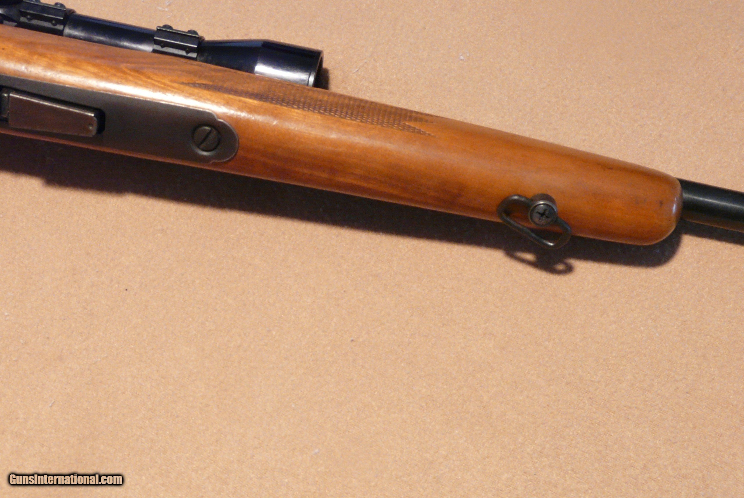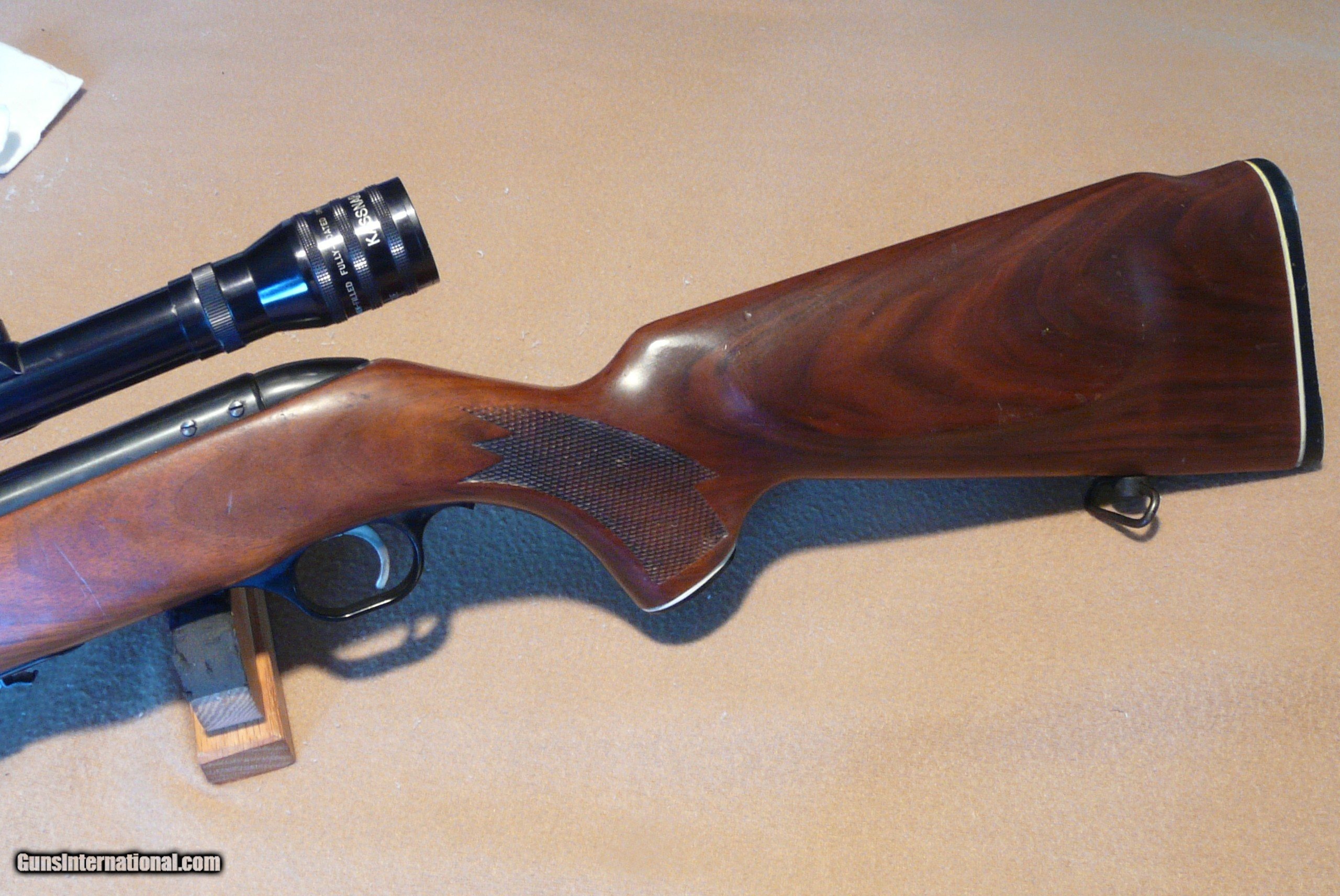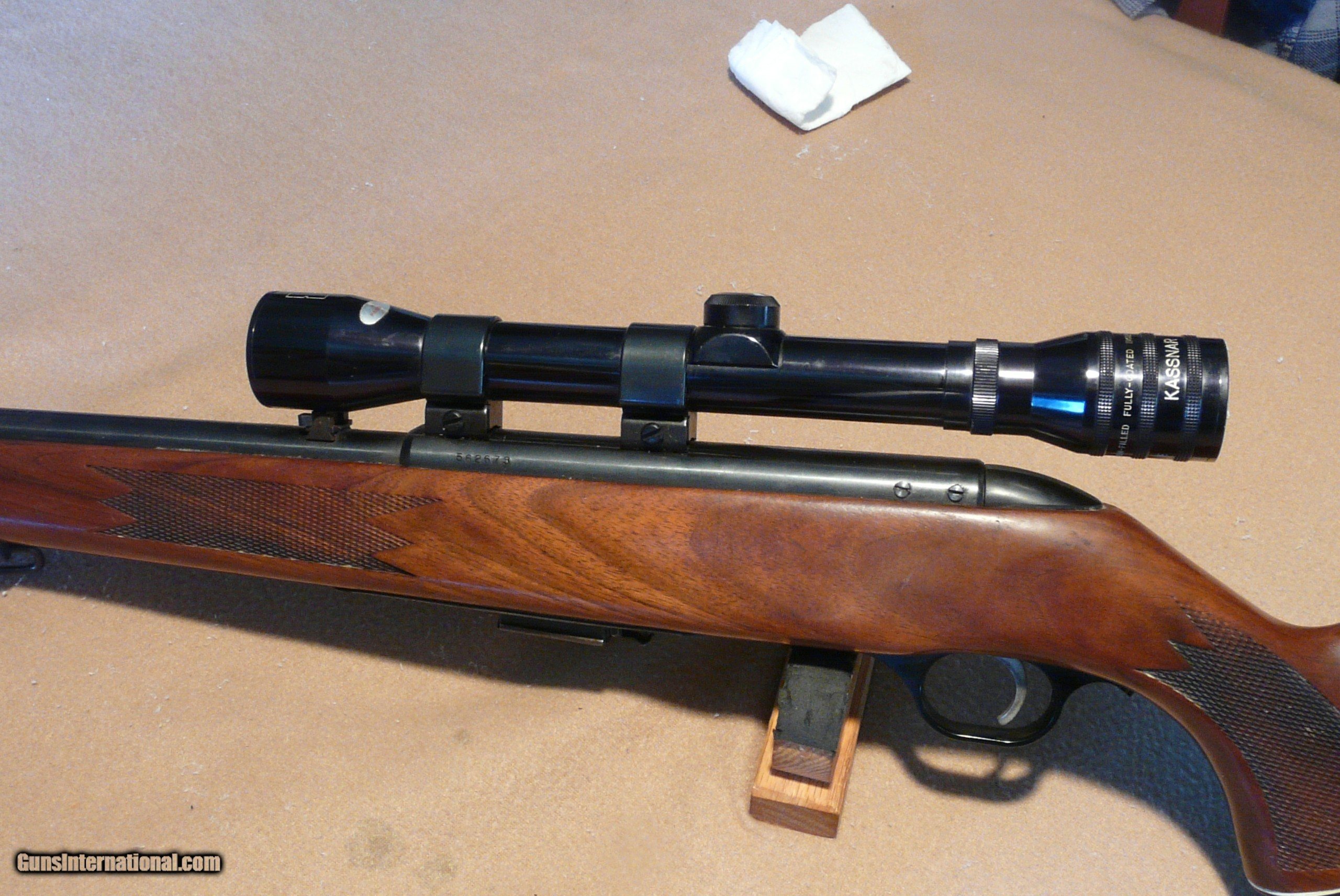 Description: These were made 1960 to 68, in 22 magnum RF, with 24" barrel and open sights, this one has a Kassnar 4X scope MFG in Japan, and still clear as new, w/ duplex crosshairs !! rifle is near new condition with 99% blue and Wood,. with ear perfect checkered wood, with Monte Carlo stock ! 5 shot magazine & factory swivels, these can take Varmints up to and exceeding 150 yds easily! this is 640 KD model, one of the best shooting 22 mags you can buy! SOLD |