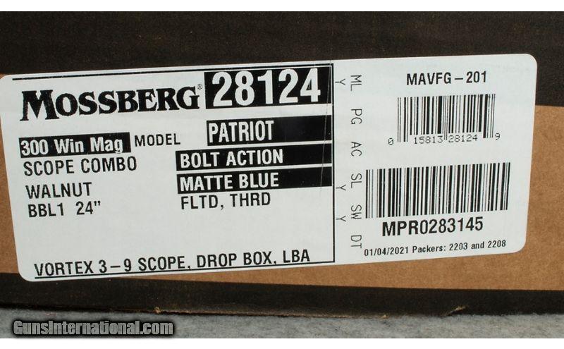 Description: Mossberg Patriot rifle in 300 Winchester Magnum Factory Vortex scope combo. .300 Winchester Magnum SOLD Chambers: 300 Winchester Magnum Metal Condition: Very Good Wood Condition: Very Good Bore Condition: Bright Barrels: 24" Fluted and Threaded Butt Pad: Walnut Sights: Vortex Item Location: short pump |