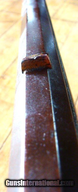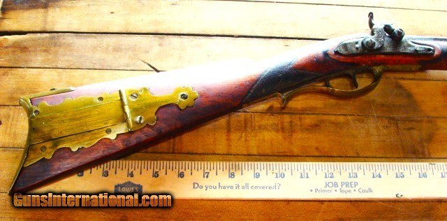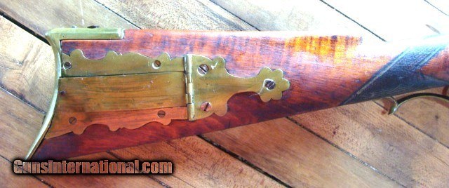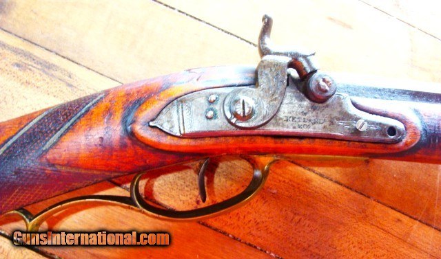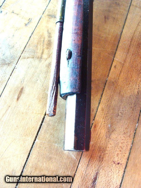 Description: From a mid-west sale, a very nice full stock Antique eastern style 50 caliber Percussion Rifle. The Tiger Stripe maple wood is aged to a uniform color with no chips, cracks or missing wood other than a crack on the left side of the tang (see photo); however, the stock is solid as a rock. There are dents and dings form 100 years use (see photos). The stock is solid (not loose) and has a brass entrance thimble, 2 brass thimbles, brass trigger guard and crescent butt plate. The brass three piece patch box needs the latch adjusted. The metal finish is a mottled brown patina with some oxidation (see photos). The gun is 56" over all length with a 41" barrel (What I can see of the bore looks dark....I have not cleaned this gun or taken it apart) the ram rod appears to be original to the gun. There is a fixed rear sight and a blade front sight. The trigger and lock function as they should however the lock spring needs to be replaced. The lock is stamped KETLAND & Co. and the top barrel flat is marked "H. TURNER ALBANY" (see photos). The brass butt plate and trigger guard are undamaged (see photos). The old wooden ram rod matches the gun perfectly. I can not guarantee a gun this old will shoot however it appears, restorable. At the sale they said Henry Turner was a gunsmith in Albany NY (15 Beaver St. Albany) form 1820 to 1823. Everything appears old and original to my untrained eye, but since I can not guarantee the origins of this gun I am offering it with a 100% satisfaction guarantee, if it does not live up to your expectations in any way return it for a full and speedy refund including your return shipping (see my feedback). We trade guns. No reserve. NO FFL REQUIRED....CAN BE SHIPPED TO A RESIDENTIAL ADDRESS. I do not recommend firing any used weapon until it has been thoroughly examined by a certified gunsmith . Cashiers check or money order only. Shipping $45.00 which includes a tracking number emailed to you. Insurance is optional. Missouri residents pay 8.45% sales tax where applicable. Three day inspection No Questions Asked return policy. SOLD Antique: Yes |