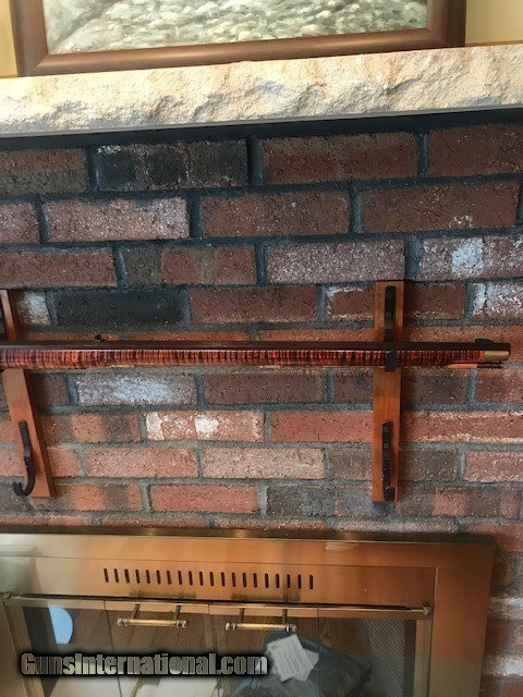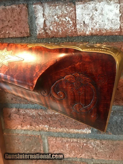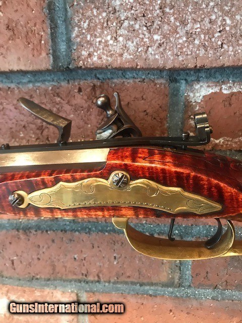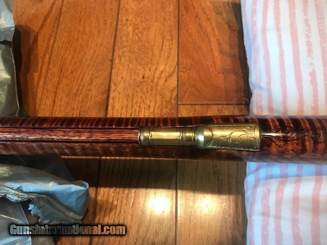 Description: Fine contemporary .50 cal flintlock rifle by C D Rinker with incised carved highly figured maple stock and finely engraved brass componets. Its pleasure to hold and points well with it 32" octagun barrel with a unique rear peep site aims like a dream. The rifle has a lage siler flintlock with proper well positioned vent hole for super fast ignition. The photos speaks for them selves. This rifle has the WOW factor. I am a reluctant seller but have to do what is I have to do and hope it goes to a good home and that it will be well taken care of. The rifle is mint and as in new condition. Wiil be shipped in a wooden box for safety flat rate 85.00. SOLD |