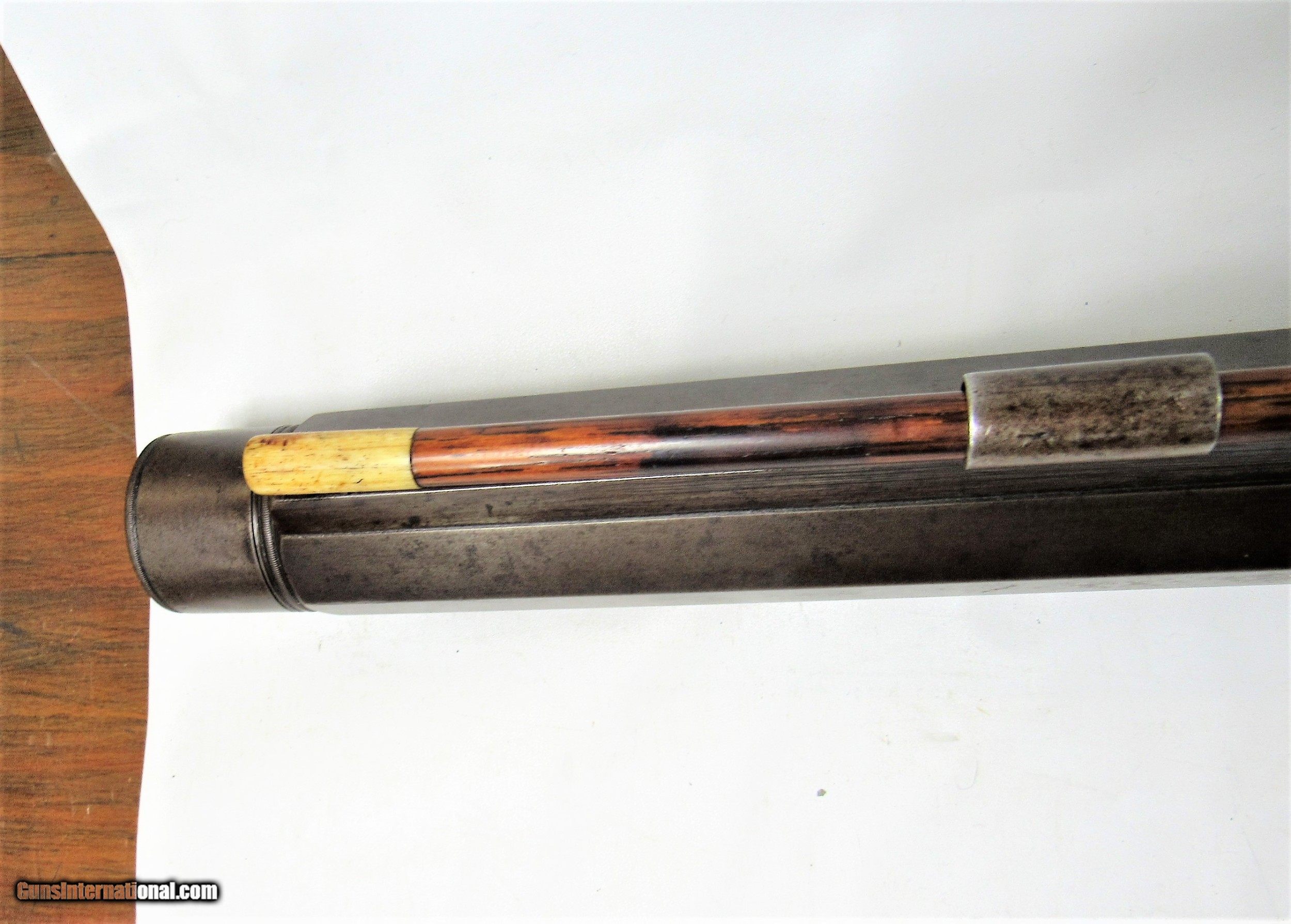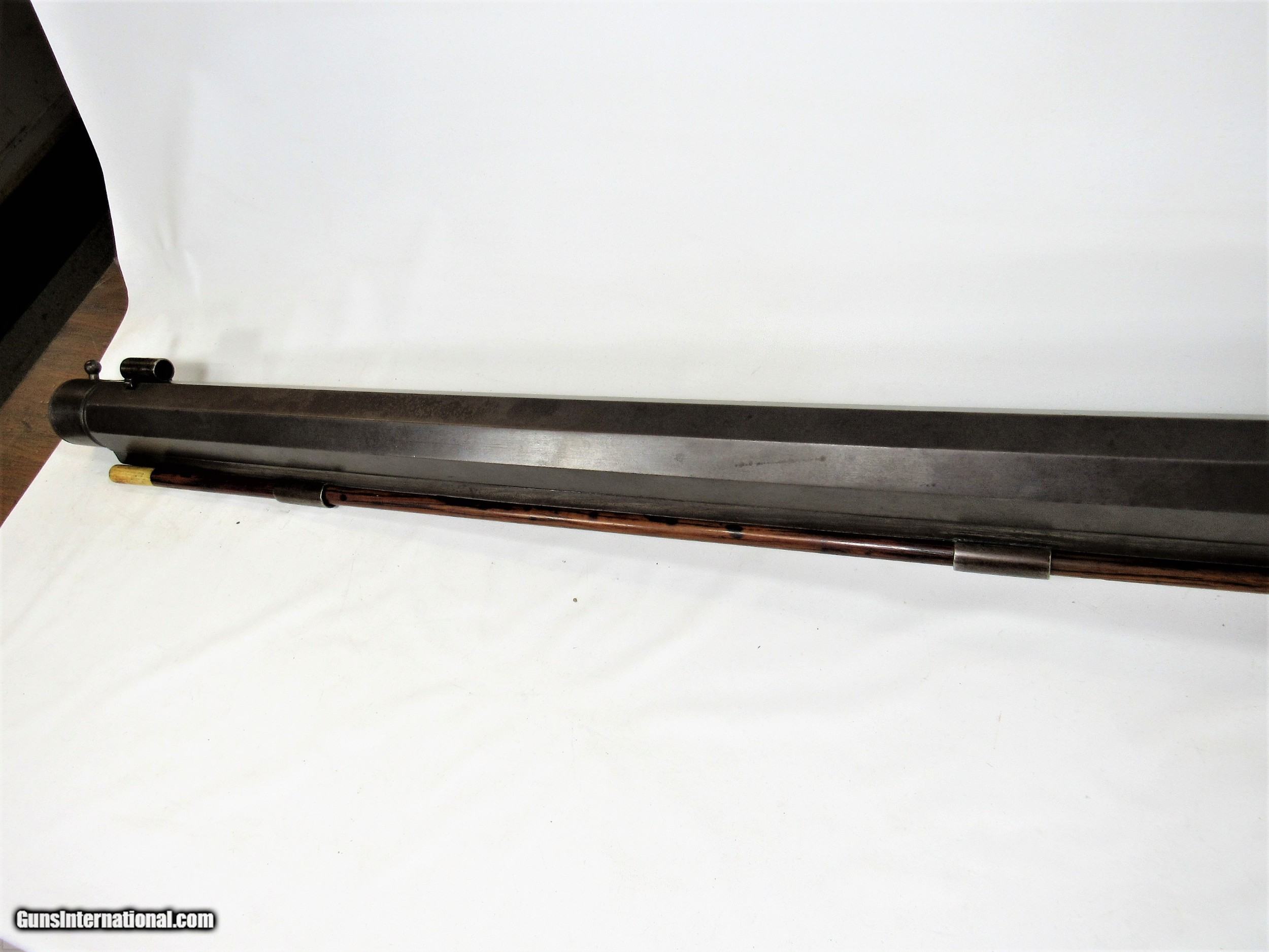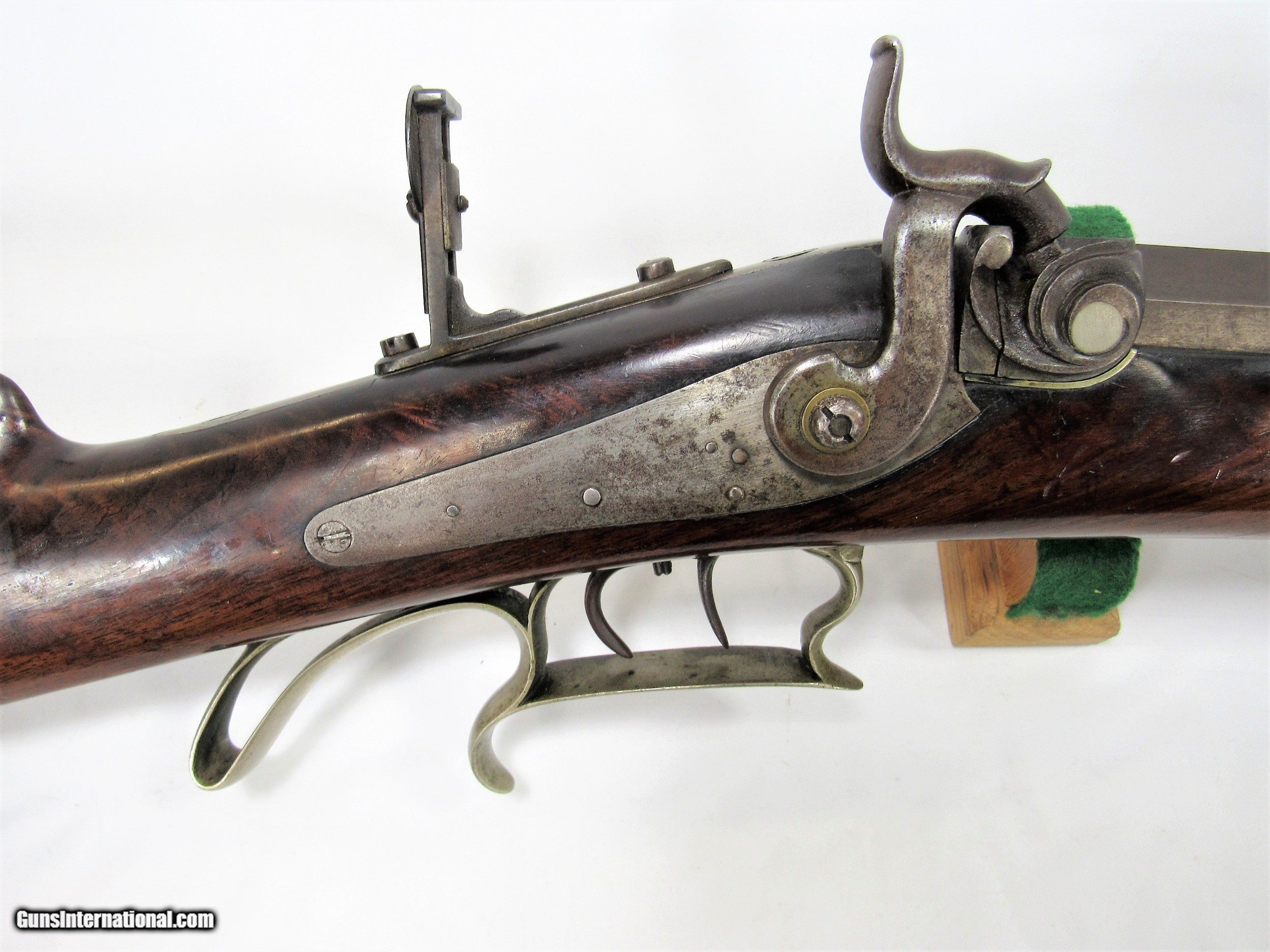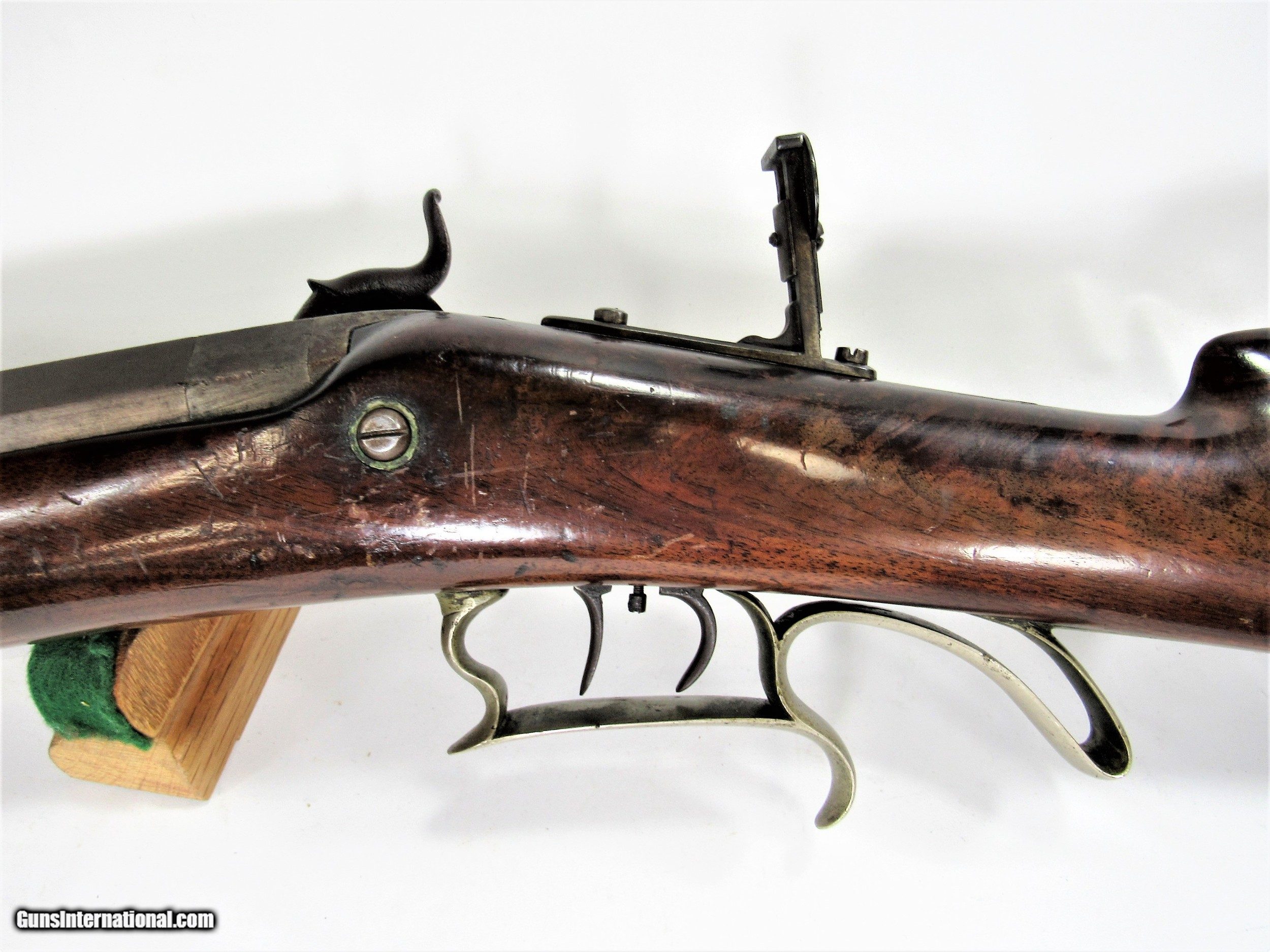 Description: PH HOWE PERCUSSION TARGET RIFLE 40 CAL 33” WITH FALSE MUZZLE FOR LOADING. CLEAN BORE, TANG SIGHT, GLOBE FRONT SIGHT WITH GERMAN SILVER PLATED CAP, TRIGGER GUARD, PATCH BOX AND BUTT PLATE. DOUBLE SET TRIGGERS. NICE WOOD. SOLD |
