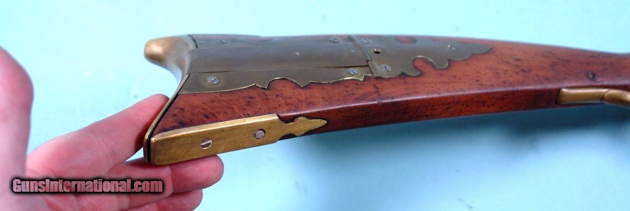 Description: PRE-CONTEMPORARY TENNESSEE FLINTLOCK LONGRIFLE BY ROYLAND SOUTHGATE CIRCA 1940’S-50’S. 57” overall with antique circa 1820’s-30’s original 41” octagon .36 cal. rifled barrel signed on top flat “L.R.” in crude block letters. Southgate lock, maple stock and brass patchbox and mounts. Signed in script “R. SOUTHGATE” on patchbox lid spring. Nice very good plus condition overall with the barrel having old pitting dating to the original period of use. Very probably a restoration project by Southgate for a customer who wanted his ancestral rifle restocked. The fact it does not bear the usual Southgate serial number also gives credence to this hypothesis. Stock and mounts properly aged to look original. Southgate is considered to be a pre-contemporary Tennessee longrifle maker and his rifles are highly regarded by collectors. $1500. SOLD Handgun Caliber: .36 |