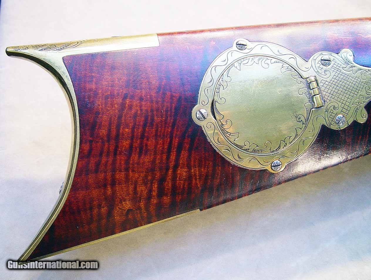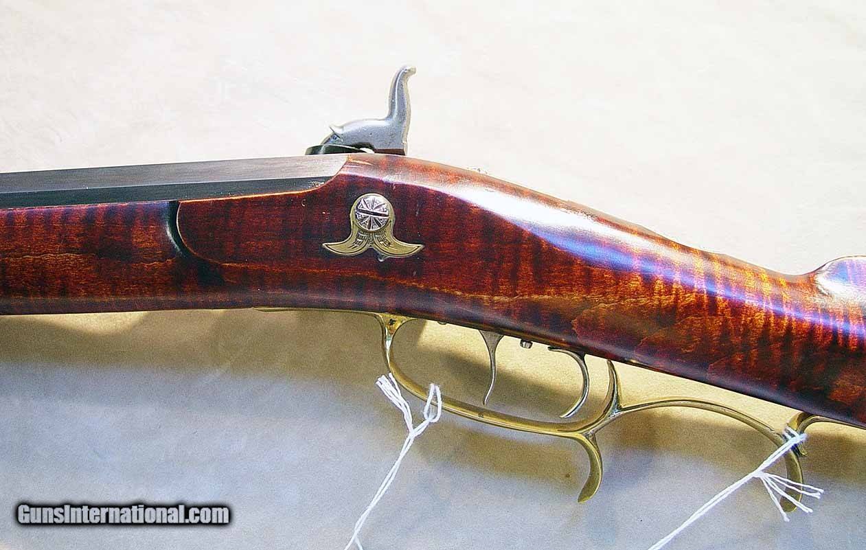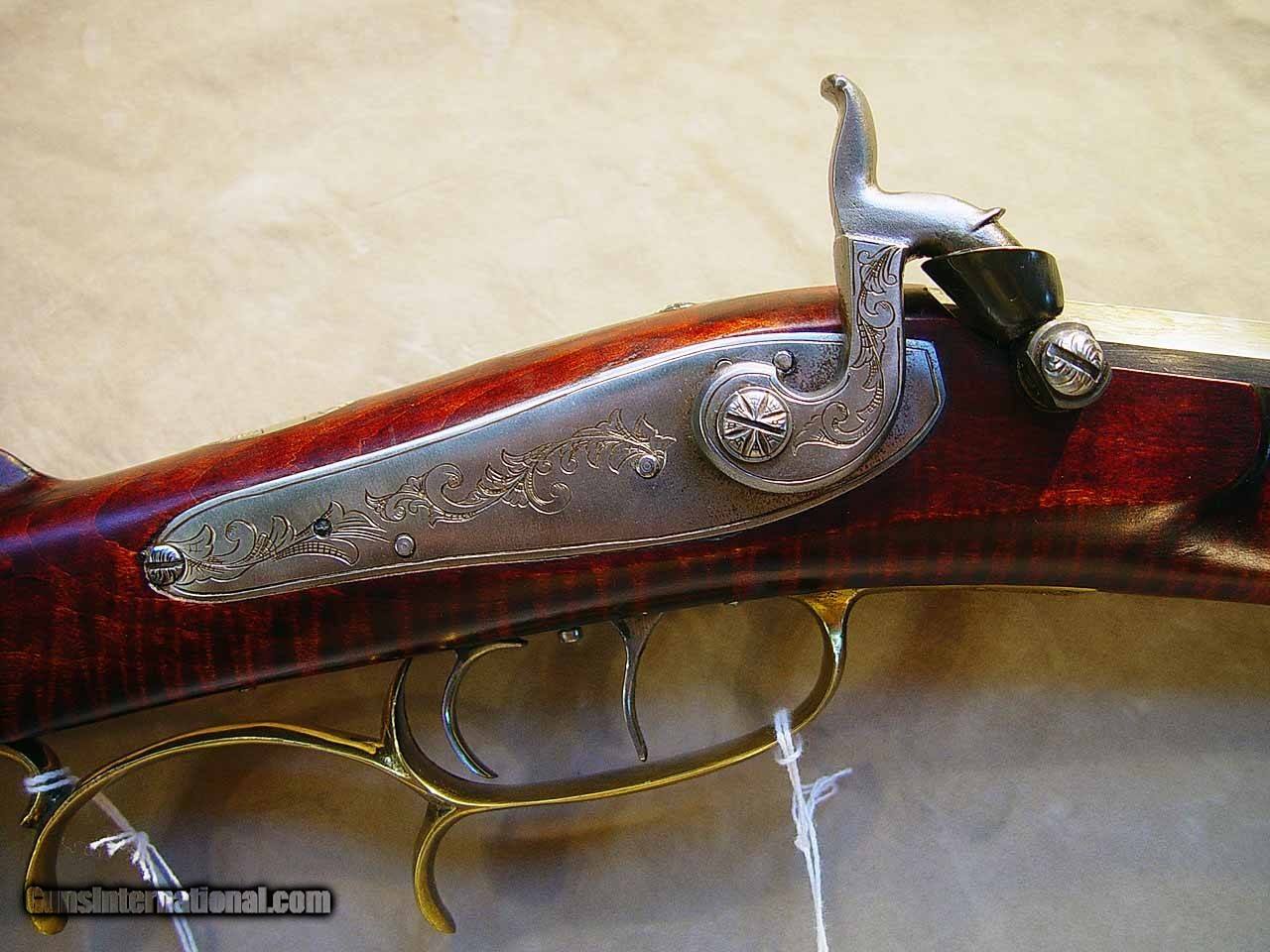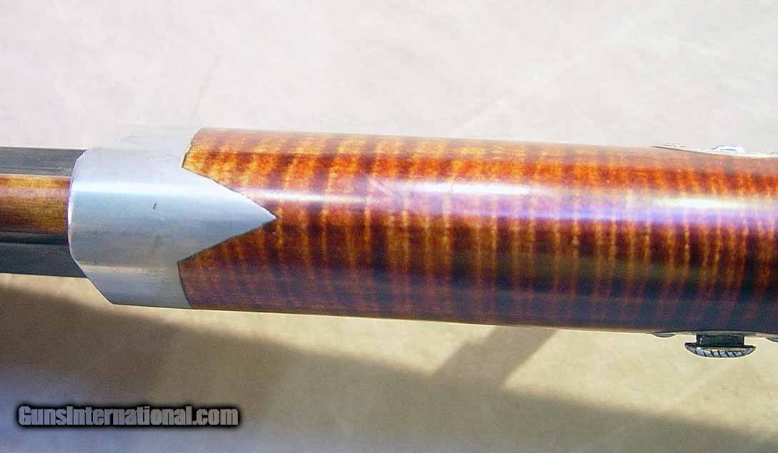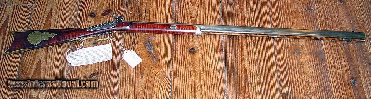 Description: Offered is a magnificient example of a Stephen O'Dell Natchez Rifle custom made by Matt Avance. This fine replica rifle is in like new condition, although it has been fired a few times. The gun has beautiful brass furniture with poured nose cap all of which are nicely engraved, a percussion L & R backaction lock, super premium Maple stock, Davis #6 triggers and has a 13 1/2 inch LOP. Rifle is signed on the top of the aged barrel. SOLD Rifle Caliber: .45 Manufacturer: Matt Avance Model: O'Dell Natchez Rifle Barrel Length: 36 Condition: Like New Metal Condition: Excellent Wood Condition: Excellent Bore Condition: Excellent Triggers: Davis #6 LOP: 13 1/2 inches |