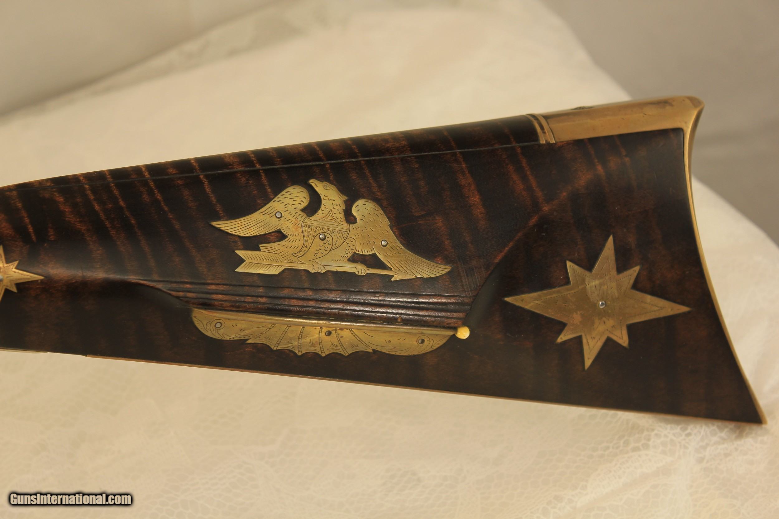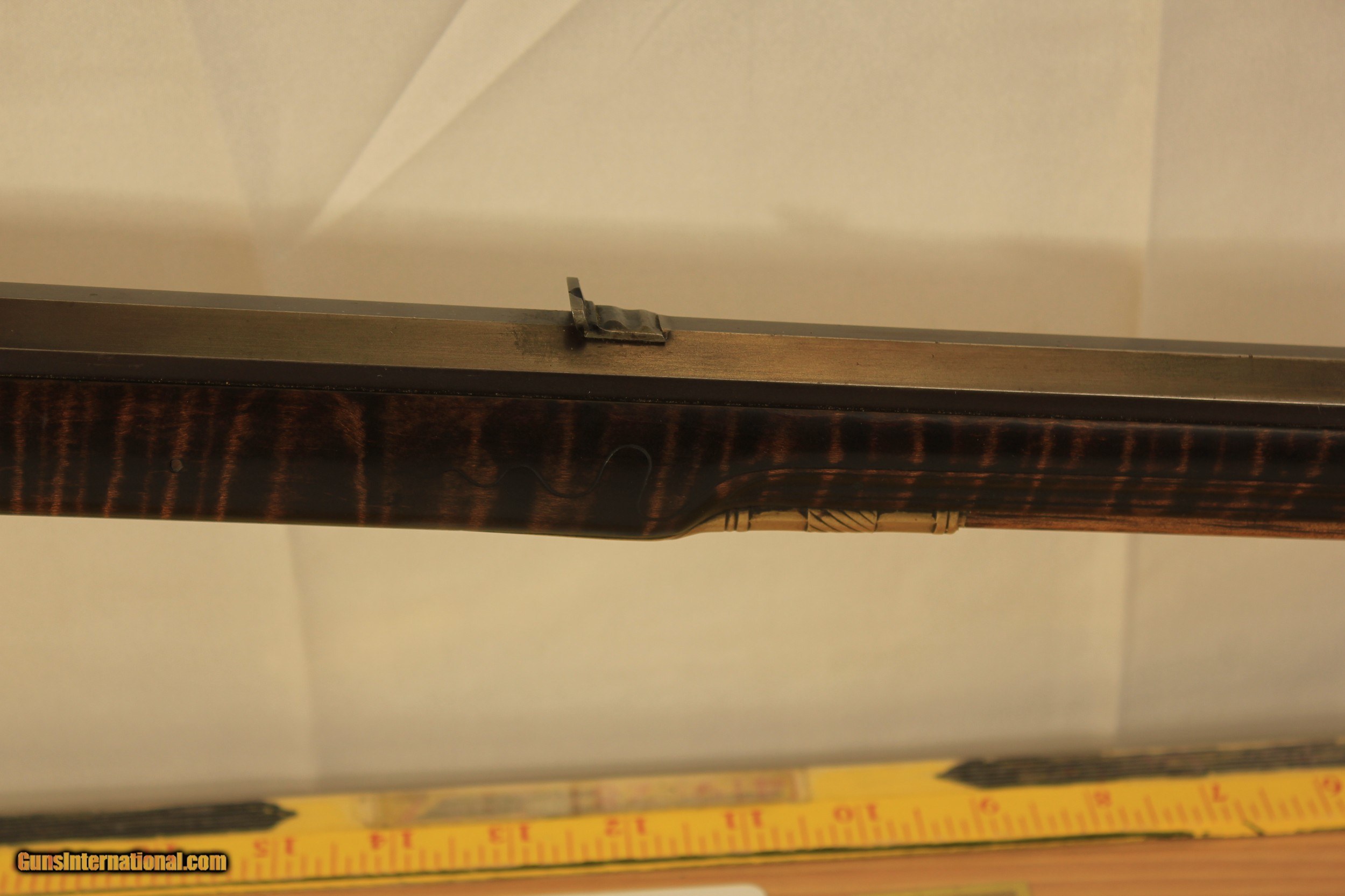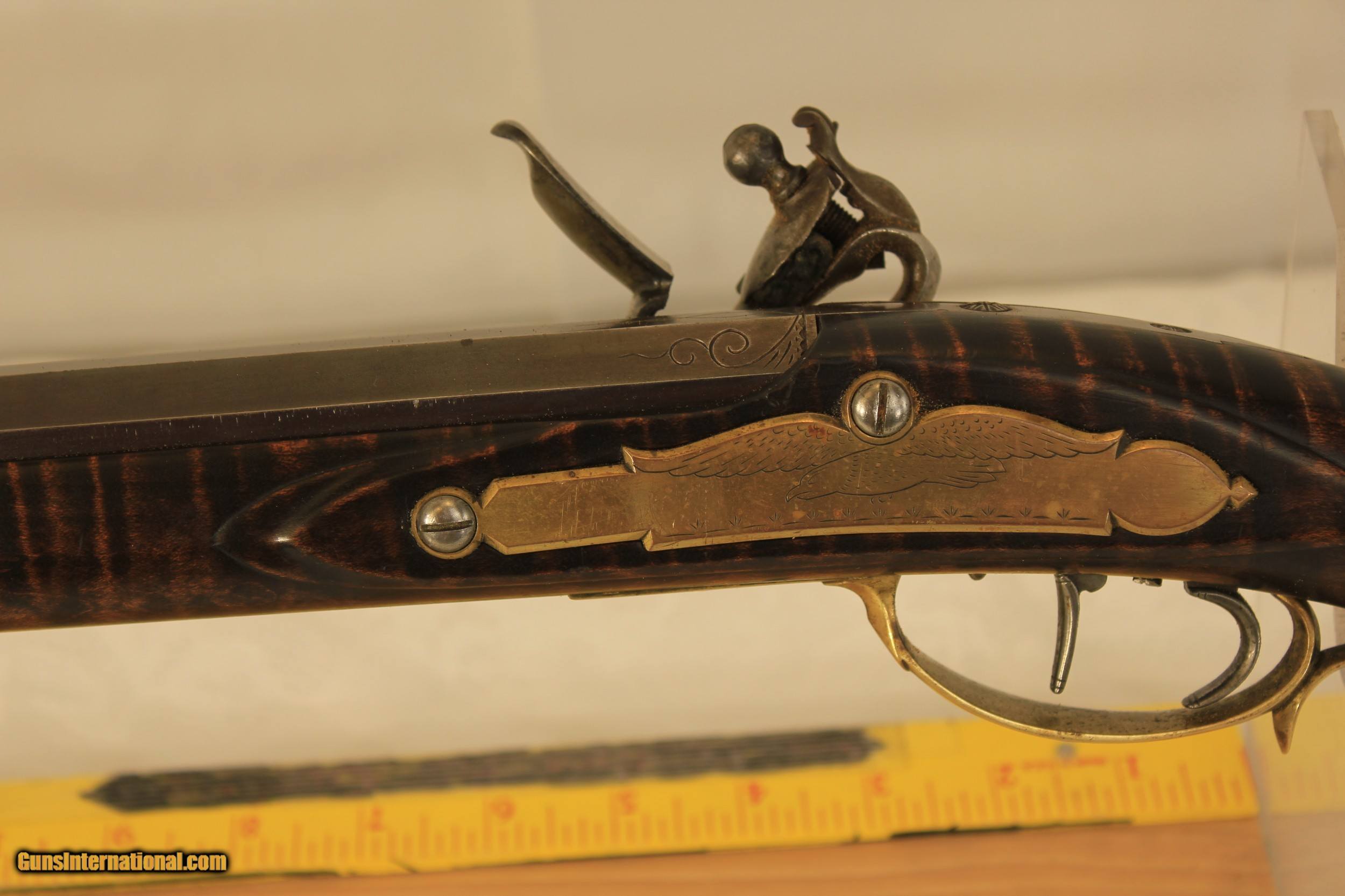 Description: This is a hand built from scratch Vogler style rifle made by Western NC gunmaker Robert (Bob) Ray. The well figured curly maple stock has an aqua fortis stain and a hand rubbed oil finish. It has a L&R Durs Egg lock. The double set triggers were hand made and engraved by Bob. The barrel is a 42 inch swamped barrel made by Rice Barrels. All inlays are hand made and engraved by Bob in the Vogler style. The inlay below the cheek piece contains a vent pick. Everything about this rifle is in the Vogler style. The bore is as new. The barrel measures 1 inch at the breech and .830 at the muzzle. It weighs 8 pounds and 9.6 ounces and has a 14 1/4 inch pull. It was made in 1985 and has been Bob's personal gun since. The Vogler's were gun makers in Salem, NC in the early 1800's and made rifles in smaller calibers as all of the big game had been killed off by that time. It is rare to find a NC gun in a caliber larger than .45, most being in the .30 caliber range or even in as small as .25 caliber. Robert Ray is a former lock maker and rifle class instructor for Jim Chambers Flintlock, Ltd. He has also made guns for Colonial Williamsburg in VA. This is an outstanding example of guns made several hundred years ago in the south. $75.00 shipping via Priority Mail SOLD Antique: Yes |