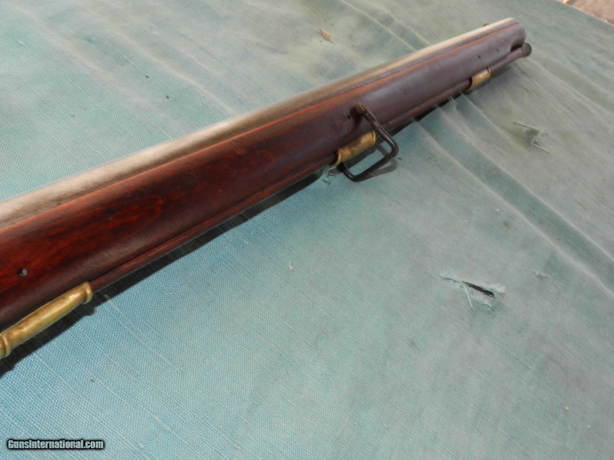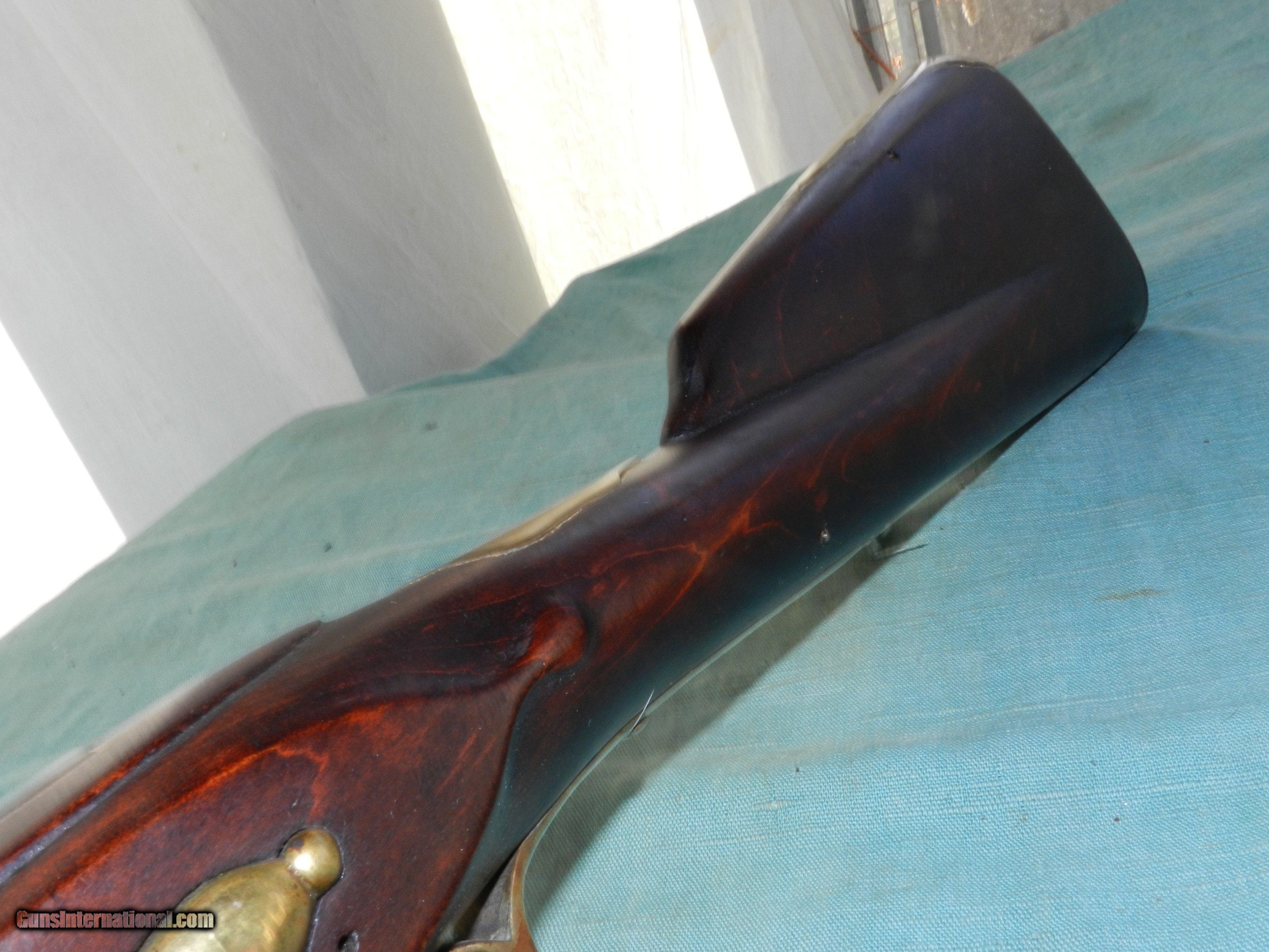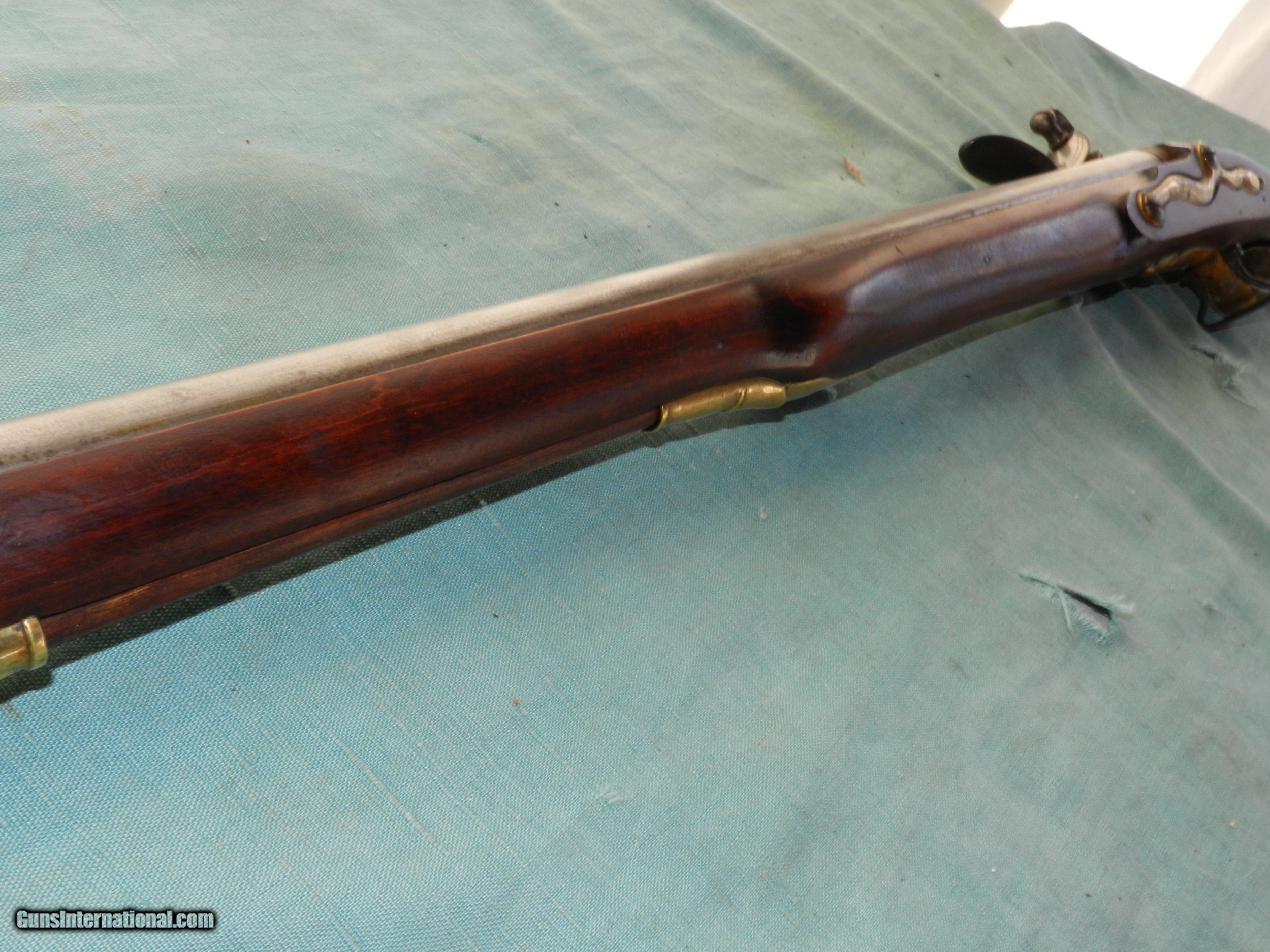Description: SOLD With a .75 cal., 36” barrel with a partially bright about fine bore showing some scattered light oxidation. This interesting reproduction Brown Bess appears to be a blend of a 1756 Pattern Long Land musket and 1757 Pattern Horseman’s carbine as depicted on page 264 of Moller’s American Military Shoulder Arms Vol. I. The barrel and lock are toning to a gray patina with softened light pitting around the breech and on the center of the lockplate along with scattered spots of light oxidation. The Long Land pattern brass mountings are toning to a bright goldenrod patina with some scattered spots of light tarnish and a few light handling marks. The lock, which was likely made by Pedersoli in the 1970s, is marked “STOWE / 1756” behind the swan-neck cock while a “(crown) / GR” is ahead and it features a removable flash guard. The hardwood stock rates fine, and a few scattered light handling marks. The sling swivels, brass-tipped hardwood ramrod and bayonet stud are intact, and the action appears to function well mechanically. Most likely made by Pedersoli. Still an unusal gun to find.When buying a gun always have it examined by a competent gunsmith before shooting. To buy a gun from me you must get a direct email for me, with details, and shipping cost. We don’t have a web site .I prefer money orders or a check. Item ships when funds come in. I try to keep guns affordable, which means I make less money than most dealers. You won’t get altitude sickness, or nose bleed, with my prices! I consistently have the best selection of older guns If you attempt to buy, you must still contact us for details . Best to email to buy. Sometimes a local person can stop buy and purchase before the gun is removed. Sometimes not home to get calls. Some guns are required shipment to a gun dealer near you for a transfer to you when it arrives. Otherwise many older or black powder guns ship to your door. With the widest selection of older guns at great prices, We don’t have a store, and sell on the internet only. I’m easy to get along with. Thank You SOLD |