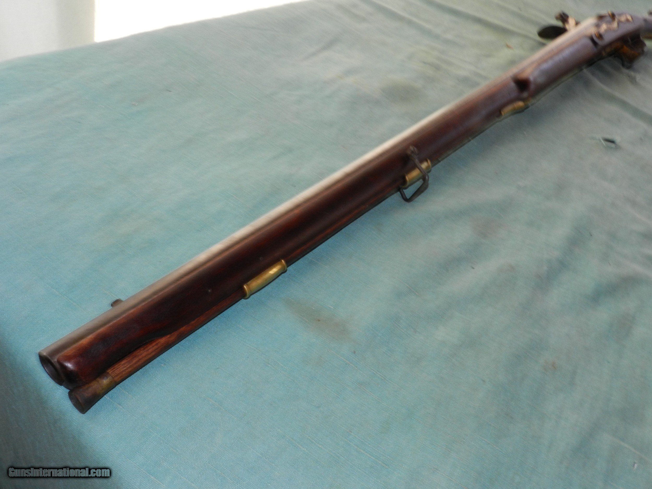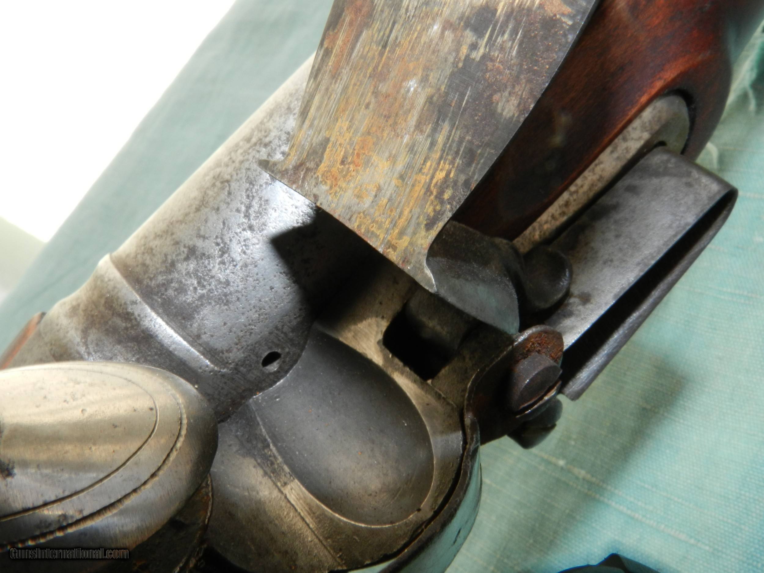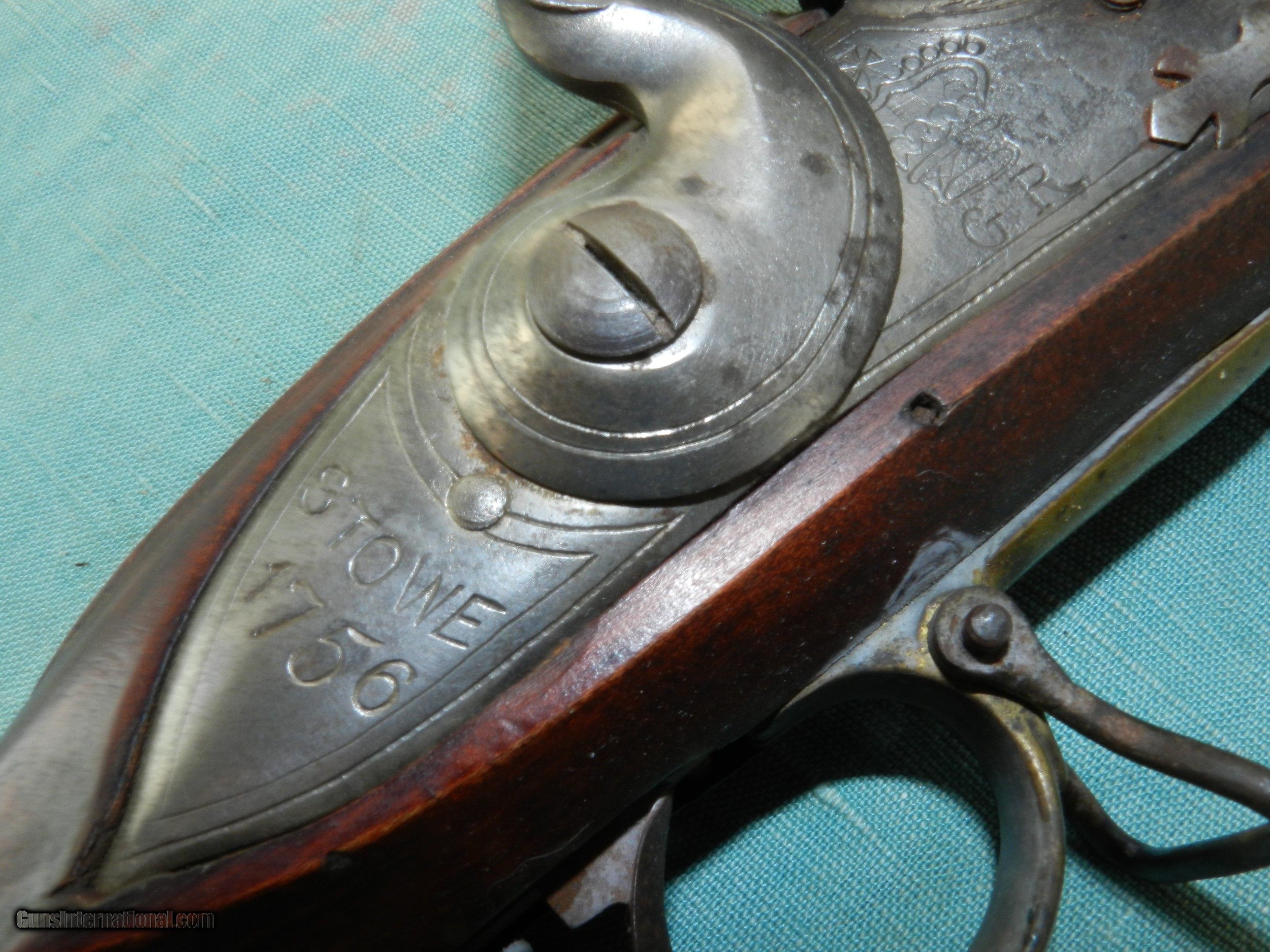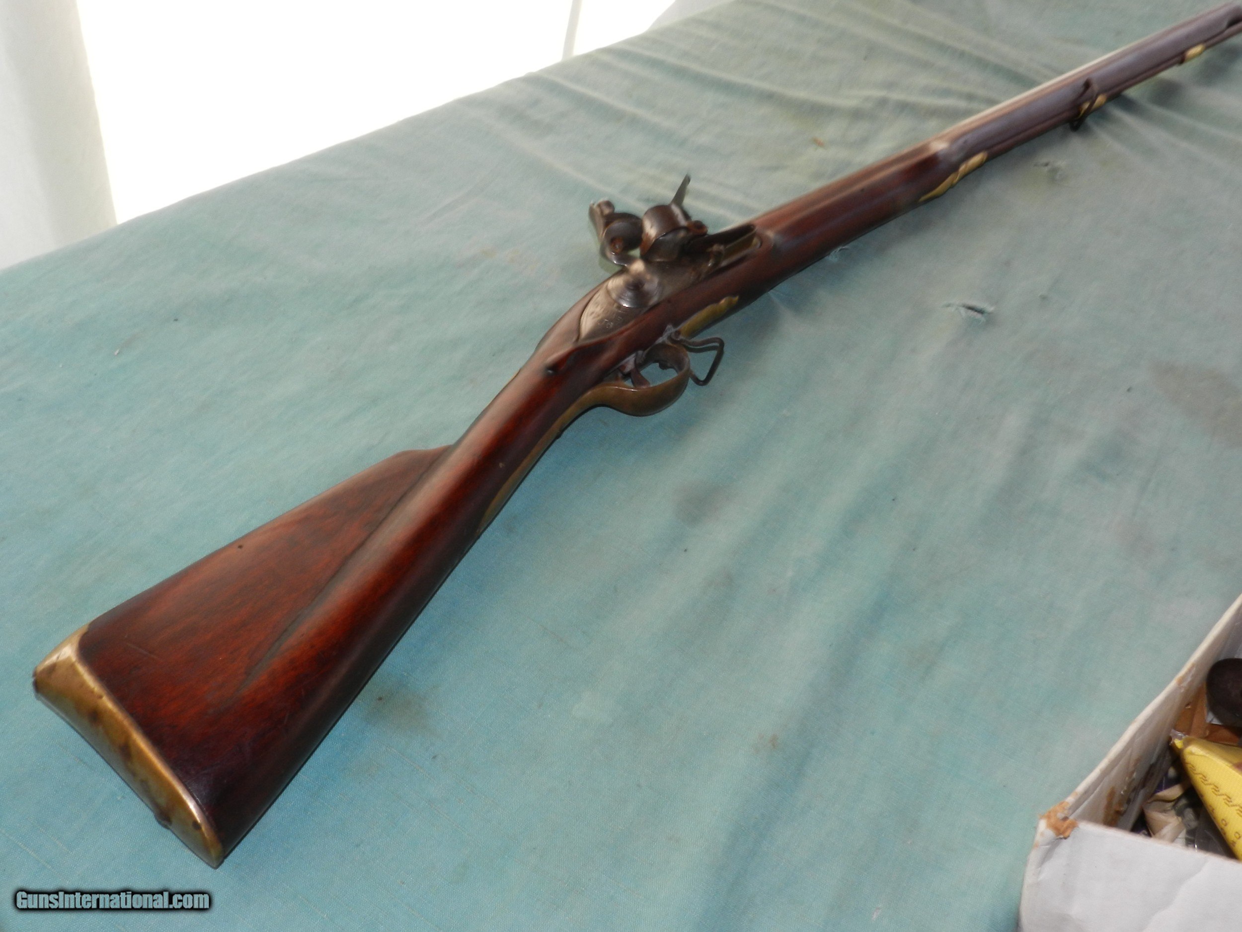 Description: SOLD With a .75 cal., 36” barrel with a partially bright about fine bore showing some scattered light oxidation. This interesting reproduction Brown Bess appears to be a blend of a 1756 Pattern Long Land musket and 1757 Pattern Horseman’s carbine as depicted on page 264 of Moller’s American Military Shoulder Arms Vol. I. The barrel and lock are toning to a gray patina with softened light pitting around the breech and on the center of the lockplate along with scattered spots of light oxidation. The Long Land pattern brass mountings are toning to a bright goldenrod patina with some scattered spots of light tarnish and a few light handling marks. The lock, which was likely made by Pedersoli in the 1970s, is marked “STOWE / 1756” behind the swan-neck cock while a “(crown) / GR” is ahead and it features a removable flash guard. The hardwood stock rates fine, and a few scattered light handling marks. The sling swivels, brass-tipped hardwood ramrod and bayonet stud are intact, and the action appears to function well mechanically. Most likely made by Pedersoli. Still an unusal gun to find.When buying a gun always have it examined by a competent gunsmith before shooting. To buy a gun from me you must get a direct email for me, with details, and shipping cost. We don’t have a web site .I prefer money orders or a check. Item ships when funds come in. I try to keep guns affordable, which means I make less money than most dealers. You won’t get altitude sickness, or nose bleed, with my prices! I consistently have the best selection of older guns If you attempt to buy, you must still contact us for details . Best to email to buy. Sometimes a local person can stop buy and purchase before the gun is removed. Sometimes not home to get calls. Some guns are required shipment to a gun dealer near you for a transfer to you when it arrives. Otherwise many older or black powder guns ship to your door. With the widest selection of older guns at great prices, We don’t have a store, and sell on the internet only. I’m easy to get along with. Thank You SOLD |