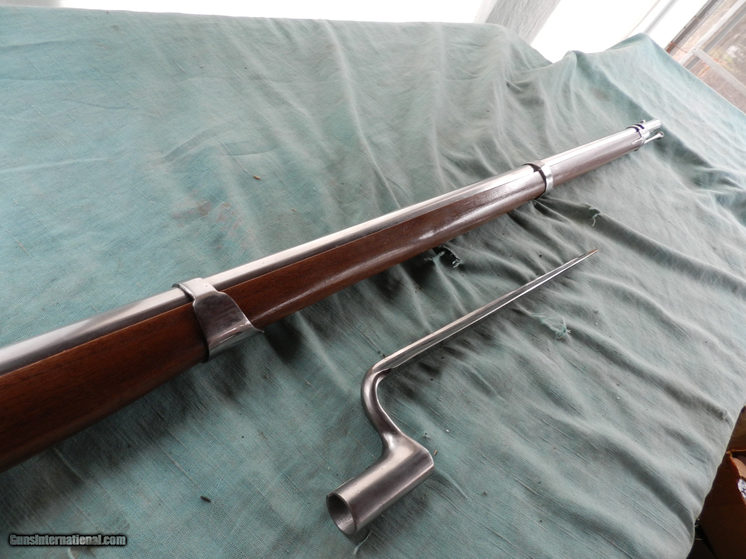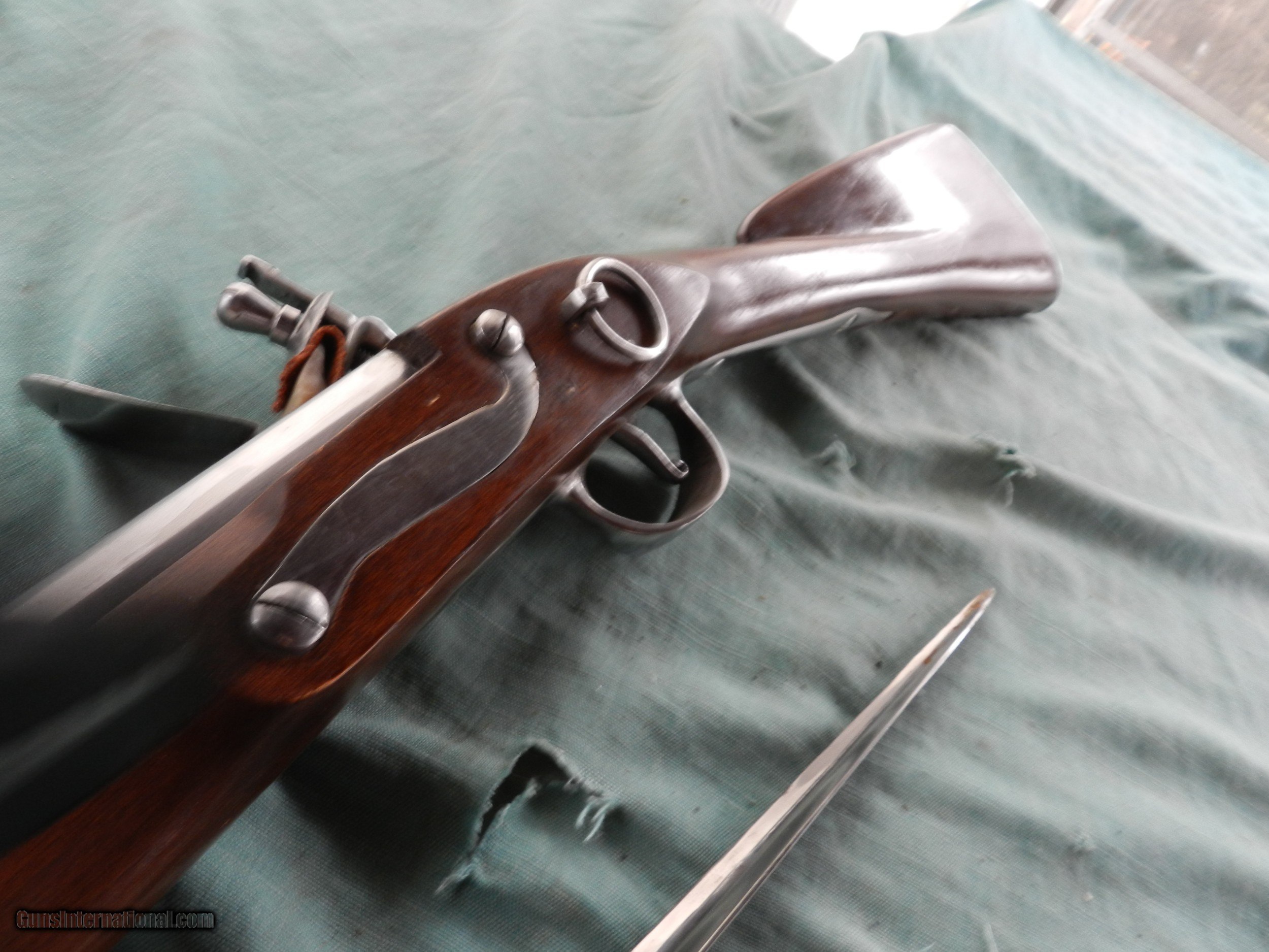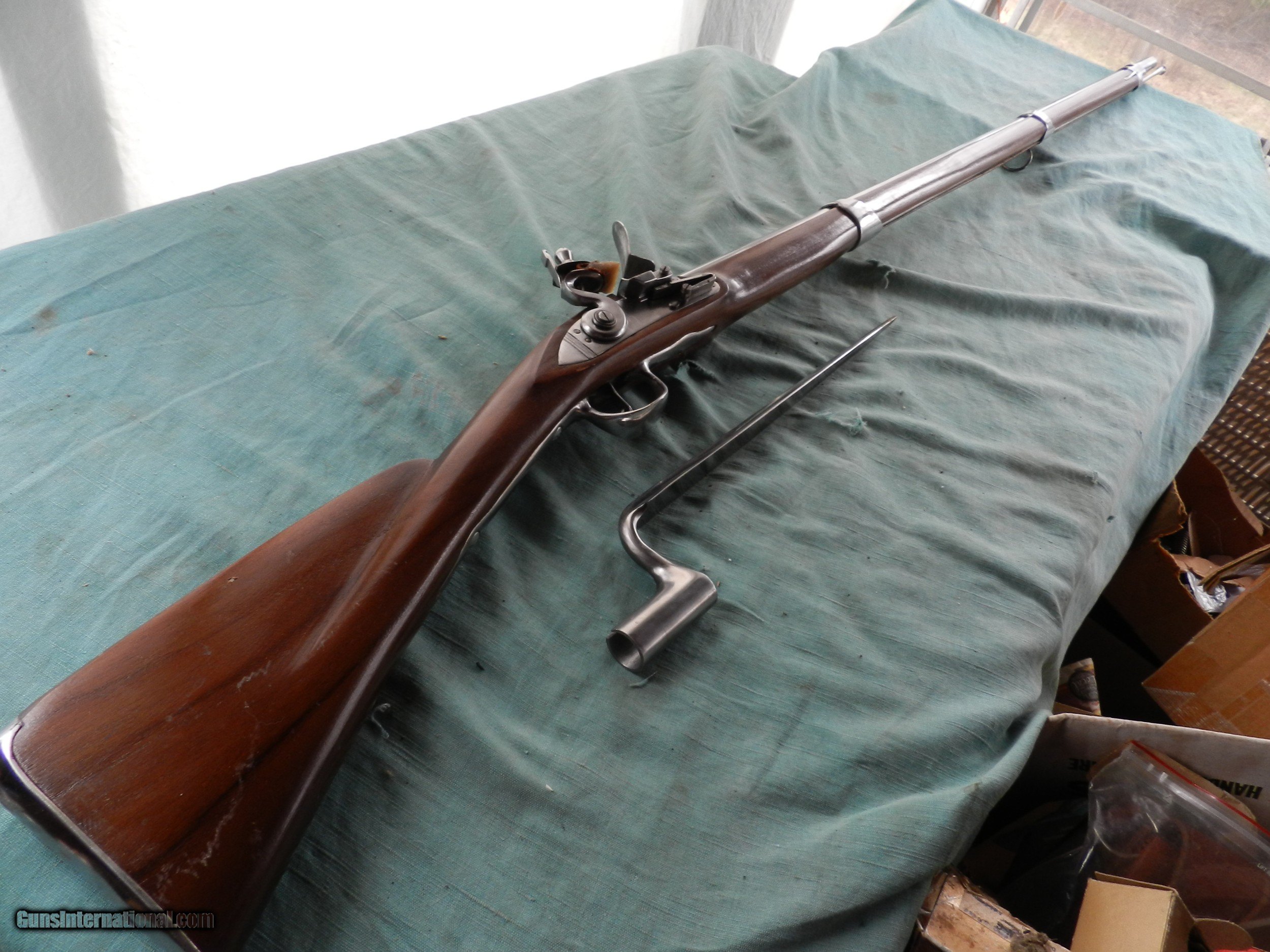Description: The early 18th century brought a flurry of developments in French musketry. A standardized model was finally established in 1717, and improved model 1728 which this is a very good , quality made copy.. However the abundance of Marine models, and Contract Fusil de Chasse in North America relegated the 1717, and the 1728 musket to a life in France's forces stationed in Europe. The 1717 was replaced eleven years in 1728 with a model using three barrel bands to hold its 46 3/4 inch barrel in place. at .68 caliber This musket is a fine example of the elegant curves in musket stocks in the early 18th century. Note the special shape of the butt, commonly referred to as the "patte de vache" or cow's foot.The 1728 musket was the musket carried by the majority of French troops during the French and Indian War (see images of the Compagnies Franche de la Marine and the Regiment de Bearn). Changes in the 1740s included the standardized use of a steel ramrod in 1743. By the French and Indian War it is highly unlikely wooden rammers were in use. There were three arsenals making the 1728 models: Charleville, Maubeuge, and St. Etienne. St. Etienne was the largest producer and because of this the 1728 is often called the St. Etienne musket. It was St. Etienne that provided the bulk of the arms to the Navy for the Compagnies Franche de la Marine in the late 1740s. These arms most likely had the 1746 changes since they were acquired directly from the arsenal in 1748.However this did not end the use of the 1728 model in North America. A new army had immerged in the 1770s with a dire need for arms. The Continental Army of the United States was more than happy to purchase the old arms of France to assist them in their struggle against Great Britain. As well it is possible captured stores in New France were re-issued to Quebec's militia to defend themselves from the invading Americans in 1775-1776, or fell into American hands after the fall of Montreal. This fine modern made firing model has the frizzen hardened and a correct flint, and produces a shower of sparks, and was test fired.The4 6 1/2" smooth bore is very clean and chambers the .68cal bal. The metal is in the white as issued. A rugged, finely made Musket for your re-enacting use. Comes with a well fitting bayonet. When buying a gun always have it examined by a competent gunsmith before shooting. To buy a gun from me you must get a direct email for me, with details, and shipping cost. We don’t have a web site .I prefer money orders or a check. Item ships when funds come in. I try to keep guns affordable, which means I make less money than most dealers. You won’t get altitude sickness, or nose bleed, with my prices! I consistently have the best selection of older guns If you attempt to buy, you must still contact us for details . Best to email to buy. Sometimes a local person can stop buy and purchase before the gun is removed. Sometimes not home to get calls. Some guns are required shipment to a gun dealer near you for a transfer to you when it arrives. Otherwise many older or black powder guns ship to your door. With the widest selection of older guns at great prices, We don’t have a store, and sell on the internet only. I’m easy to get along with. Thank You SOLD |