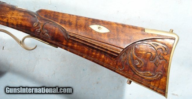 Description: VERY FINE RICHARD FEOLA (STUDENT OF WALLACE GUSLER) CONTEMPORARY PENNSYLVANIA OR KENTUCKY FLINTLOCK RELIEF CARVED .45 CAL LONGRIFLE OR LONG RIFLE. Signed on top of barrel “R.T. Feola – 1985-1990”, obviously the time period it took him to complete rifle which is understandable considering how much effort and care was taken. Heavy relief carving throughout with ornate cheekpiece and bone inlays. One bone inlay is the escutcheon plate on top of wrist with an “F” for Feola. Richard Feola was a student of Wallace Gusler of Williamsburg fame. 36” octagonal barrel with mint bore and 8 groove rifling. Hand forged rear sight and iron and brass front half-blade with white insert sandwiched in between two iron blades(intricate). Tiger maple stock with brass hardware and brass sling swivels. Ornate hand made brass patchbox with release button on top of buttplate and brass toe plate with rear sling swivel. Touchhole with removable sleeve/insert (slotted for easy removal). Single trigger. Dimensions are more along the lines of a slightly scaled down Pa. longrifle with 50 ½” overall length, 13 5/8” length of pull weighing 7lbs so possibly for a lady or youth or just a small brush gun. Make a fun white-tail flintlock. All metal rust browned except trigger spine and frizzen spring. SOLD |