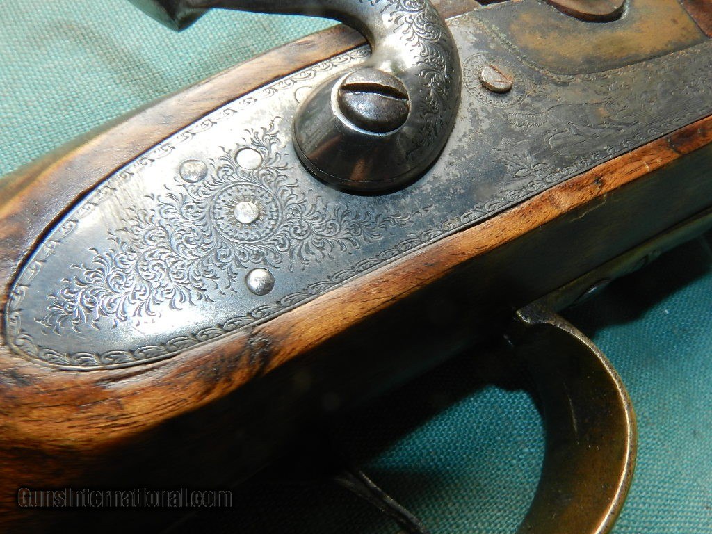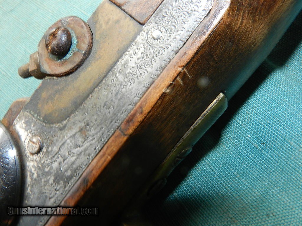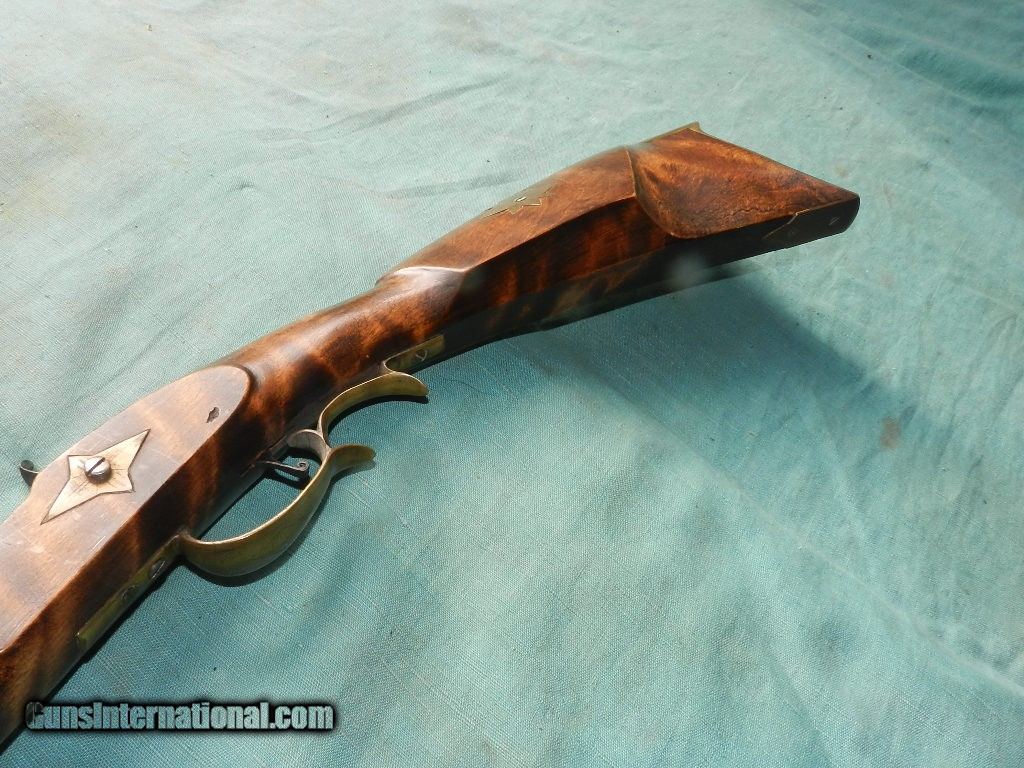 Description: A fine tiger grain hardwood percussion .48cl. rifle with interesting appointments, About .48 cal., 32” octagon barrel with a lightly oxidized, about good bore. The barrel is a soft plum brown patina with pewter undertones, simple blade and fixed flat top rear sight and oxidation around the nipple bolster. A more modern muzzleloader made by a craftsman, the lockplate is from a percussion shotgun and marked “W & C Scott & Son” showing tight English bank note scroll chisel engraving, with a game bird and dog scene and is a silvery patina. All of the brass hardware is a dull goldenrod patina and shows some very engraving on the patch box. The stock actually appears to be a curly grade of birch rather than maple, but may indeed be some manner of maple, it is well constructed with generous proportions and slightly interesting features. There is no half-cock rest, the nipple skirt is chipped, but doesn't effect shooting , the trigger has an early feature, where it must be manually reset for the arm to cock and a tiger striped ramrod is included. Overall a very unusual crafted unique rifle, rhat shows up well.Check my inventory for unusual and rare gun parts and other items. I work hard to find unusual items, and try to keep the price affordable. My descriptions are what I see, good , bad, ugly, etc. when listing. Rarely do I miss something in listing. If you buy and item and are not satisfied let me know immediately rather than leave negative feedback, we can come to some arrangement that will make you happy. I describe items to the best of my ability, however, sometimes it’s a good guess, as I don’t take things apart and sell, I find huge quantities of stuff from other people, not described by them. I think that several photos and several measurements should work for you. If you’re not sure an item will fit, best to not buy. All listings have a return privilege. Sometimes I travel for my job and I’m not here for three or four days. I ship as soon as I can but not always immediately. Please be patient. Thank you for having confidence in me and . SOLD |