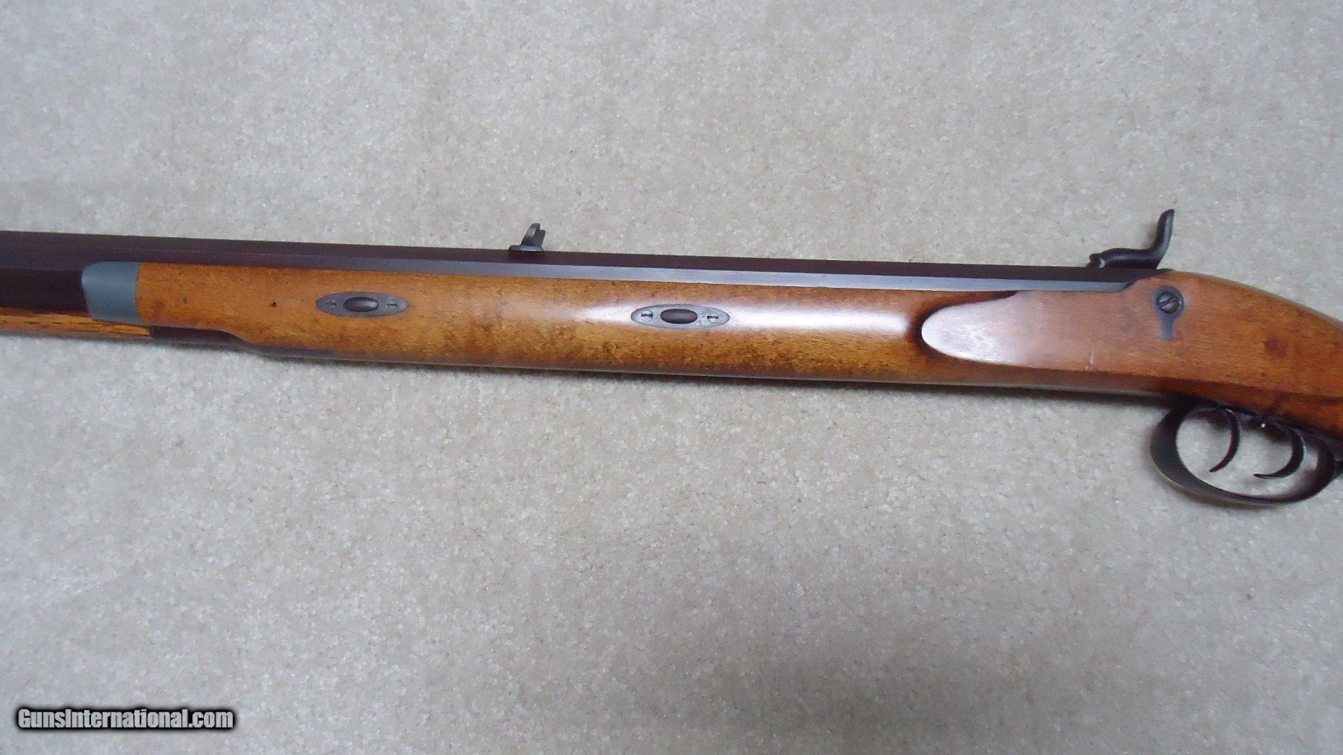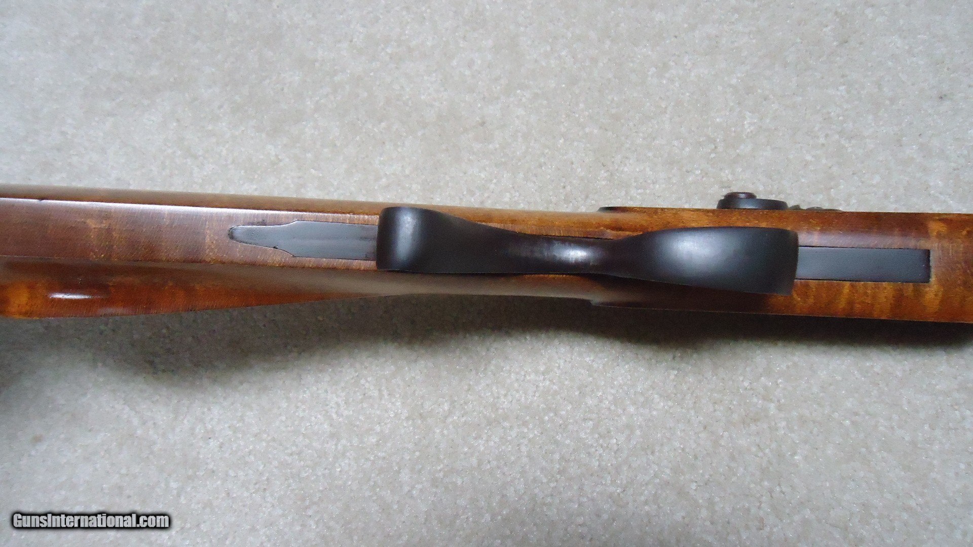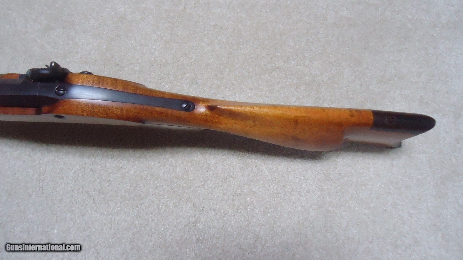 Description: BEAUTIFUL .54 PERCUSSION CUSTOM HAWKEN RIFLE WITH 34" BROWNED BARREL MARKED "SHARON RIFLE BARREL CO. 54 CAL." A beautifully made classic style rifle that appears about new inside and out. Iron mounted with double wedge key forend, double set triggers, traditional drift adjustable buckhorn rear sight with blade front, nicely figured maple stock with cheek piece and original Hawken styleiron trigger guard. Highest quality that would be very expensive to have custom built today. SOLD Antique: Yes Barrel Length: 34" OCT. Condition: LIKE NEW |