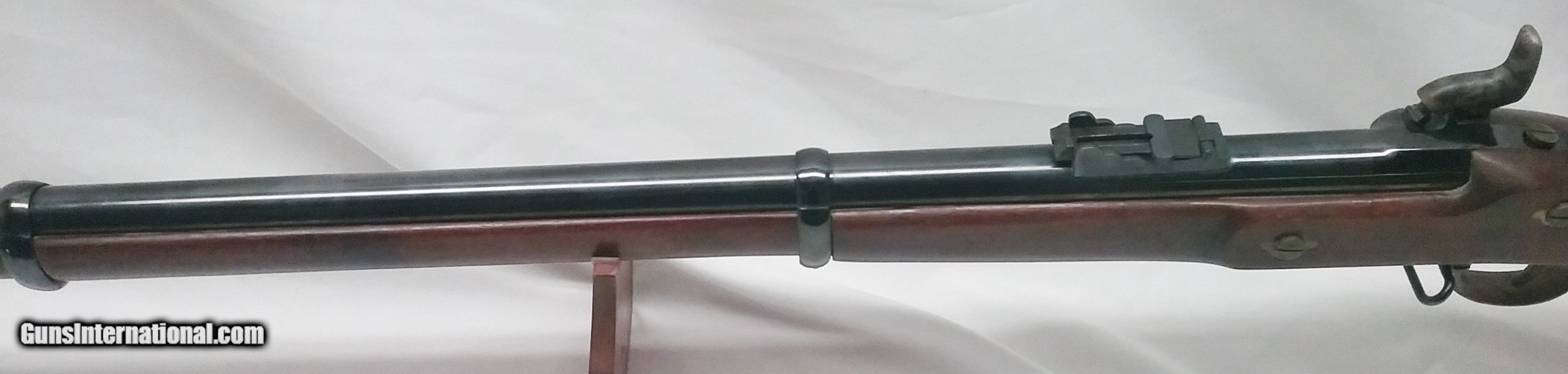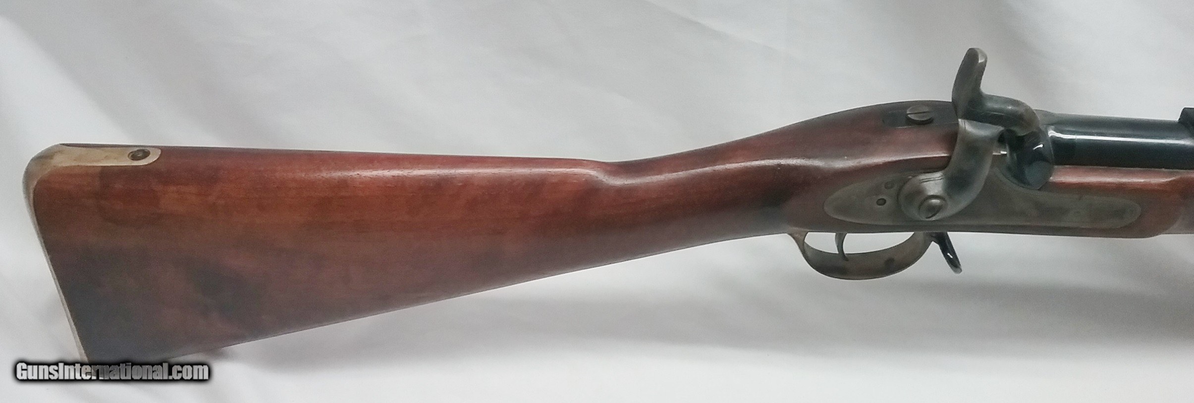 Description: P-31-68 Enfield – 1853 3 Band Musket – 58 cal. - Parkert Hale Stk #P-31-68 This Parker Hale English made .58 caliber Enfield – 1853 – 3 Band Musket has a 38” tapered round 1-1/16” to 3/4” blued barrel with a 1:56” twist and is fitted with an adjustable ladder sight. There is a British proof mark on the top of the barrel and on the tang. The bore is in excellent condition. The large military style color case hardened lock has 1853 Enfield and the British Crown stamped into the plate. This P grade European Walnut is in very good condition with the Parker Hale cartouche on the right side of the butt stock. The stock has minor handling and usage marks. This stock is fitted with mostly brass furniture, except the blued 3 bands, swivels, and the steel ram rod. Overall condition is Very good. Length of pull is 14”, overall length is 55”, and weight is 8.6 lbs. Our stock number is #P-31-68. Will ship to anywhere in the United States, buyer pays freight and insurance. SOLD Rifle Caliber: .58 Manufacturer: Parker Hale Model: Enfield – 1853 – 3 Band Musket Bore: Rifled Chambers: 1 Condition: Very Good Metal Condition: Very Good Wood Condition: Very Good Bore Condition: Excellent Barrels: One Barrel Type: Tapered Round Action: Percussion Triggers: 1 Stock: European Walnut Butt Pad: Metal LOP: 14 Finish: Blued Weight: 8.6 Sights: Adjustable Item Location: OR - Oregon |