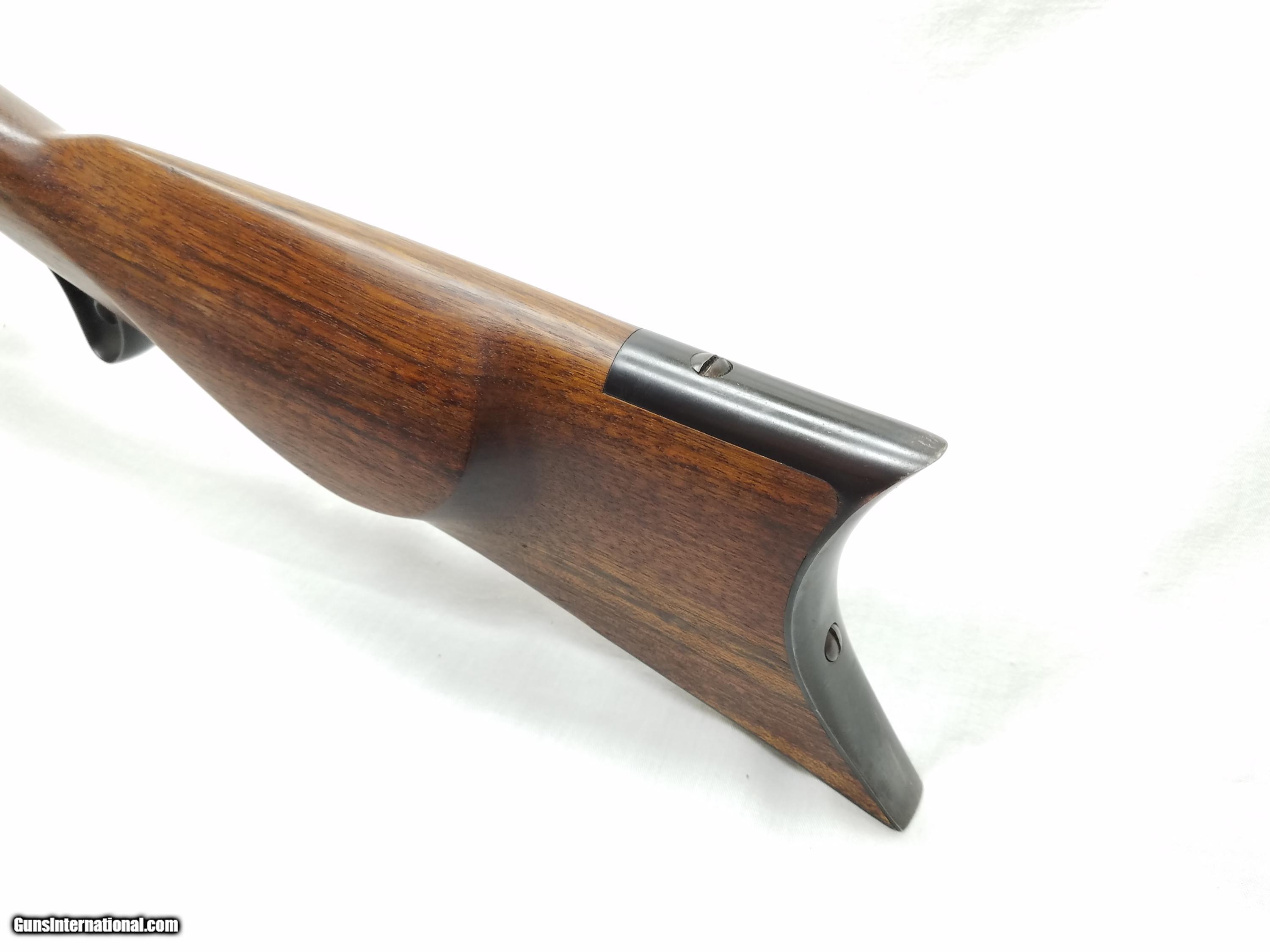 Description: This .50 caliber Great Plains - Percussion rifle has a dark brown octagon 15/16" x 33" barrel with 1:60 twist and a factory adjustable buck horn rear sight and a German silver blade front sight. The P grade European Walnut stock is mounted with dark browned steel furniture. The factory percussion lock is activated by double set triggers. Length of pull is 14", overall length is 50”, and weight is 9 lbs. Please Note: This is a kit that was assembled by a previous owner. The wood ramrod has been custom "candy striped". Factory wood to metal fit - made by Lyman. Condition: Good. Our stock number is #P-22-25. Willing to ship anywhere in the US, buyer pays freight and insurance. SOLD Manufacturer: Lyman Metal Condition: good Wood Condition: good Bore Condition: good Barrel Type: octagonal Action: percussion Triggers: double set Stock: walnut LOP: 14 Finish: blued Weight: 9 lbs |