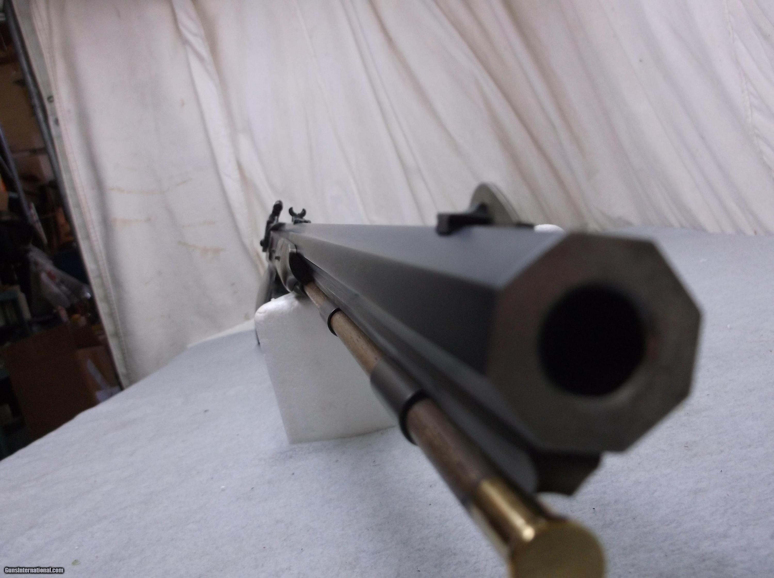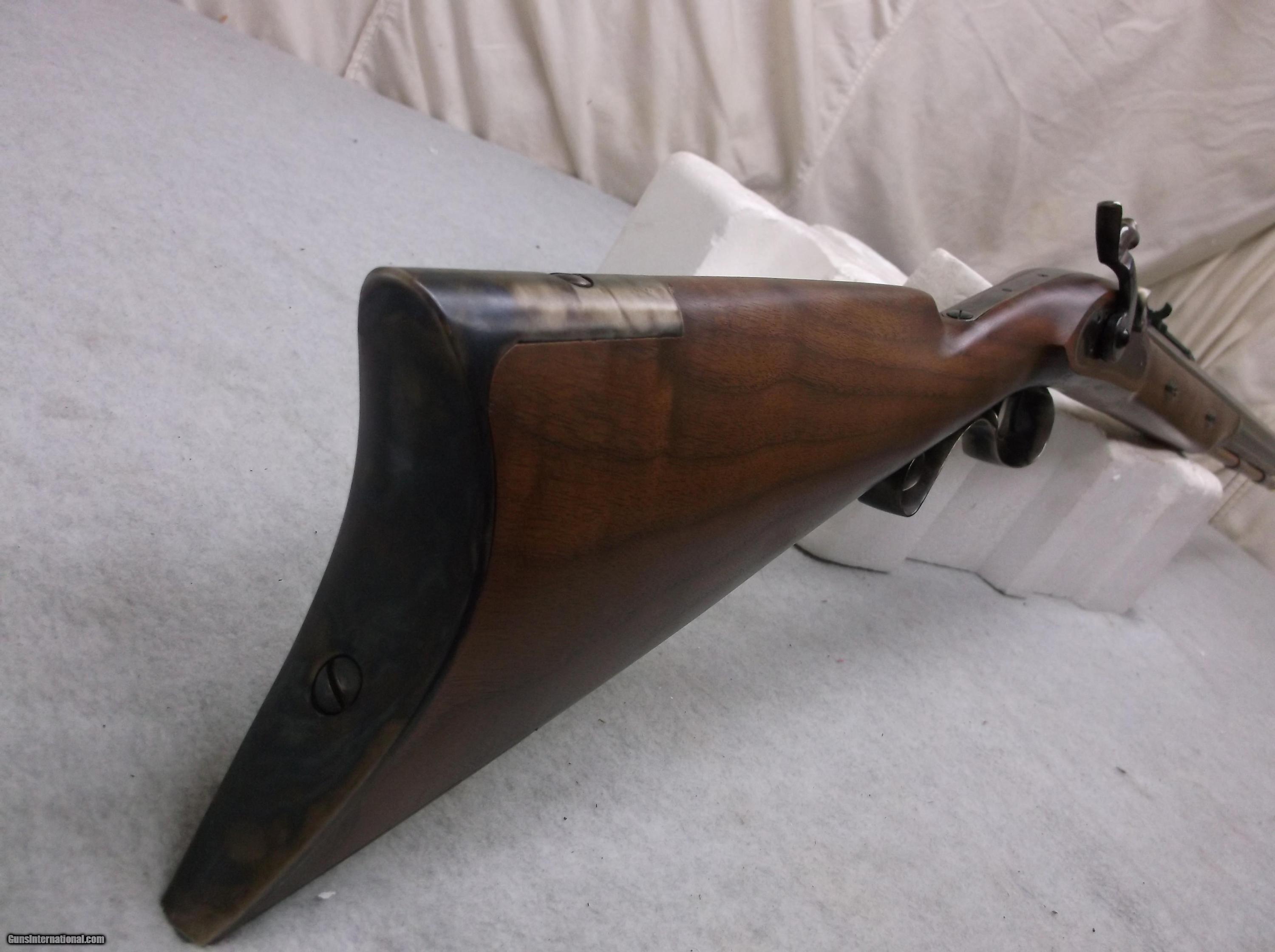 Description: This .50 caliber Missouri River Hawken rifle has a browned octagon 1" x 29-1/2" barrel with 1:24 twist and fitted with an adjustable Gimmer Hawken rear sight. The P grade European Walnut stock is mounted with color case hardened furniture, including the breech plug and tang. The tang is drilled and tapped for a tang sight. A color case hardened percussion lock is activated by double set triggers. Length of pull is 13-7/8". Factory wood to metal fit - made by David Pedersoli. Condition: Good. This items stock number is P-97-34, please use this number when referencing this item. SOLD Manufacturer: David Pedersoli Model: Hawken Caliber Info: .50 Cal Chambers: 1 Condition: Good Metal Condition: Good Wood Condition: Good Bore Condition: Very good Barrels: 1 Barrel Type: Browned octagon 1" x 29-1/2" barrel with 1:24 twist and fitted with an adjustable Gimmer Hawken rear sight. Triggers: 2 Sights: Adjustable Gimmer Hawken rear sight, with fixed front sight. |