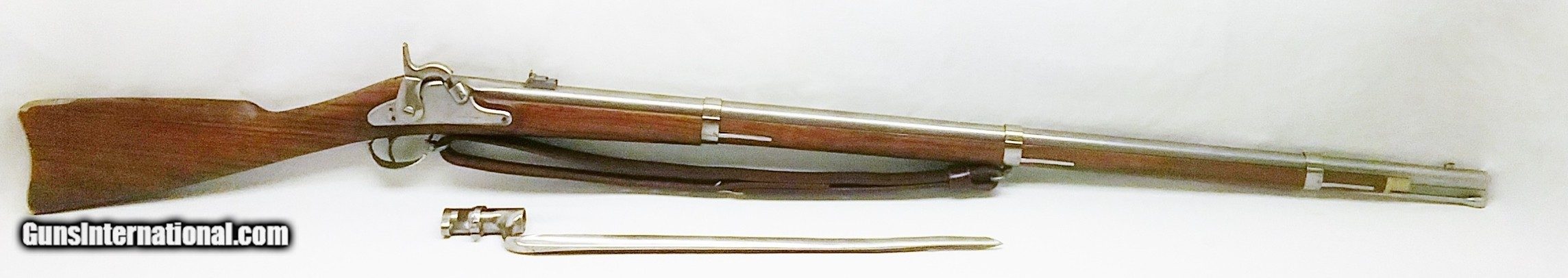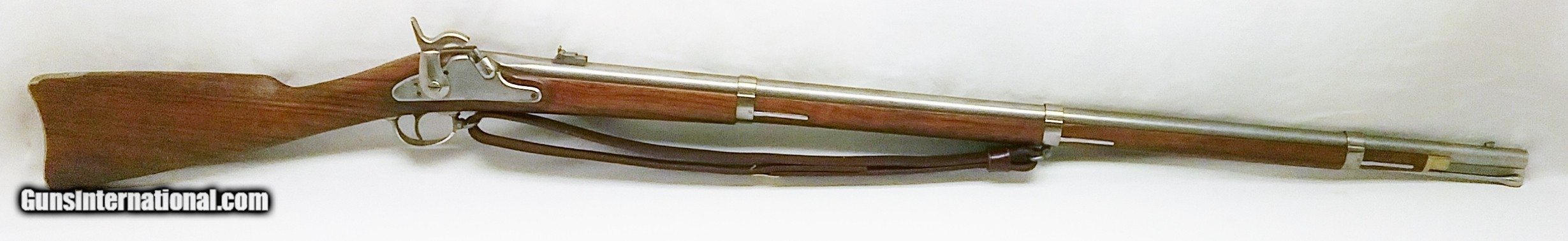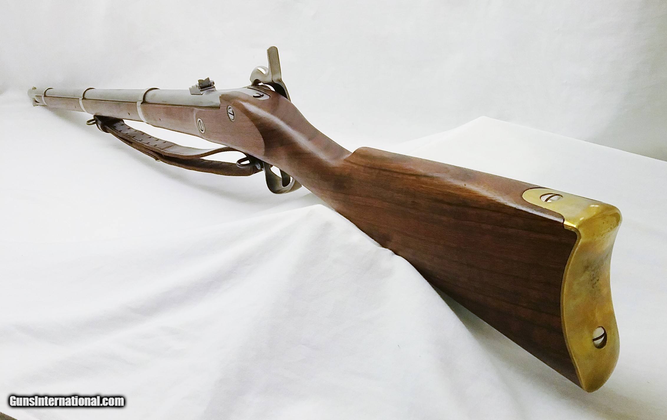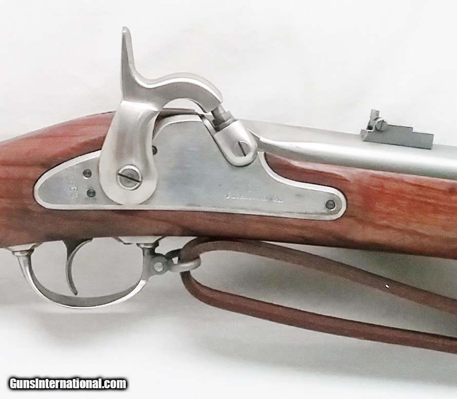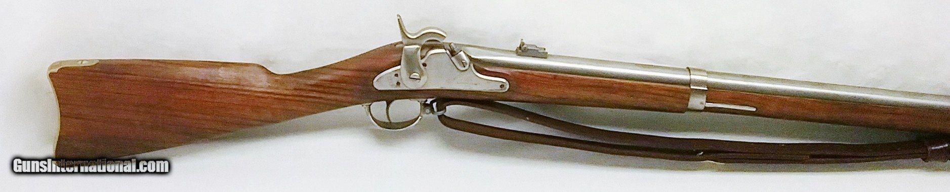 Description: This .58 caliber Richmond - 1863 - 3-Band musket has a tapered round 1-1/8" to 3/4" x 40" highly polished barrel with 1:56 twist and fitted with an adjustable 3 leaf rear sight. Stamped on the top of the barrel is 1863. The bore is very good. The P++ grade European Walnut stock is fitted with a mix of highly polished steel and brass furniture. The highly polished large military style lock has 1863 Richmond VA & CS stamped on the plate. Complete with sling swivels, sling, metal ramrod and bayonet. Length of pull is 13-1/4", overall length is 56" without bayonet, weight is 10.8 lbs. Factory wood to metal fit - made by Euroarms. Condition: Good. Our stock number is P-29-23. Will ship anywhere in the United States. Buyer pays freight and insurance. SOLD Manufacturer: Euroarms Model: Richmond Caliber Info: 58Cal Bore: Rifled Condition: Good Metal Condition: Good Wood Condition: Good Bore Condition: Very Good Barrels: One Barrel Type: Tapered Round Action: Percussion Triggers: One Stock: European Walnut Finish: Steel Weight: 10.8 lbs Sights: Adjustable |