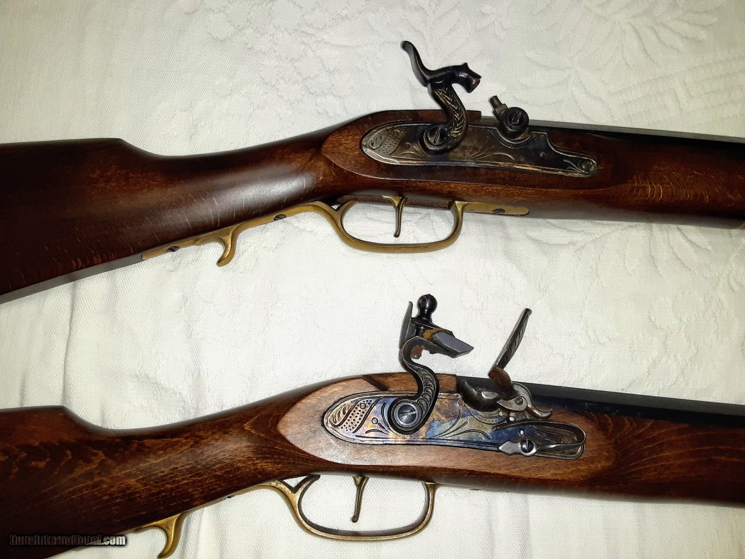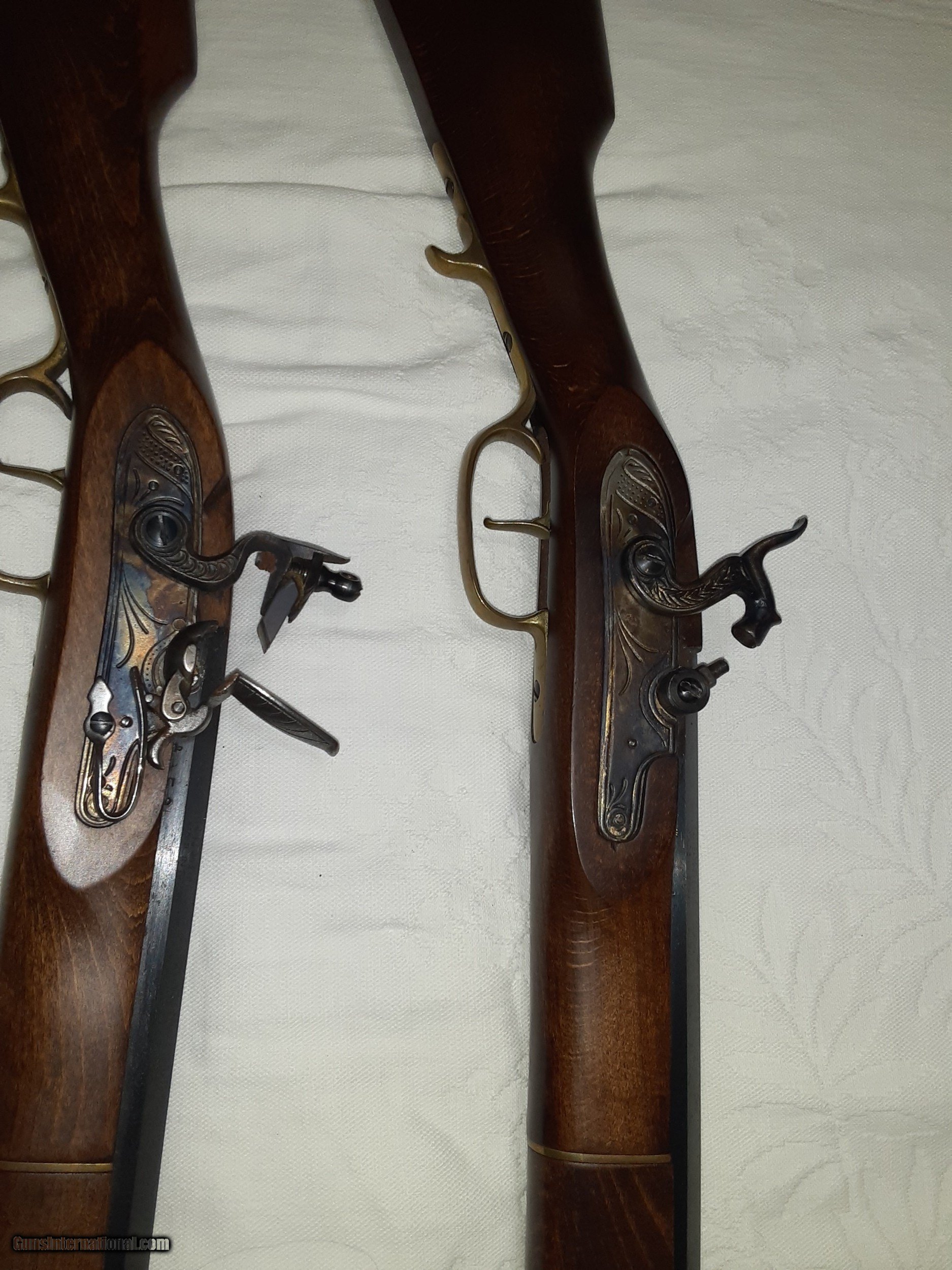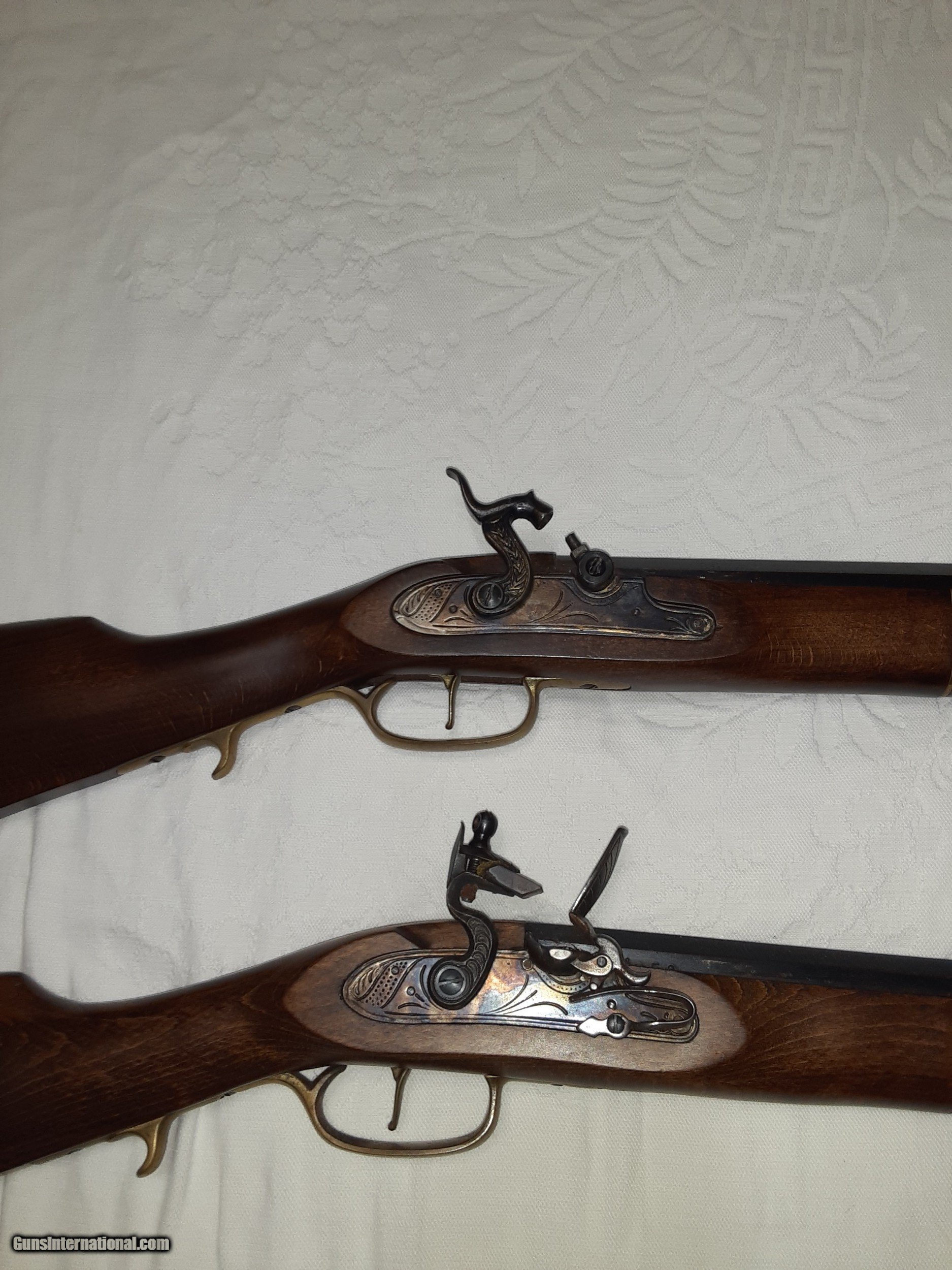 Description: A wonderful MATCHED PAIR of TRADITIONS KENTUCKY LONG RIFLES 50 CAL. ONE FLINTLOCK & ONE CAP LOCK!! These Beautiful Black Powder RIFLES WERE BUILT IN SPAIN IN THE '90S.. and are true and complete copies of the originals. CAST ENGRAVED SIDE PLATES, OCTAGON BARRELS, 48" OAL... A two gun Display Stand is also available... Suitable for use or Display.. $800 for pair $450 ech + Freight SOLD Rifle Caliber: .50 Manufacturer: TRADITIONS Model: Kentucky Long Rifle Condition: 99.9% Metal Condition: 100% Wood Condition: ABSOLUTELY GORGEOUS 100% Bore Condition: 100% Barrel Type: Steel Triggers: SINGLE Stock: QUALITY WOOD Manufacture Date: 1990's ?? Engraving: Cast sideplate |