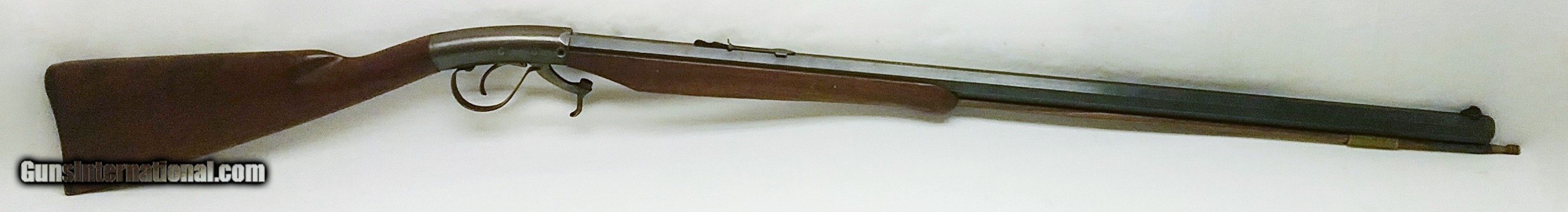 Description: This .45 caliber "Off Hand" Underhammer rifle has a blued octagon 29/32" x 32" with 1:56 twist and fitted with an adjustable rear sight and bead front sight. Stamped on the top flat is The "Off Hand" Hopkins & Allen Numrich Arms W Hurley NY. The bore has scattered roughness with good rifling. The P grade Walnut butt stock and forend are mounted to the blued underhammer percussion action. Comes with a factory flat plastic butt plate, brass thimbles and wooden ramrod. Length of pull is 14", overall length is 49", weight is 7.4 lbs. Factory wood to metal fir - made by Hopkins & Allen - Numrich Arms. Condition: Good. Our stock number is P-29-00. Will ship anywhere in the United States. Buyer pays freight and insurance. SOLD Manufacturer: Hopkins & Allen - Numrich Arms Model: Off Hand Underhammer Caliber Info: 45 Cal Bore: Rifled Condition: Good Metal Condition: Good Wood Condition: Good Bore Condition: Scattered Roughness, Good Rifling Barrels: One Barrel Type: Octagon Action: Percussion Triggers: One Stock: Walnut LOP: 14 in Finish: Blued Weight: 7.4 lbs Sights: Adjustable |