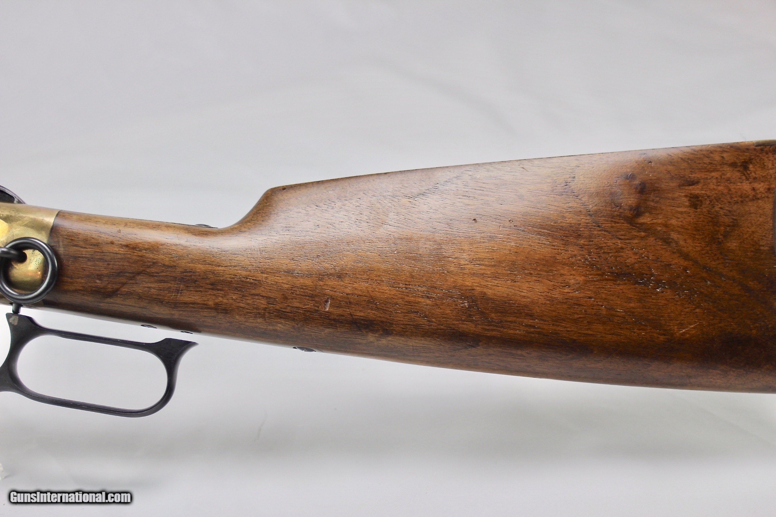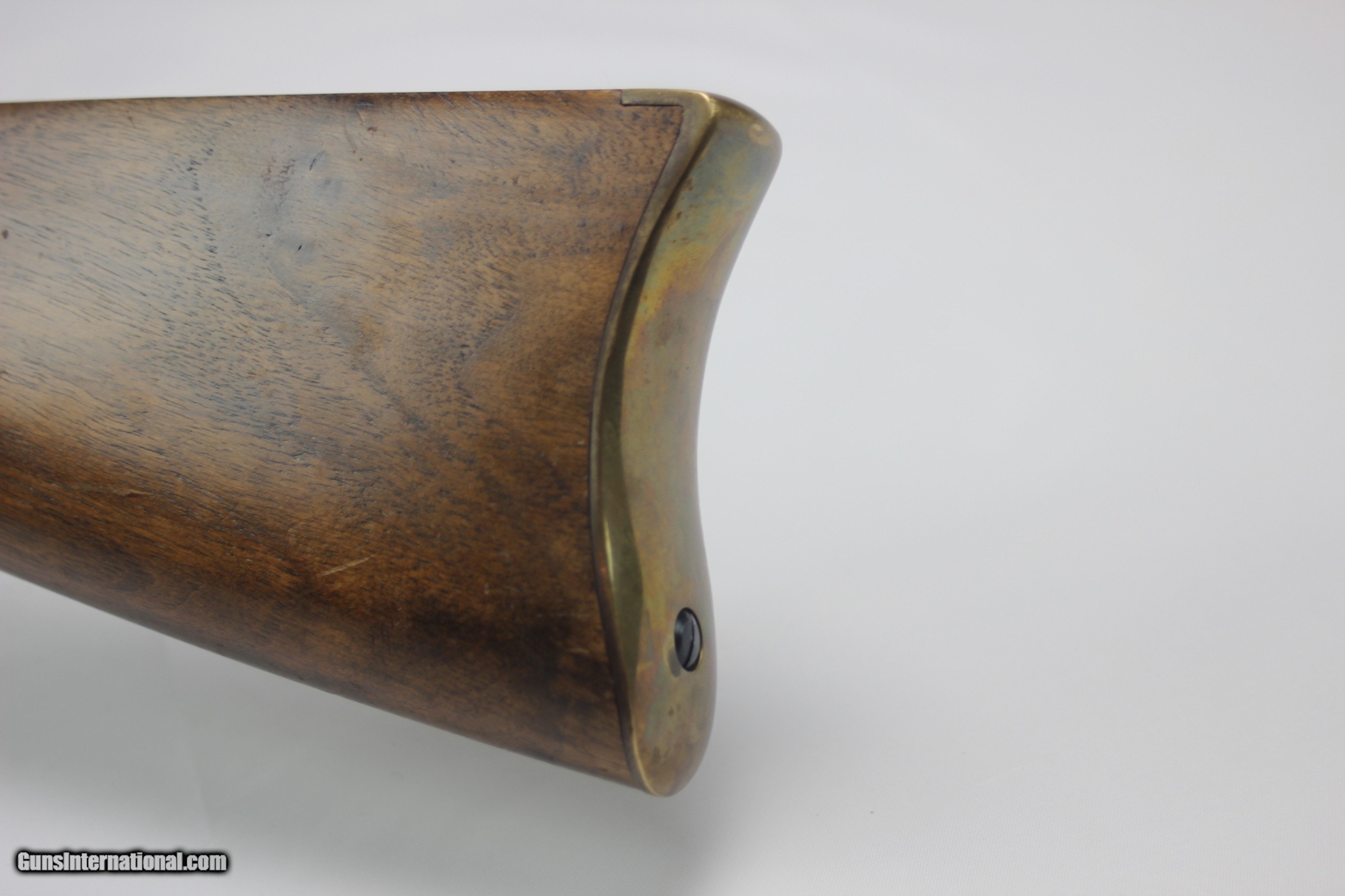 Description: Offered for sale is A Navy Arms Yellowboy Trapper Carbine in 44-40. This is a seldom seen short model of the Wincheter 66 replica, Manufactured prior to 1984. The carbine has a hardened brass receiver with blued barrel, magazine, trigger and trigger guard. The butt plate is also brass. The lgun is in excellent condition and functions flawlessly. There are some small dings to the walnut stock and forend, but no splits, cracks or chips. The metal surfaces are perfect with some very slight aging to the brass receiver. The 16 1/2" barrel has an exceptionally clean bore showing no wear ot corrosion. In short this is an excellent short carbine that will give you an edge in the cowboy shooting contests or help you or one of your youngsters bring home a buck. Two boxes of 44-40 shells ( 59 rounds ) are included in the price, but must be shipped seperately. SOLD Rifle Caliber: .44-40 Winchester Manufacturer: Navy Arms / Pedersoli Model: 1866 Yellowboy Trapper Serial Number: 15125 Barrel Length: 16 1/2 Bore: 44 cal. Chambers: one Ejectors: manual Condition: Excellent Metal Condition: Excellent Wood Condition: Very Good Bore Condition: Clean and bright Barrels: 16 1/2" round Barrel Type: blued carbon steel Action: Hardened Brass Triggers: Single Stock: Figured Walnut Stock Comb: drop 2 1/4 Stock Heel: drop 3 3/4 Fore End: Figured Walnut Butt Pad: Brass LOP: 13 1/2 Finish: Brass & Blued steel Sights: Fixed front, ladder rear Item Location: Coweta, OK |