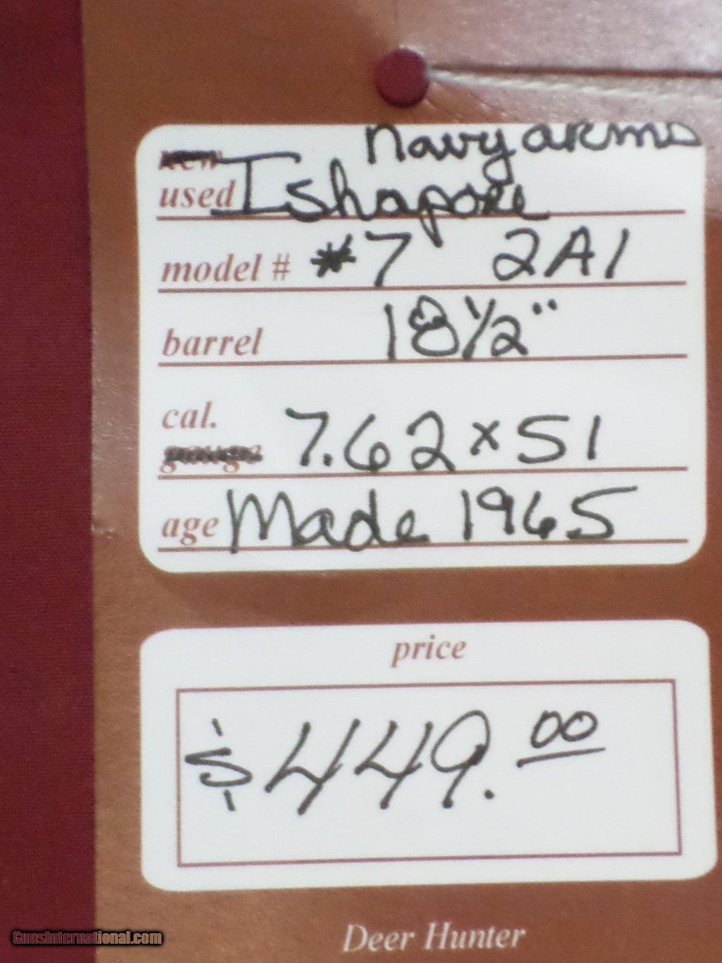 Description: For sale, Navy Arms Ishapore #7, 7.62 Nato, Enfield action. Excellent condition. Circa 1965 SOLD To see more of our inventory, visit deerhunterguns,com We collect 7% sales tax for Florida sales. We accept MC, Visa and Discover, no AmEx. No Sales to California. Like us on Facebook: Deer Hunter Guns SOLD |