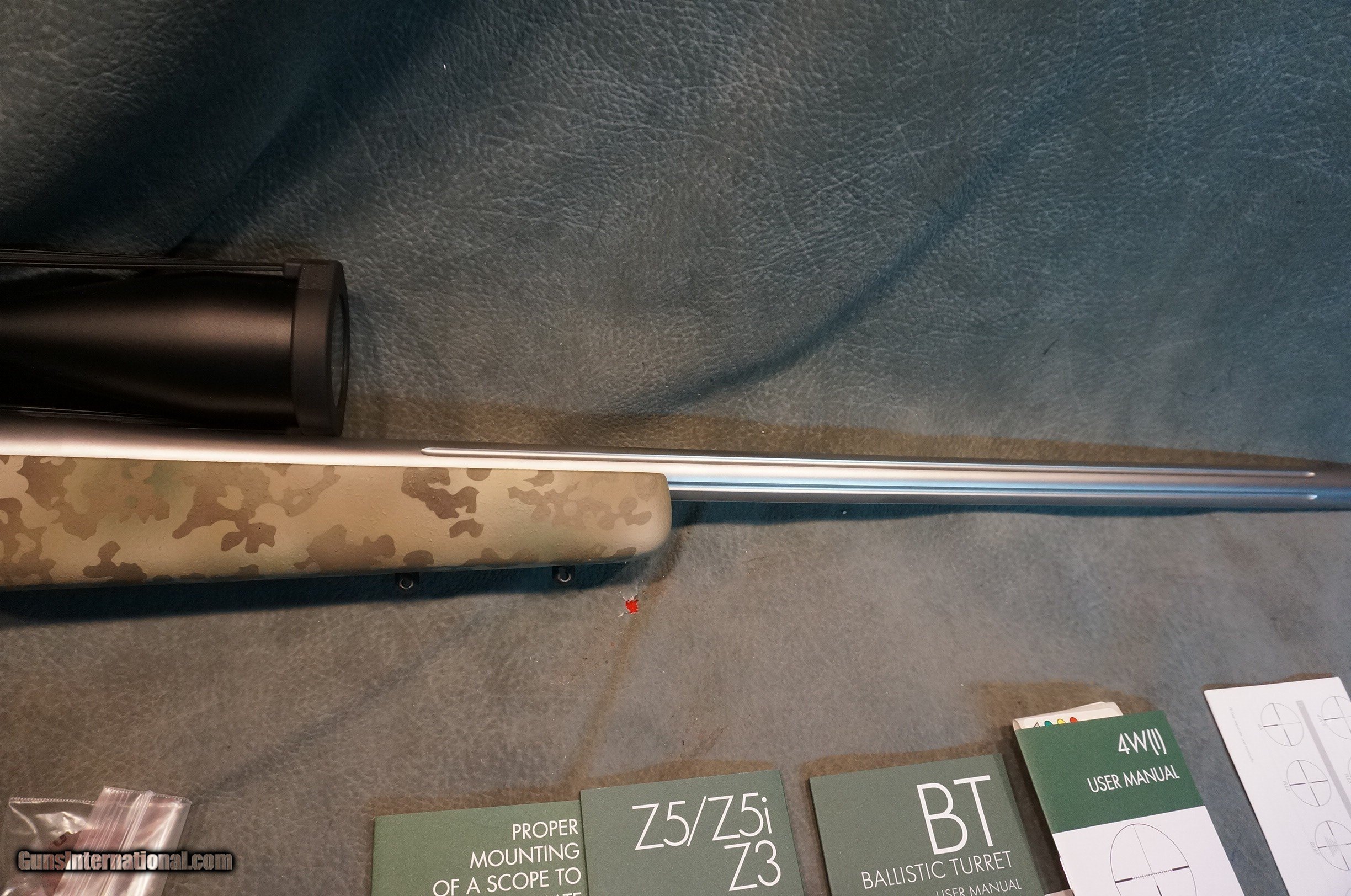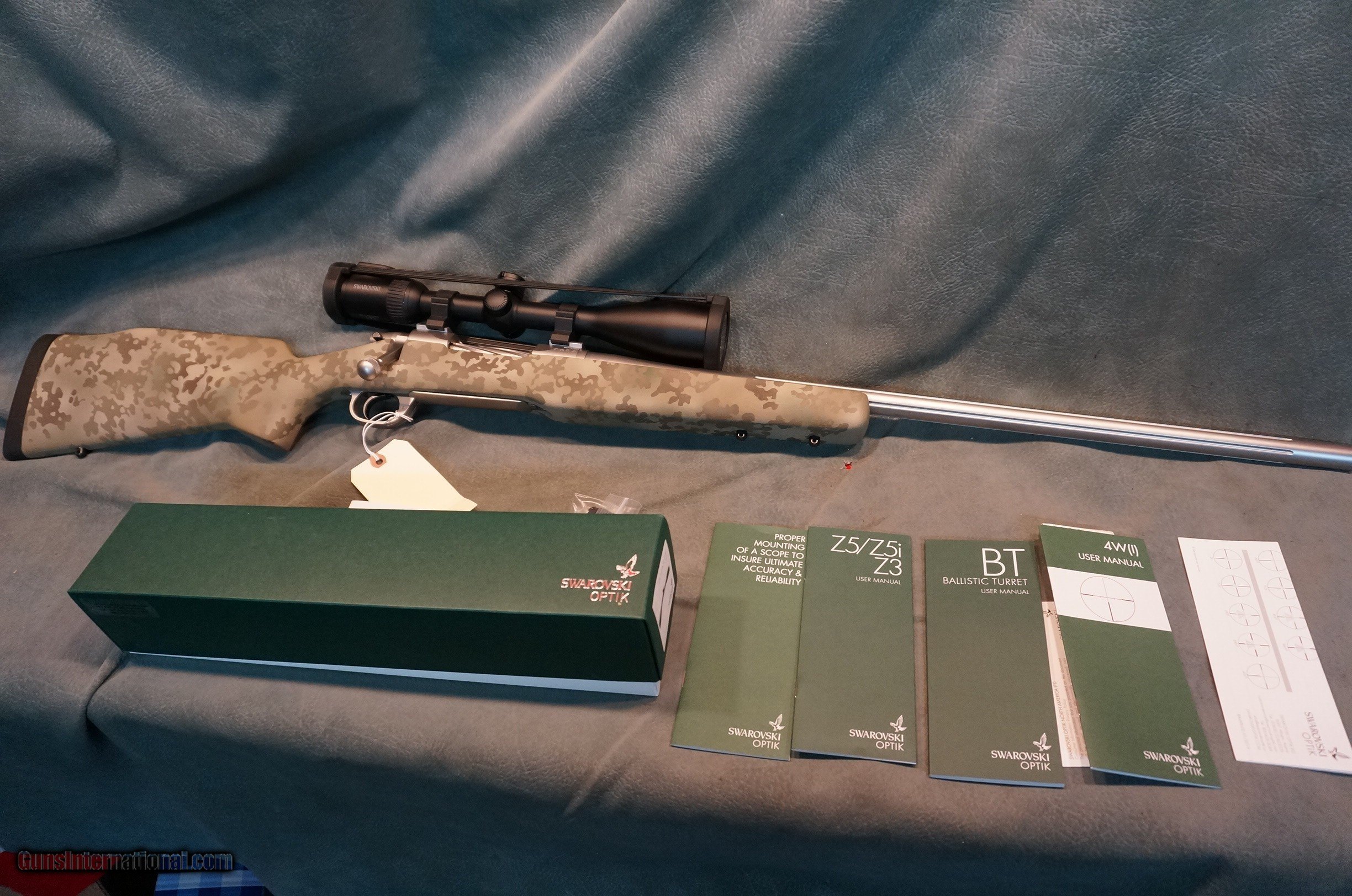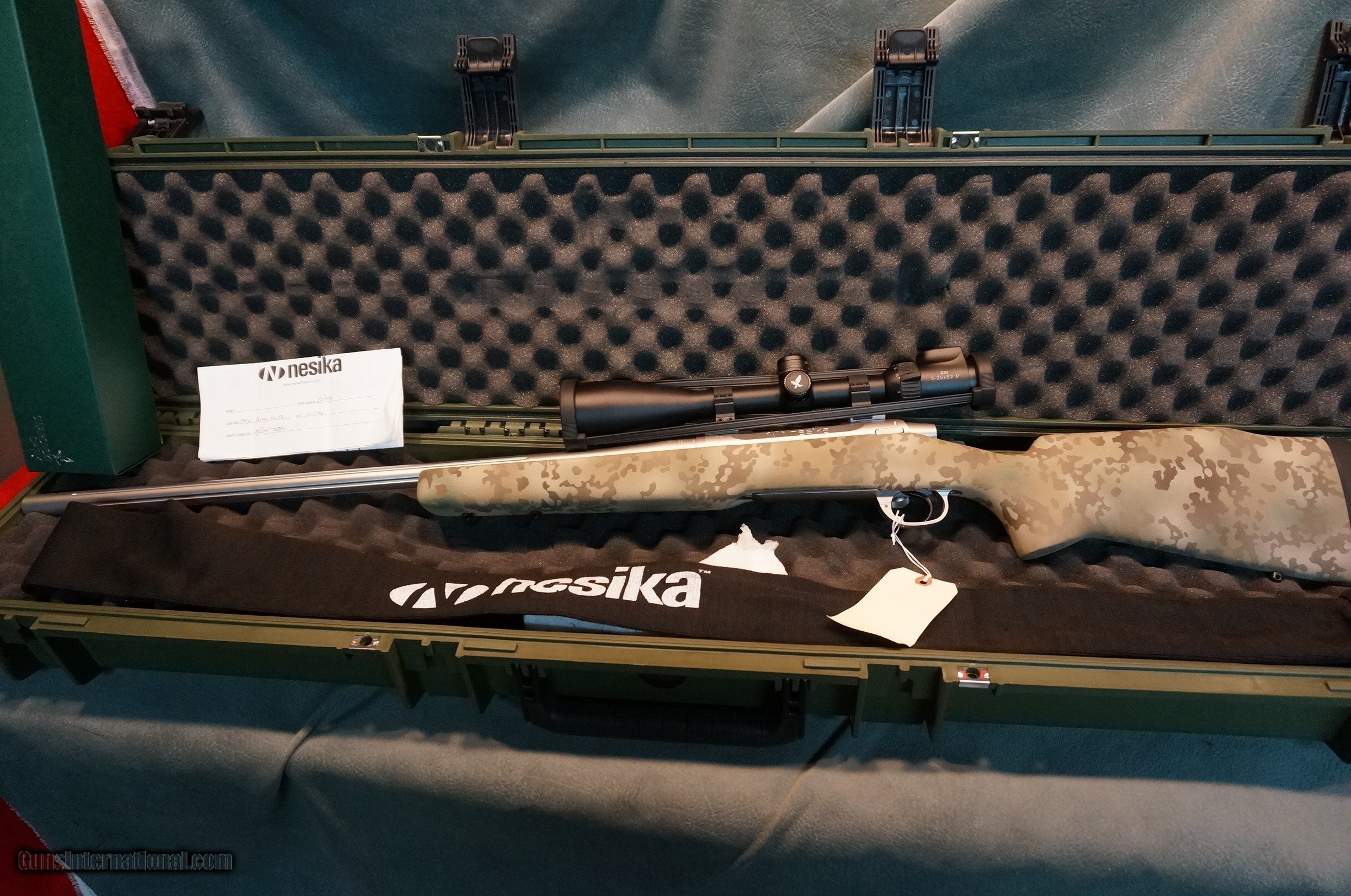 Description: Nesika Long Range Model V 7mmRemMag,repeater,26" Douglas Premium Air Gauged heavy fluted stainless barrel,fluted bolt,Timney trigger,dual front sling swivel studs,Custom Scapel camo paint,as new unfired $2099,with new Swarovski Z5i 5-25x52 L4W-I illuminated scope rings and scope box $3299.Deluxe SKB Custom Shop Case. GUN COLLECTIONS WANTED FOR CASH! We buy, sell, consign and trade new and used firearms.We will pay finders fees and travel for large collections. This is our 45th year in business. We offer 90 day layaways with 20% down. No return on layaways. Firearms will need to be transferred through a FFL dealer. Prices reflect a cash discount. There will be 3% added to credit card sales. We trade for gold and silver. THANK YOU! SOLD |