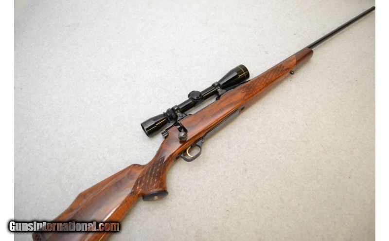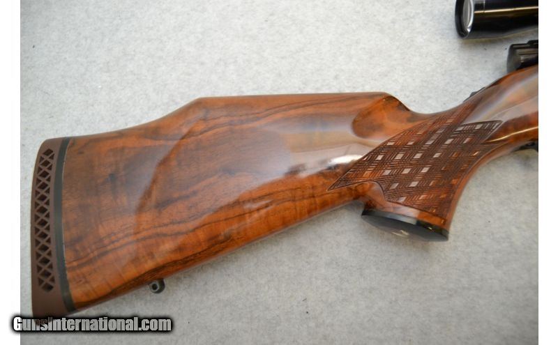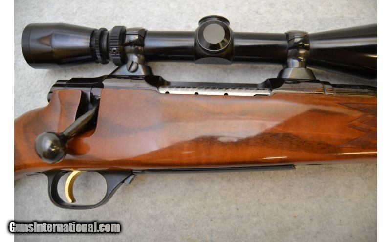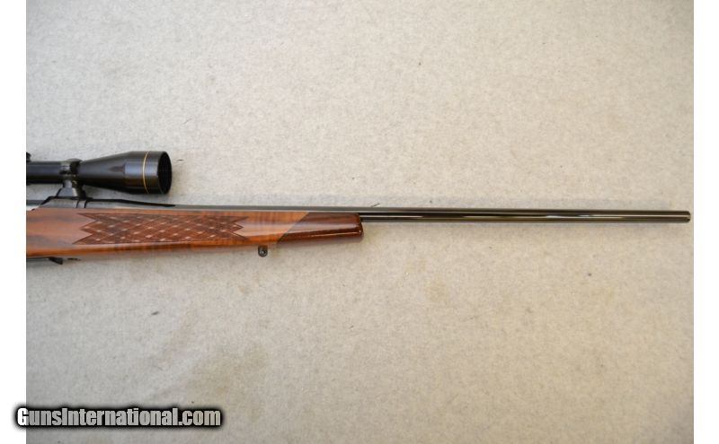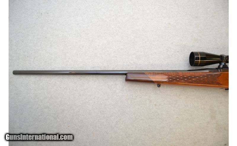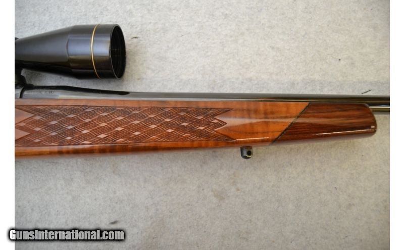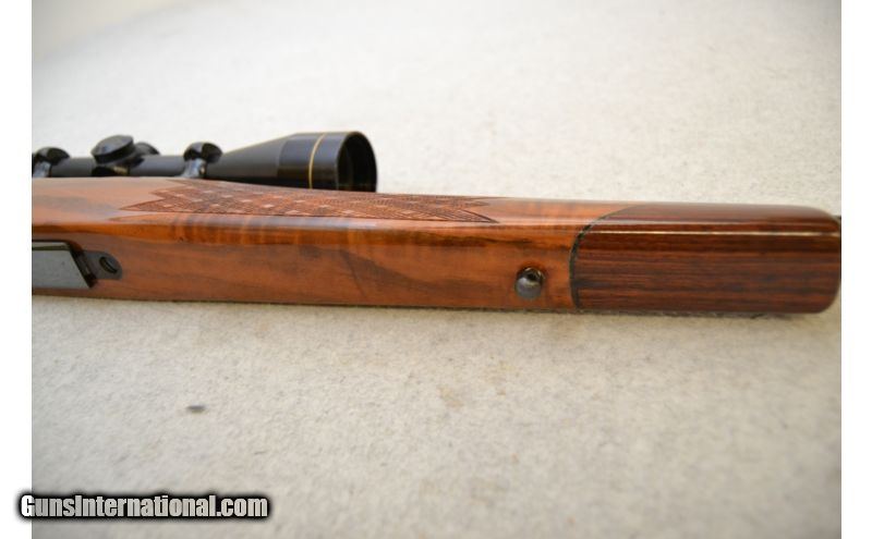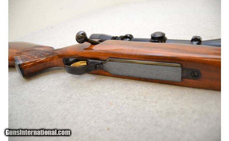 Description: Overall condition of this rifle is borderline excellent. The high gloss bluing is almost flawless but has some extremely small marks. So corrosion is visible upon the metal. The stock is also in extremely nice shape; but much like the metal it does have a few minor marks. The bore is in excellent condition as well with great shine and strong rifling. The scope is mounted on Redfield bases that appear to use the Leupold STD type rings. SOLD Caliber Info: .30-06 Springfield Chambers: Bolt-action fed from an integral magazine with a hinged floor plate. Metal Condition: Excellent. Wood Condition: Excellent. Bore Condition: Excellent. Barrels: 26" With high gloss bluing. Triggers: Gold colored metal with textured surface. Stock: High gloss finished walnut stock with skipline checkering. Grip cap has a gold colored eagle head in it. Stock Dimensions: 14" LOP Fore End: High gloss finished walnut with skipline checkering and rosewood tip. Butt Pad: Ventilated brown rubber pad. Weight: 9lbs 4oz Sights: No iron sights. Has a Leupold 3-9x40mm Vari-X IIc scope mounted. Item Location: Green Bay, WI |