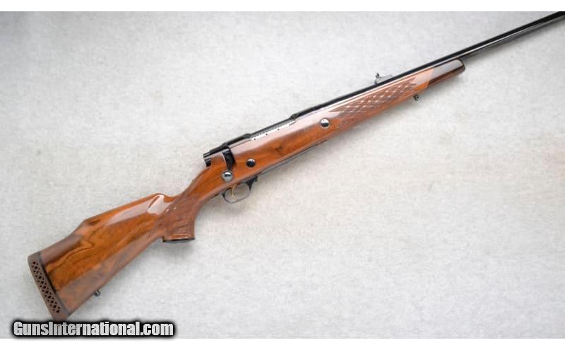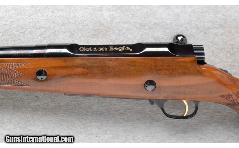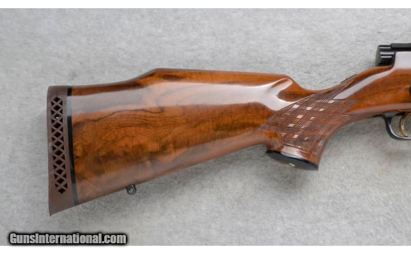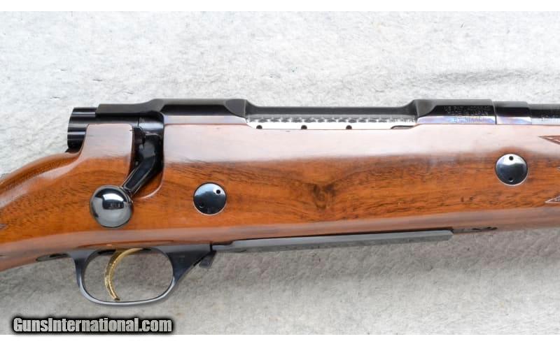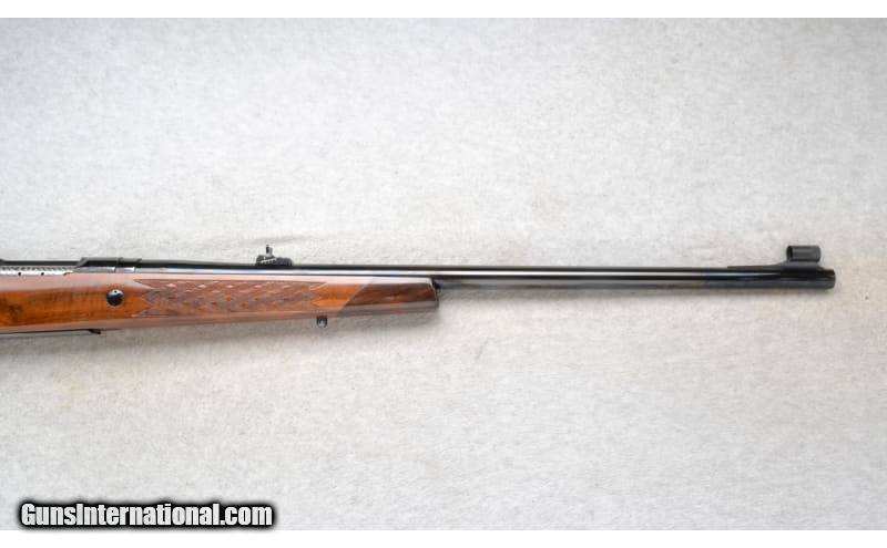 Description: This Nikko Model 7000 is a right hand bolt action rifle in .458 Win. Mag. Cal. It has a 25.5 inch barrel. A hooded front blade sight and an adjustable notch middle sight. It is drilled and tapped. The butt stock is a diamond checkered walnut pistol grip with a raised cheekpiece. The forearm is a diamond checkered walnut with a rosewood tip. It has a jeweled bolt and checkered trigger. .458 Winchester Magnum SOLD Metal Condition: Very Good. Wood Condition: Very Good. Bore Condition: Excellent. Barrels: 25.5 inch. Triggers: Checkered. Stock Dimensions: LOP 14 inches. Fore End: Diamond checkered walnut with a rosewood tip. Butt Pad: Golden Eagle brown rubber recoil pad. Weight: 9 lb. 6 oz. Sights: Hooded front blade. Adjustable notch middle. Drilled and tapped. Item Location: Richfield, WI |