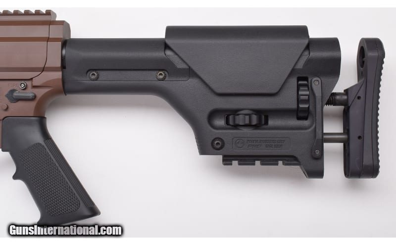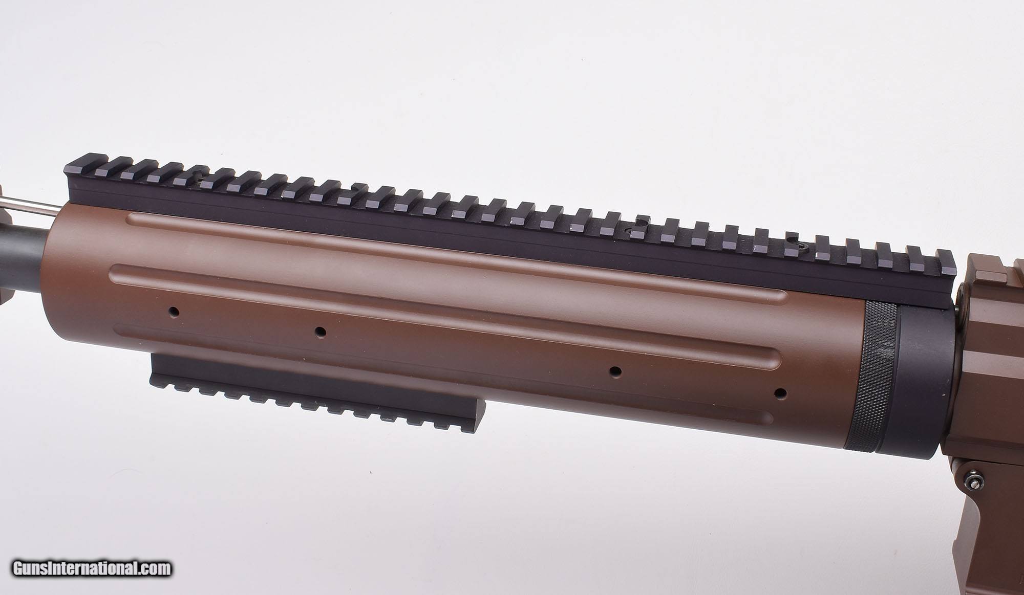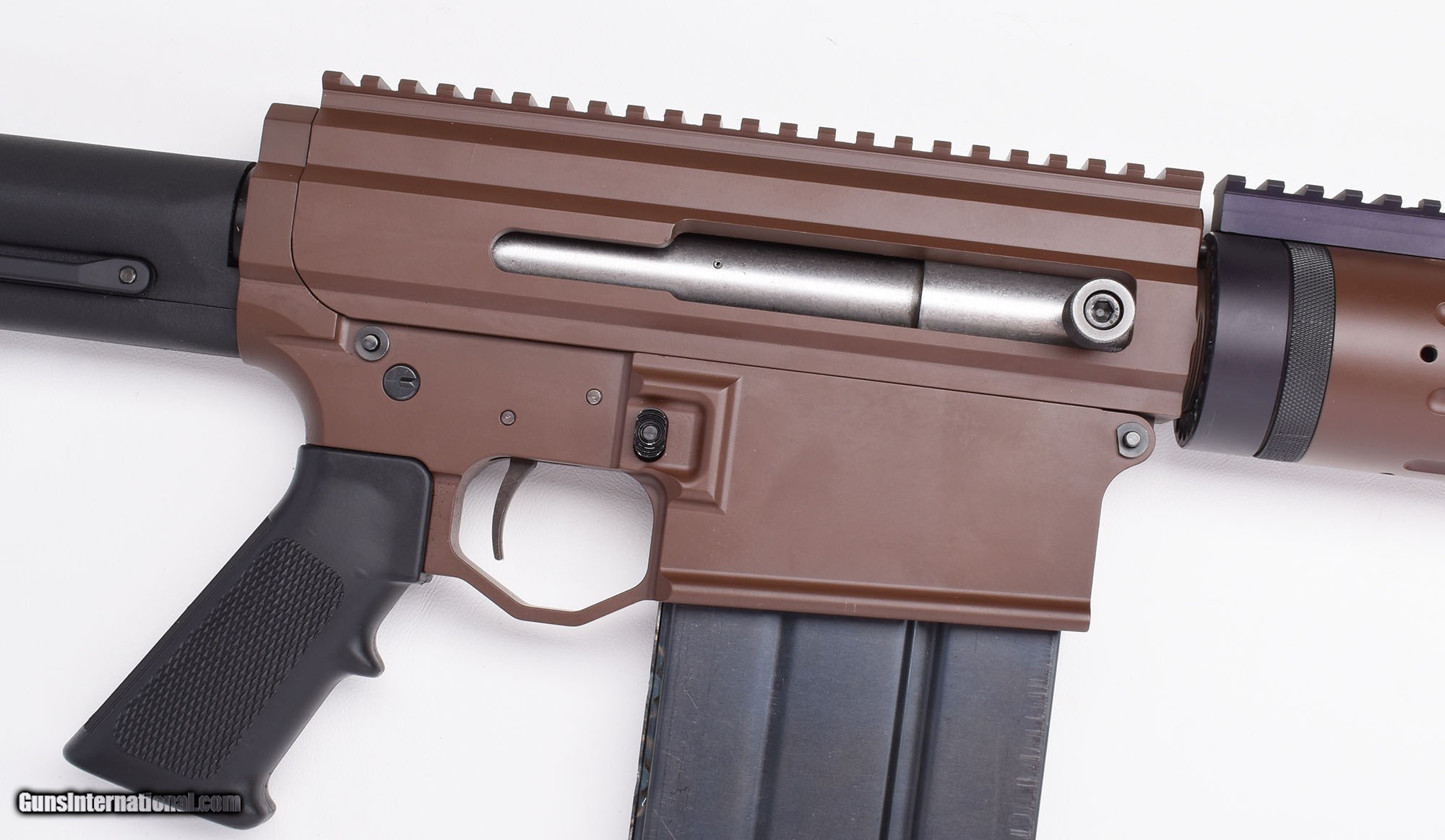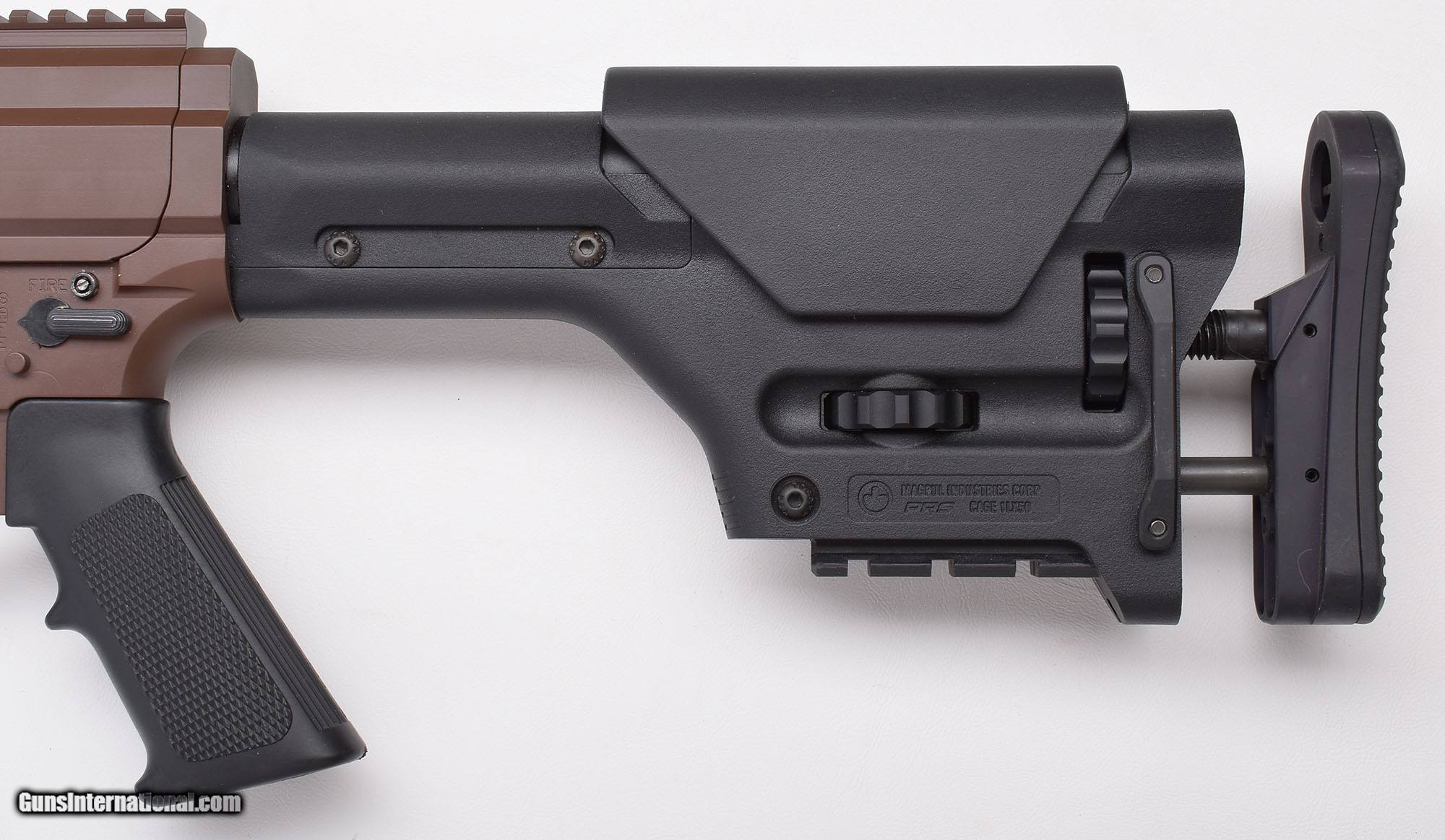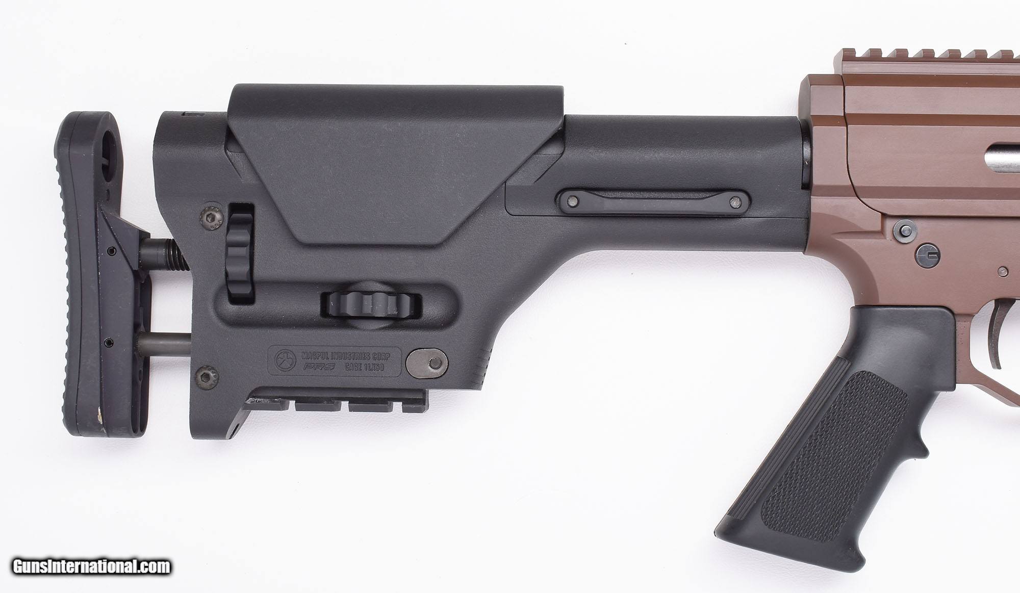 Description: Noreen's AR Style semi-auto rifle chambered for 338 Lapua. Unique piston driven action with side charging handle, Fully adjustable Magpul PRS Stock. Pre-owned rifle shows few minimal handling marks, (1) 10 round steel mag. .338 Lapua Magnum SOLD Rifle Caliber: .338 Lapua Magnum Model: Bad News Bore Condition: "Bright, Sharp Barrels: "26 Barrel, Threaded with Brake Action: Semi-auto Triggers: Single Stage Stock Dimensions: Adjustable Fore End: 12.5 Tubular Forearm Butt Pad: Magpul PRS Stock Weight: 14 lbs Sights: Optics Ready Rails Item Location: Buda, TX |
