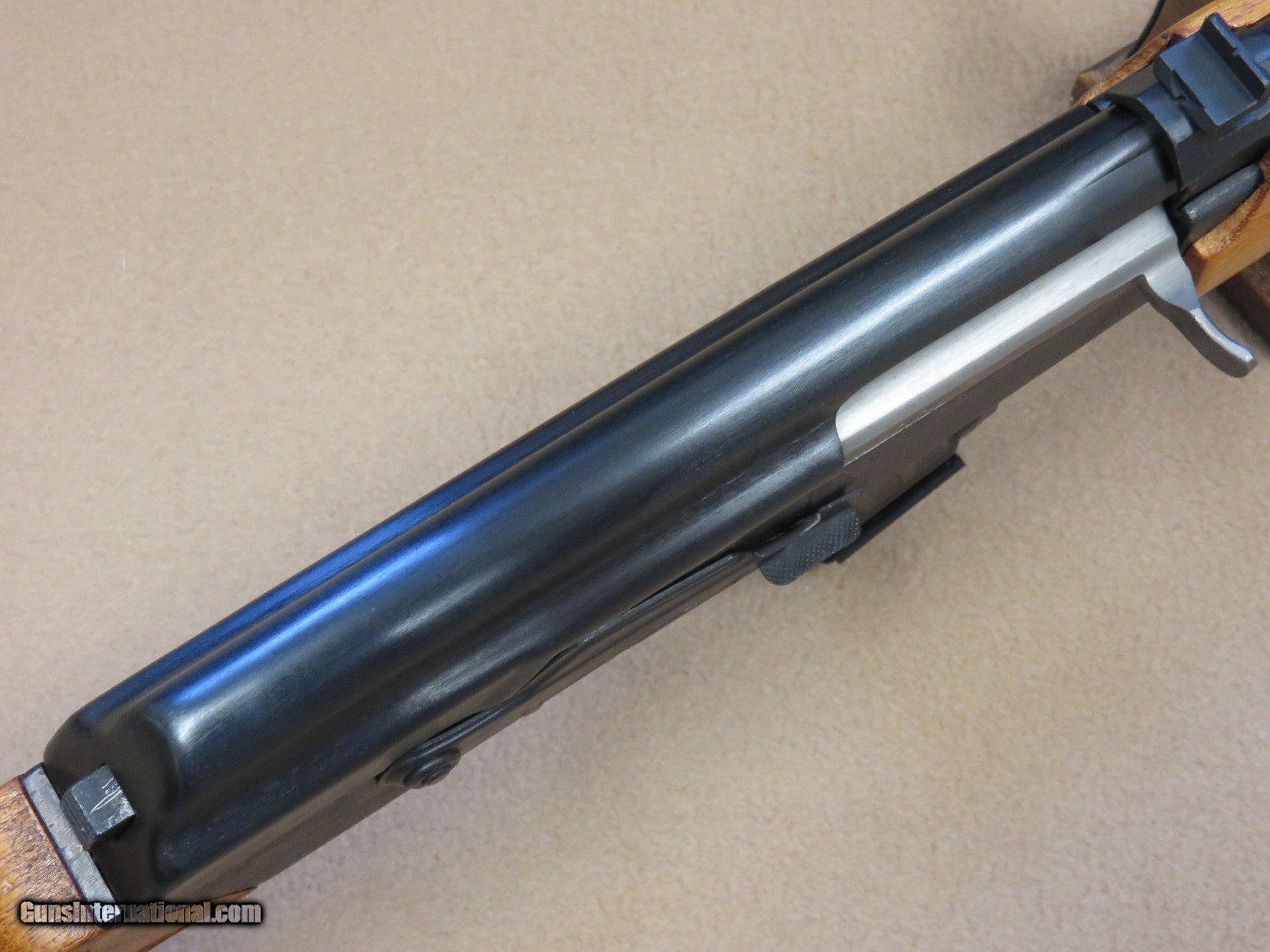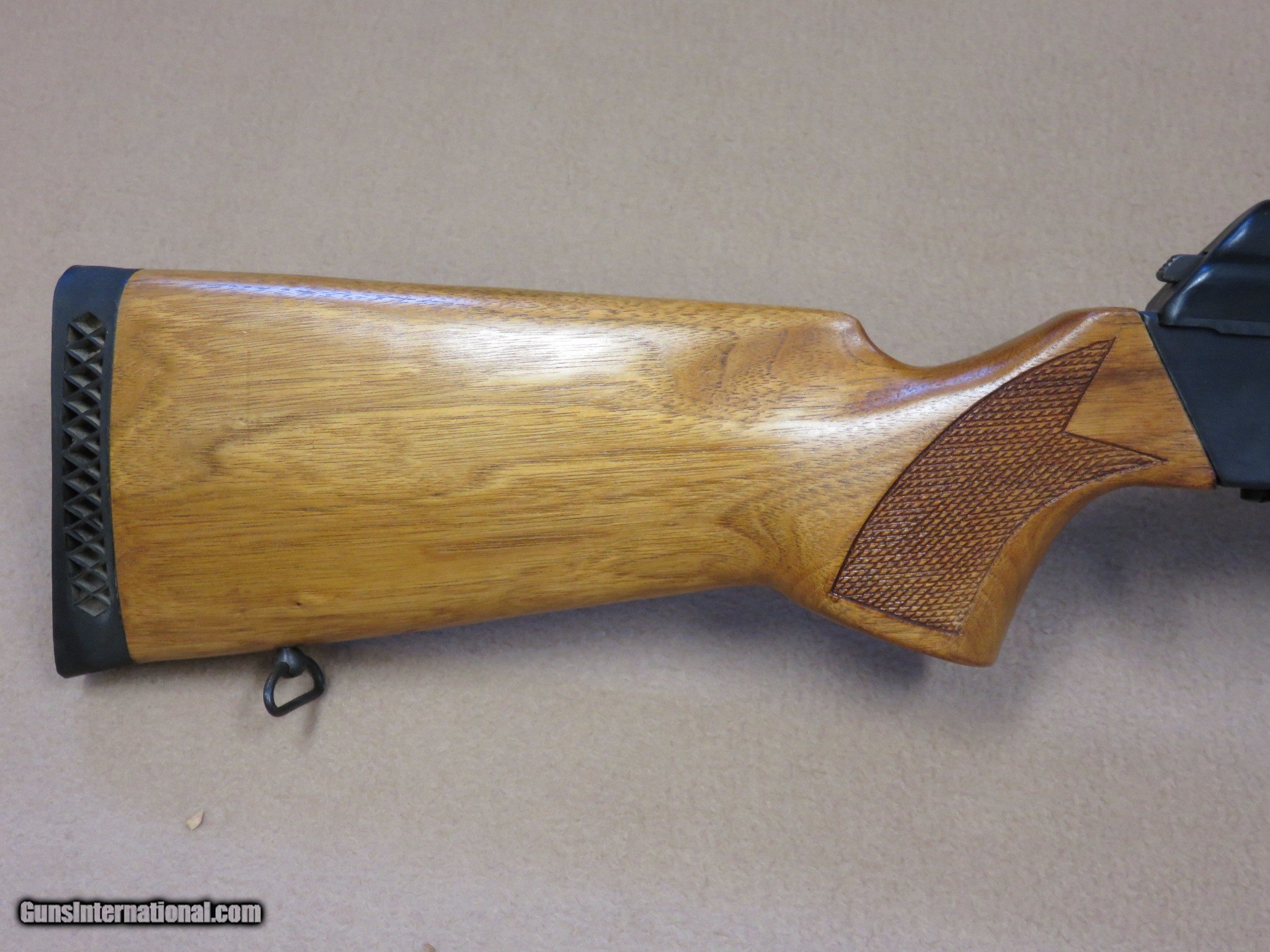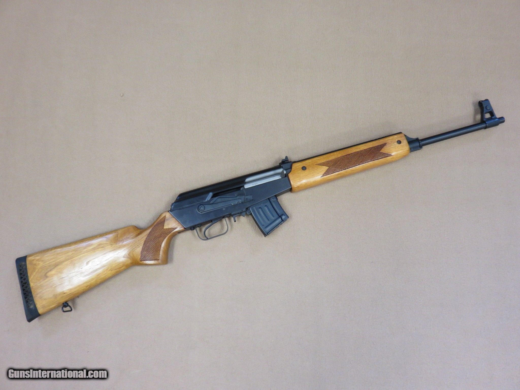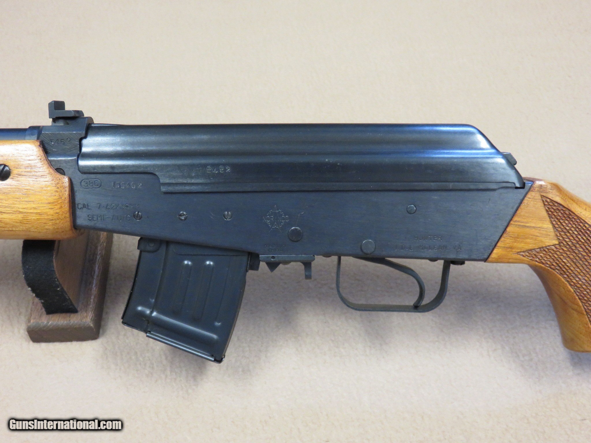 Description: This is an interesting and unique AK style sporting rifle in unfired like-new condition in the original box with all of the inserts it left the factory with. This is a Norinco / Polytech Hunter model in 7.62x39 caliber that was imported into the United States in the late 1980's and early 1990's. It is a semi-auto milled AK pattern rifle with a 20" inch chrome lined barrel with iron sights (flip style rear) and a checkered sporter-style wood stock set with a 14" length of pull to the end of the factory installed pad. It is a very well made weapon with a nice factory blue finish on all of the metal parts except for the bolt. It uses normal AK style magazines and comes with 3 factory 5-rd magazines, the owner's manual, a sling, an oil can, and a cleaning rod. While the rifle itself is stamped with the Norinco name, the milled receiver itself is stamped with "386" inside an oval which tells us it was actually made by Polytech. The flip rear sight has two settings, one for 100 yards and one for 200 yards. It has a standard AK style lever safety on the right side of the receiver, and the there are 3 factory drilled and tapped holes on the left side of the receiver for a scope mount that was offered for this rifle. They have never had the plug screws removed from them. As mentioned before, this Norinco Hunter has spent it's entire life in storage and is unfired and like-new. The blue finish rates 99% and the chrome lined bore is minty and bright. The original stock set is also in excellent condition and shows only a few storage dings that are only visible under very close inspection. The stock set has factory installed sling hardware and a recoil pad. This has to be one of the nicest examples of this unique rifle in existence! If you are a fan of AKs or unique semi-auto rifles this would be an excellent addition to your collection. It would be impossible to upgrade from this one.... SOLD Manufacturer: Polytech / Norinco Model: Hunter Semi-Auto Rifle Serial Number: 135452 Caliber Info: 7.62x39 Bore: Minty Condition: Minty Barrels: 20" Inches LOP: 14" Inches Manufacture Date: 1991 |