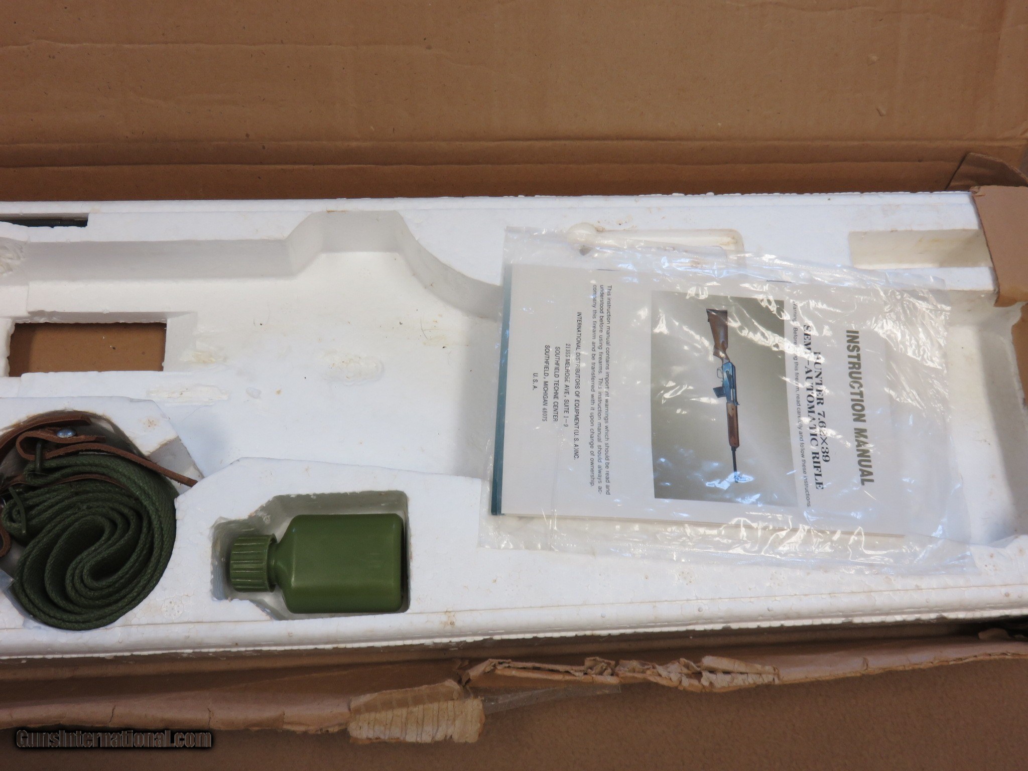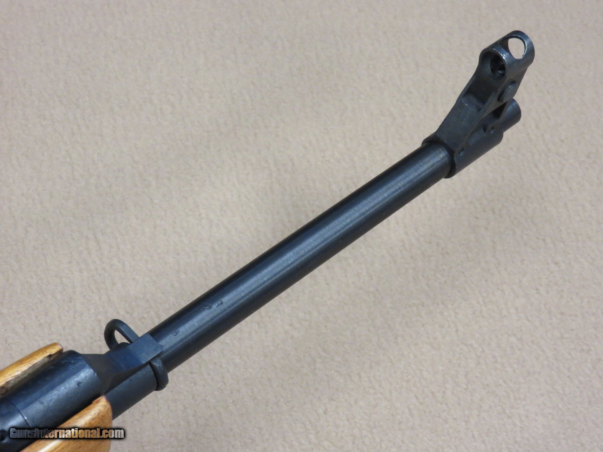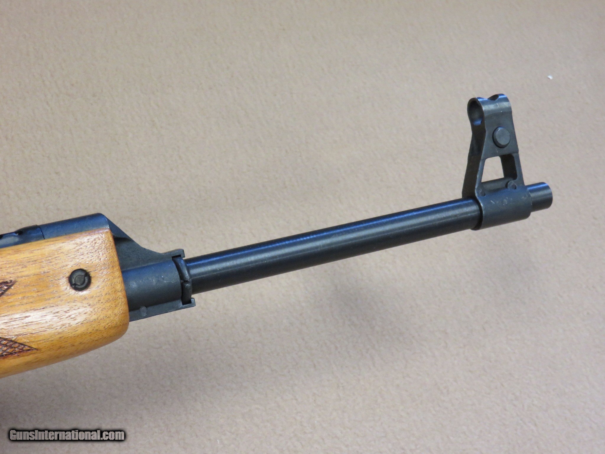 Description: This is an interesting and unique AK style sporting rifle in unfired like-new condition in the original box with all of the inserts it left the factory with. This is a Norinco / Polytech Hunter model in 7.62x39 caliber that was imported into the United States in the late 1980's and early 1990's. It is a semi-auto milled AK pattern rifle with a 20" inch chrome lined barrel with iron sights (flip style rear) and a checkered sporter-style wood stock set with a 14" length of pull to the end of the factory installed pad. It is a very well made weapon with a nice factory blue finish on all of the metal parts except for the bolt. It uses normal AK style magazines and comes with 3 factory 5-rd magazines, the owner's manual, a sling, an oil can, and a cleaning rod. While the rifle itself is stamped with the Norinco name, the milled receiver itself is stamped with "386" inside an oval which tells us it was actually made by Polytech. The flip rear sight has two settings, one for 100 yards and one for 200 yards. It has a standard AK style lever safety on the right side of the receiver, and the there are 3 factory drilled and tapped holes on the left side of the receiver for a scope mount that was offered for this rifle. They have never had the plug screws removed from them. As mentioned before, this Norinco Hunter has spent it's entire life in storage and is unfired and like-new. The blue finish rates 99% and the chrome lined bore is minty and bright. The original stock set is also in excellent condition and shows only a few storage dings that are only visible under very close inspection. The stock set has factory installed sling hardware and a recoil pad. This has to be one of the nicest examples of this unique rifle in existence! If you are a fan of AKs or unique semi-auto rifles this would be an excellent addition to your collection. It would be impossible to upgrade from this one.... SOLD Manufacturer: Polytech / Norinco Model: Hunter Semi-Auto Rifle Serial Number: 135452 Caliber Info: 7.62x39 Bore: Minty Condition: Minty Barrels: 20" Inches LOP: 14" Inches Manufacture Date: 1991 |