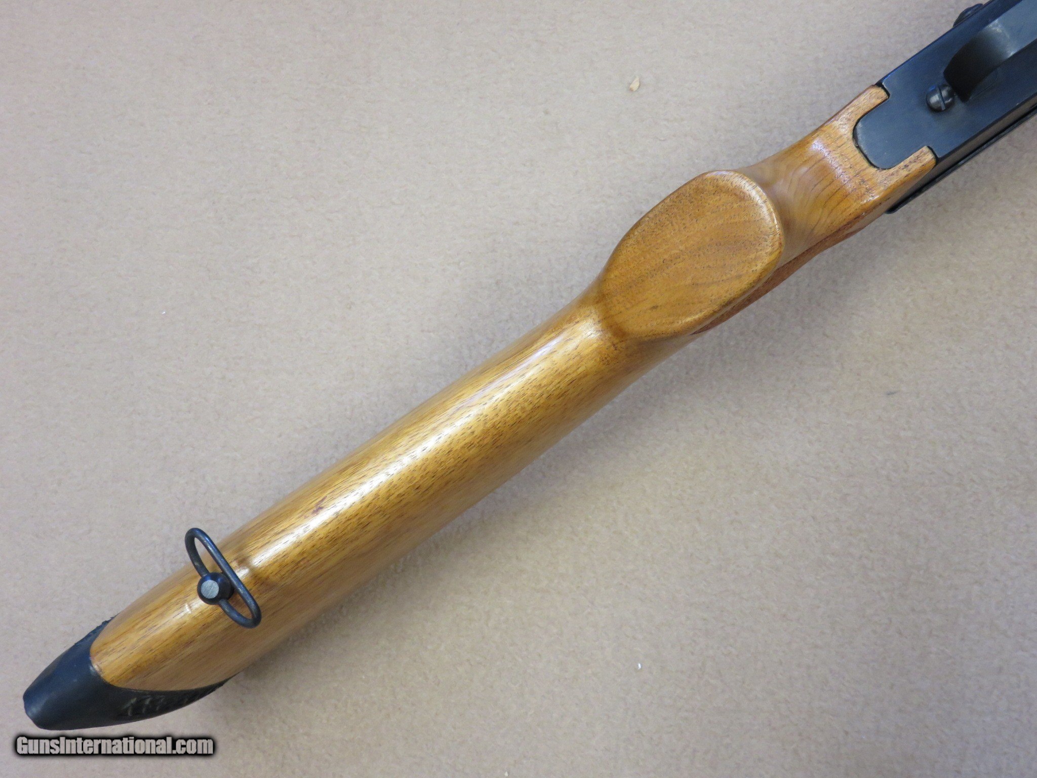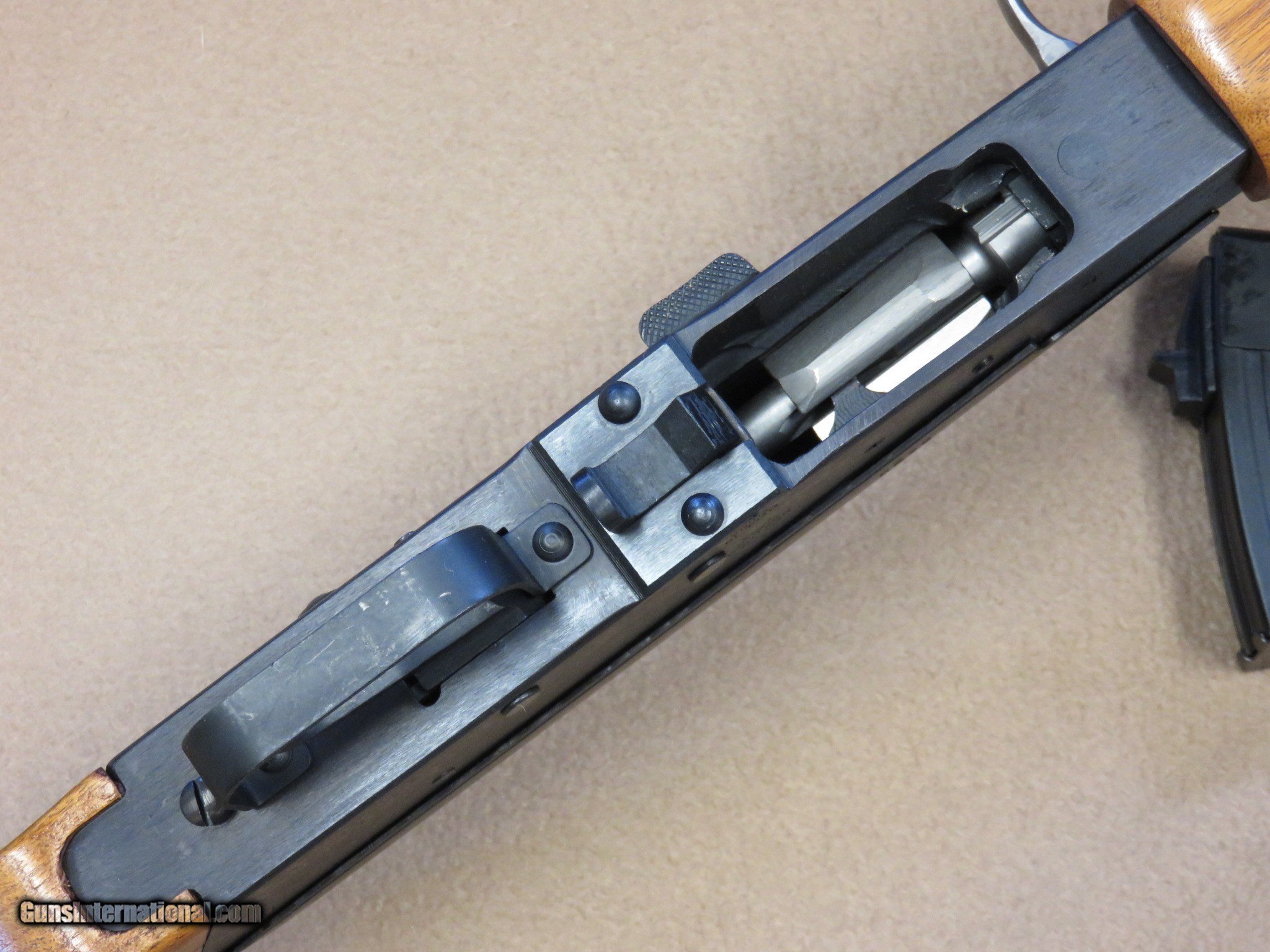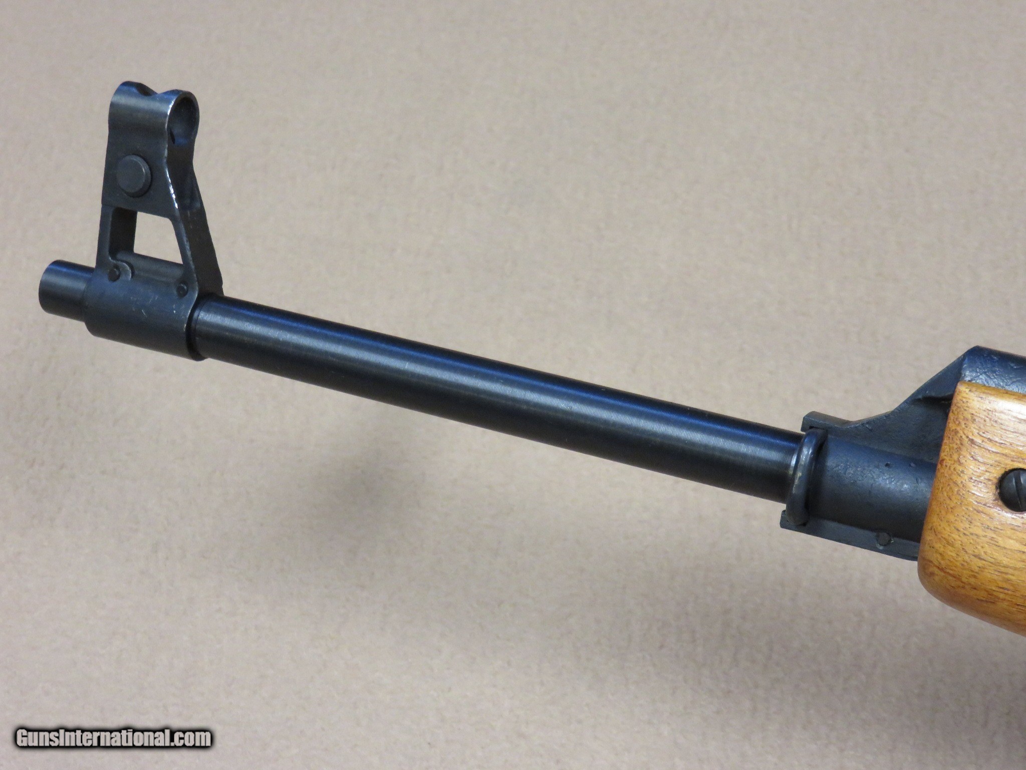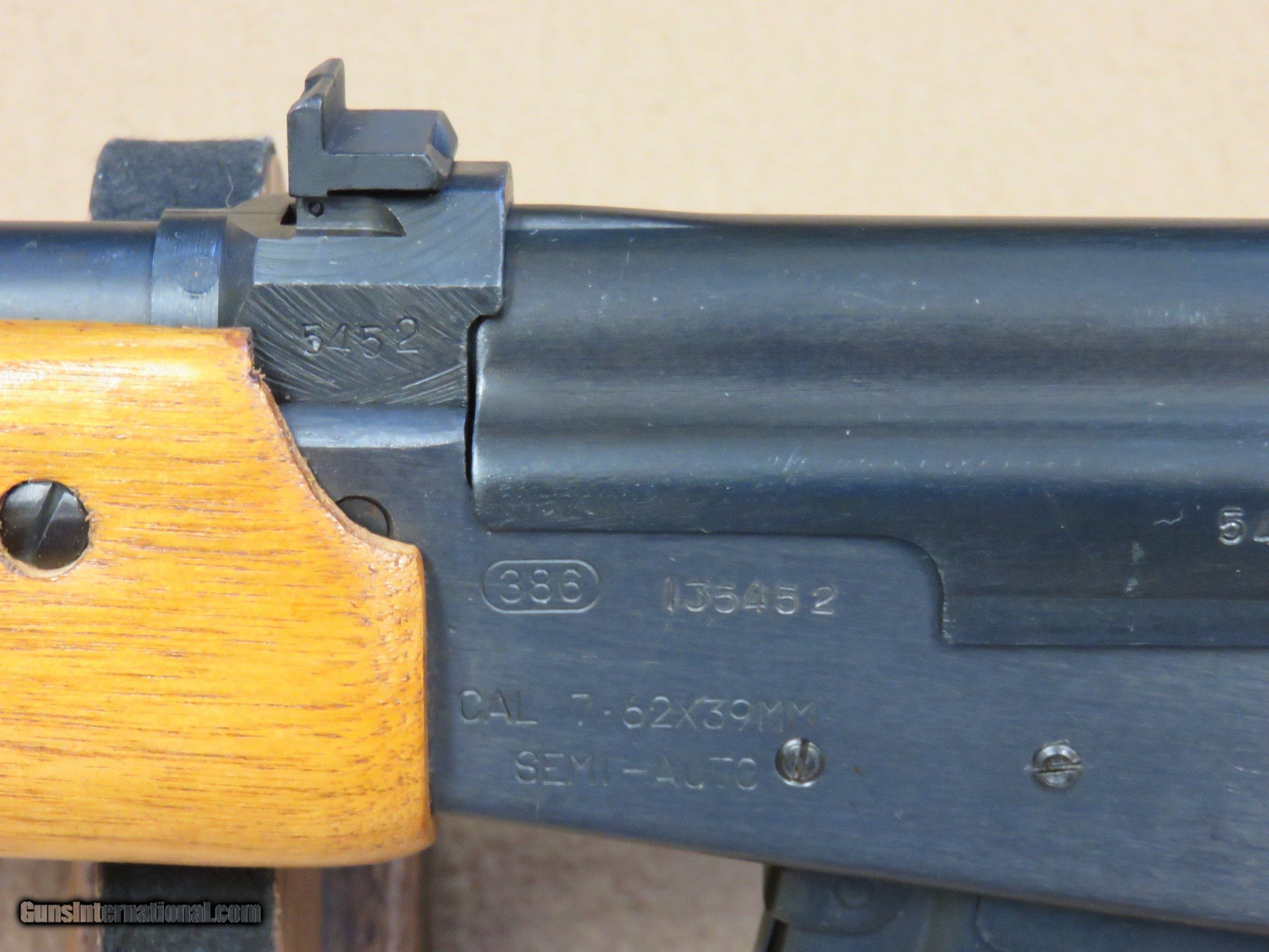 Description: This is an interesting and unique AK style sporting rifle in unfired like-new condition in the original box with all of the inserts it left the factory with. This is a Norinco / Polytech Hunter model in 7.62x39 caliber that was imported into the United States in the late 1980's and early 1990's. It is a semi-auto milled AK pattern rifle with a 20" inch chrome lined barrel with iron sights (flip style rear) and a checkered sporter-style wood stock set with a 14" length of pull to the end of the factory installed pad. It is a very well made weapon with a nice factory blue finish on all of the metal parts except for the bolt. It uses normal AK style magazines and comes with 3 factory 5-rd magazines, the owner's manual, a sling, an oil can, and a cleaning rod. While the rifle itself is stamped with the Norinco name, the milled receiver itself is stamped with "386" inside an oval which tells us it was actually made by Polytech. The flip rear sight has two settings, one for 100 yards and one for 200 yards. It has a standard AK style lever safety on the right side of the receiver, and the there are 3 factory drilled and tapped holes on the left side of the receiver for a scope mount that was offered for this rifle. They have never had the plug screws removed from them. As mentioned before, this Norinco Hunter has spent it's entire life in storage and is unfired and like-new. The blue finish rates 99% and the chrome lined bore is minty and bright. The original stock set is also in excellent condition and shows only a few storage dings that are only visible under very close inspection. The stock set has factory installed sling hardware and a recoil pad. This has to be one of the nicest examples of this unique rifle in existence! If you are a fan of AKs or unique semi-auto rifles this would be an excellent addition to your collection. It would be impossible to upgrade from this one.... SOLD Manufacturer: Polytech / Norinco Model: Hunter Semi-Auto Rifle Serial Number: 135452 Caliber Info: 7.62x39 Bore: Minty Condition: Minty Barrels: 20" Inches LOP: 14" Inches Manufacture Date: 1991 |