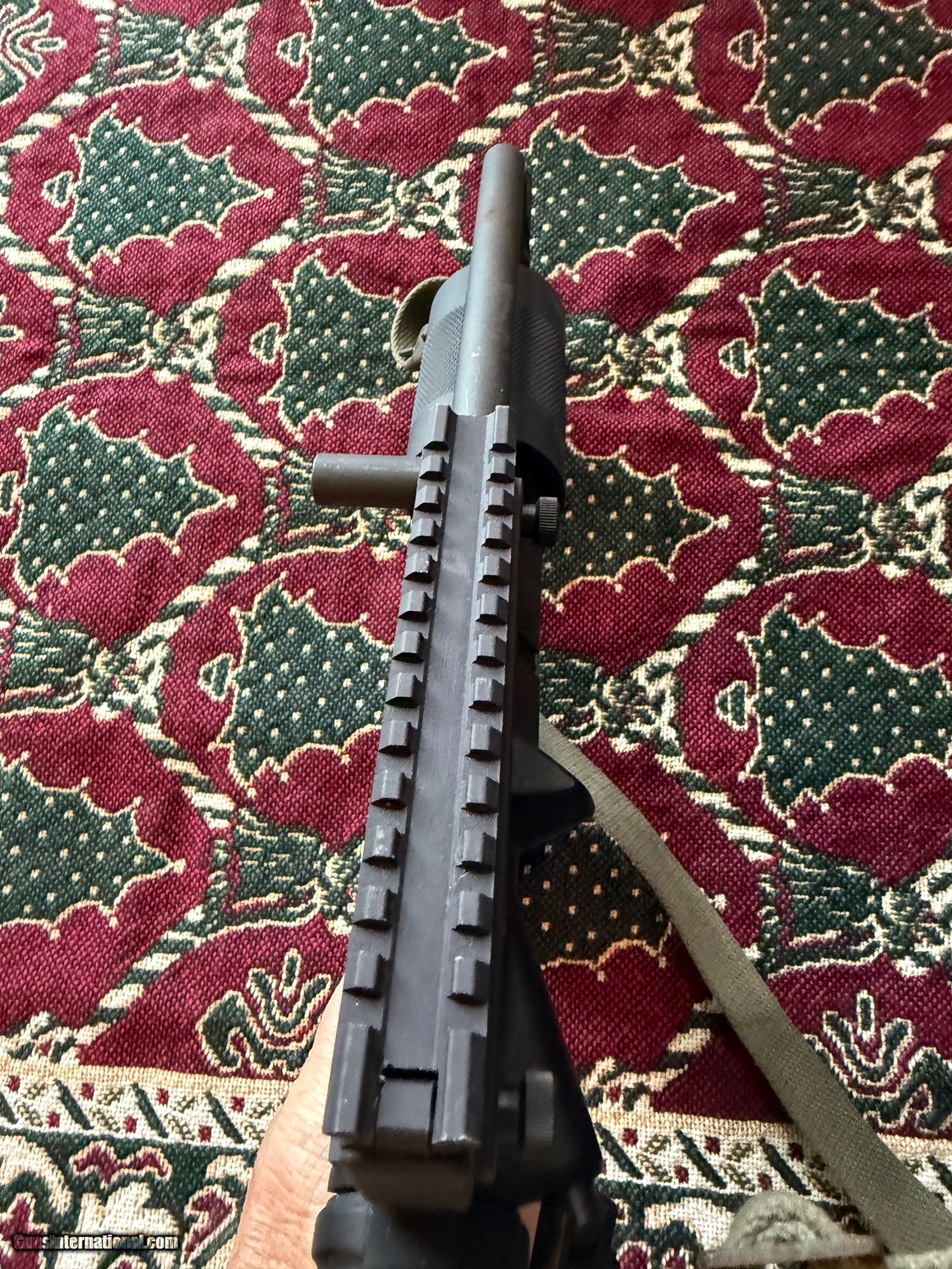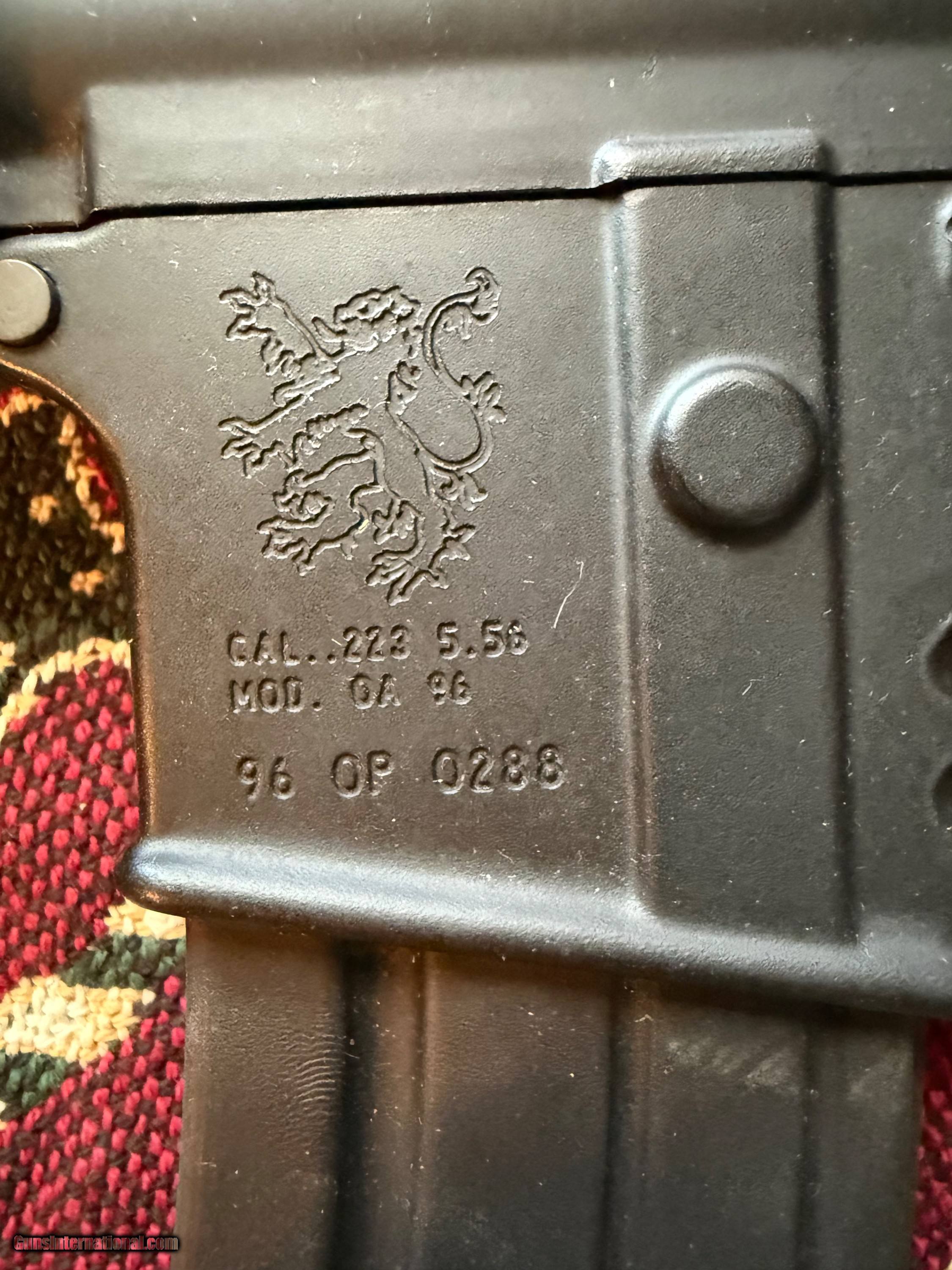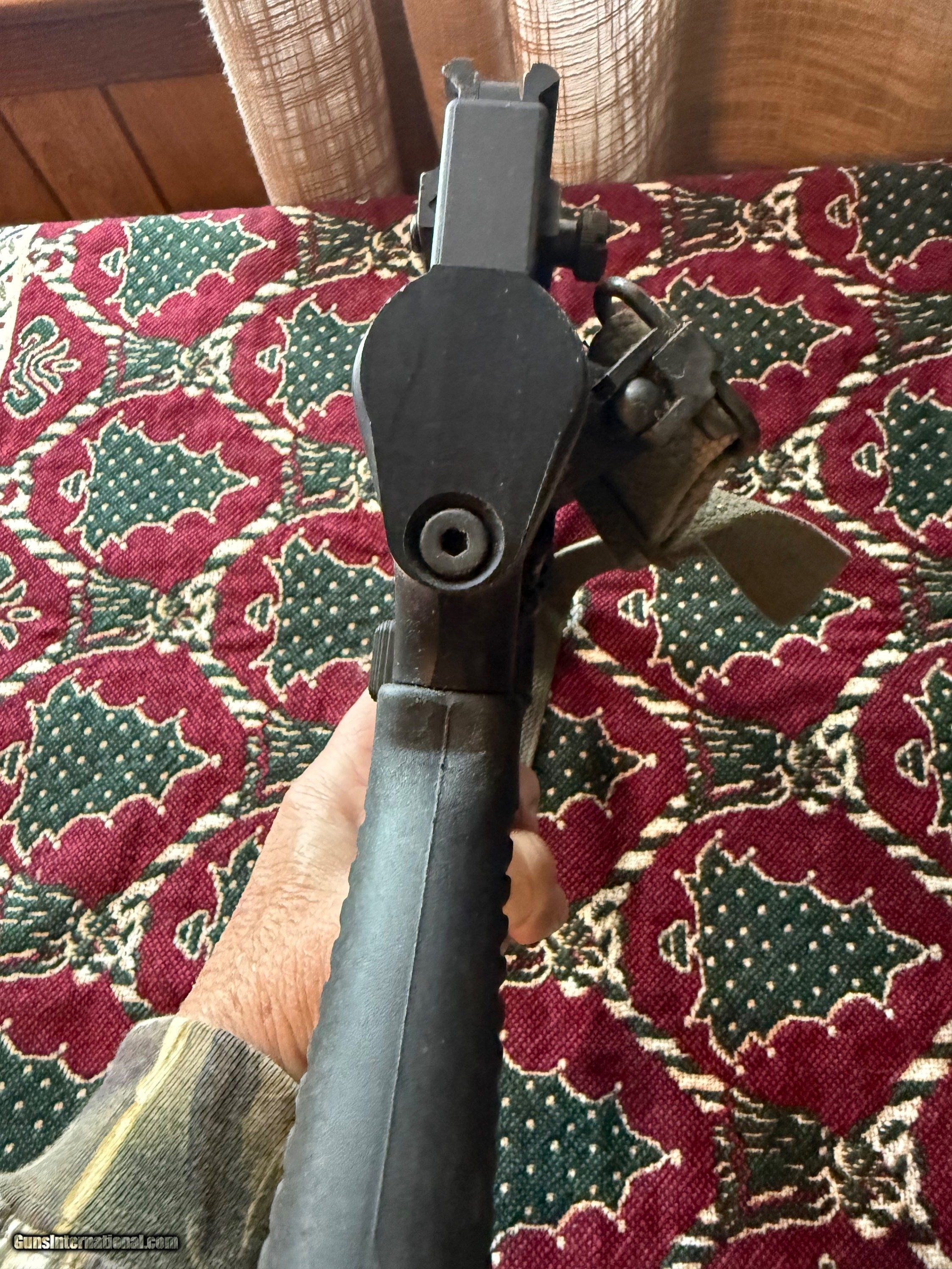 Description: MANUFACTURE: OLYMPIC ARMS, MODEL: A0-96, VERY RARE, CALIBER: .223 / 5.56, BARREL LENGTH: 6", THE MODEL AO-96 WAS STARTED PRODUCED AROUND 1996 TO BYPASS THE 1994 FEDERAL ASSAULT WEAPONS BAN, WITH A FIXED PINNED, AND WELDED 30 ROUND MAGAZINE, IT HAS A BREAK OPEN ACTON TO LOAD WITH STRIPPER CLIPS, WHICH IS NOT INCLUDED, IT LACKS A BUTTSTOCK AND USES A REDESIGNED RECOIL SYSTEM PLACED ABOVE THE BARREL, RATHER THAN IN A BUFFER TUBE, LOOKS TO BE IN GREAT CONDITION, SHIPPING: $45.00, FOR SALE LOCALLY ALSO, Price: $1,100.00 Contact Seller |