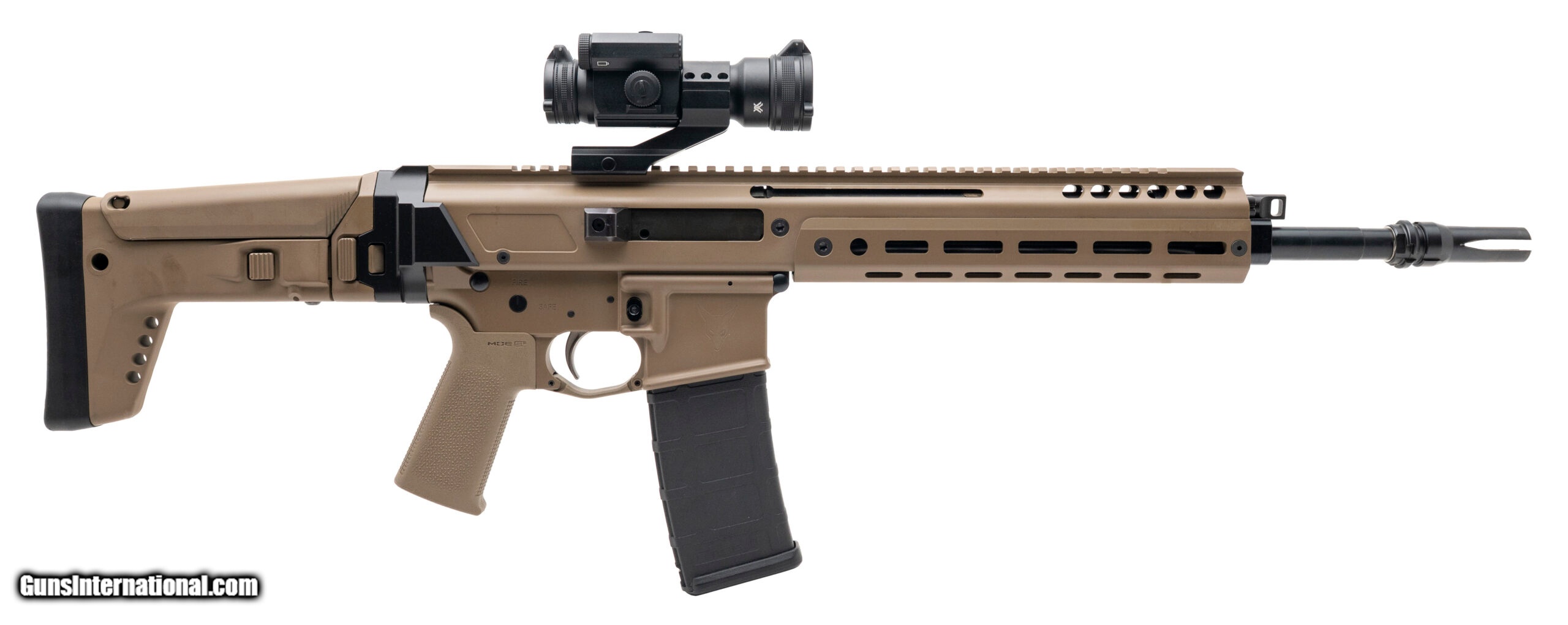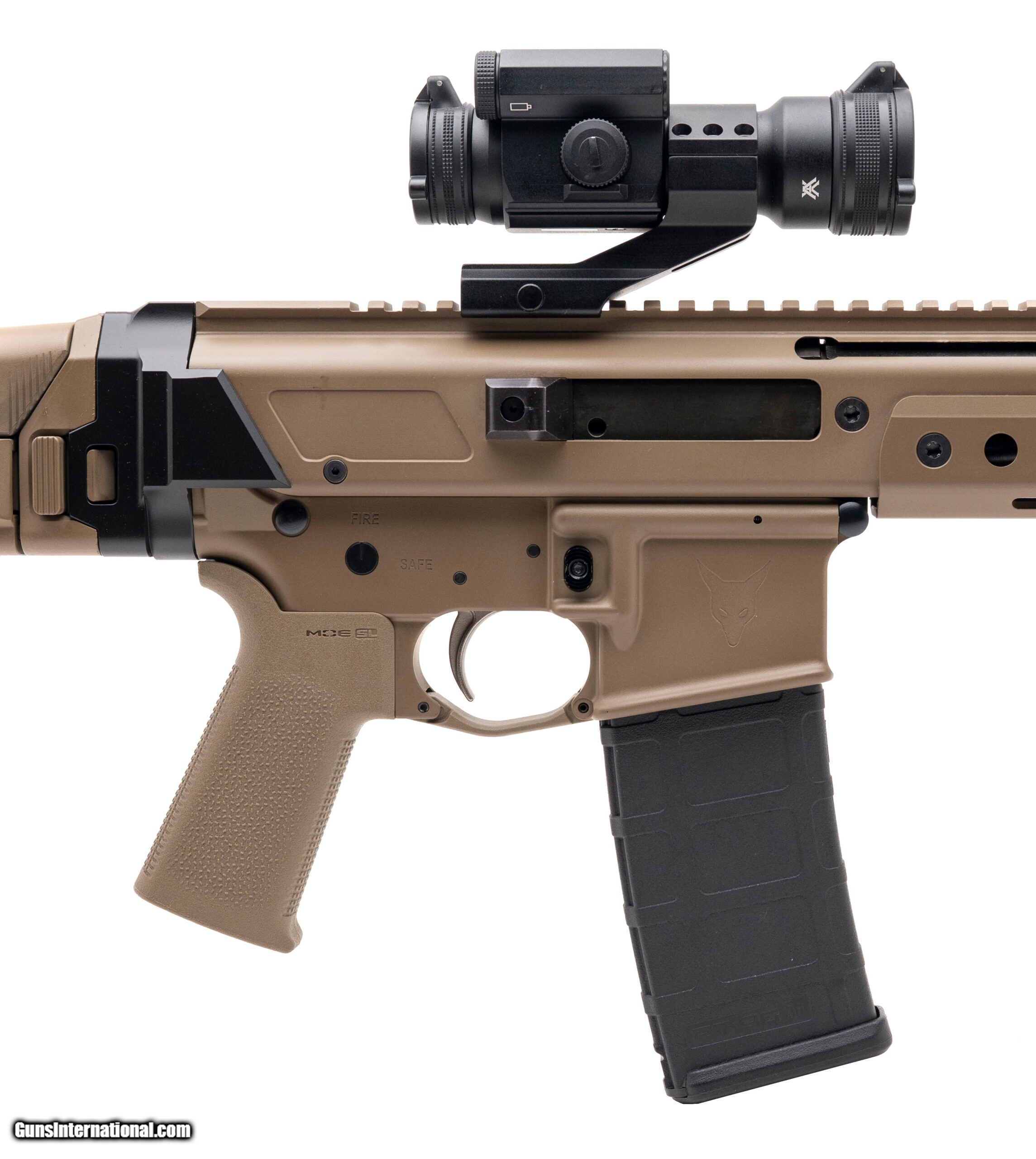 Description: "SN: J5005451. Modern production, 5.56 Nato with a 13.7"" barrel. w/pinned & welded flash hider (16"" OAL) FDE finished tactical rifle with a Vortex Striker Force red dot optic and side-folding stock. Overall condition is very good. Comes with box. SOLD |