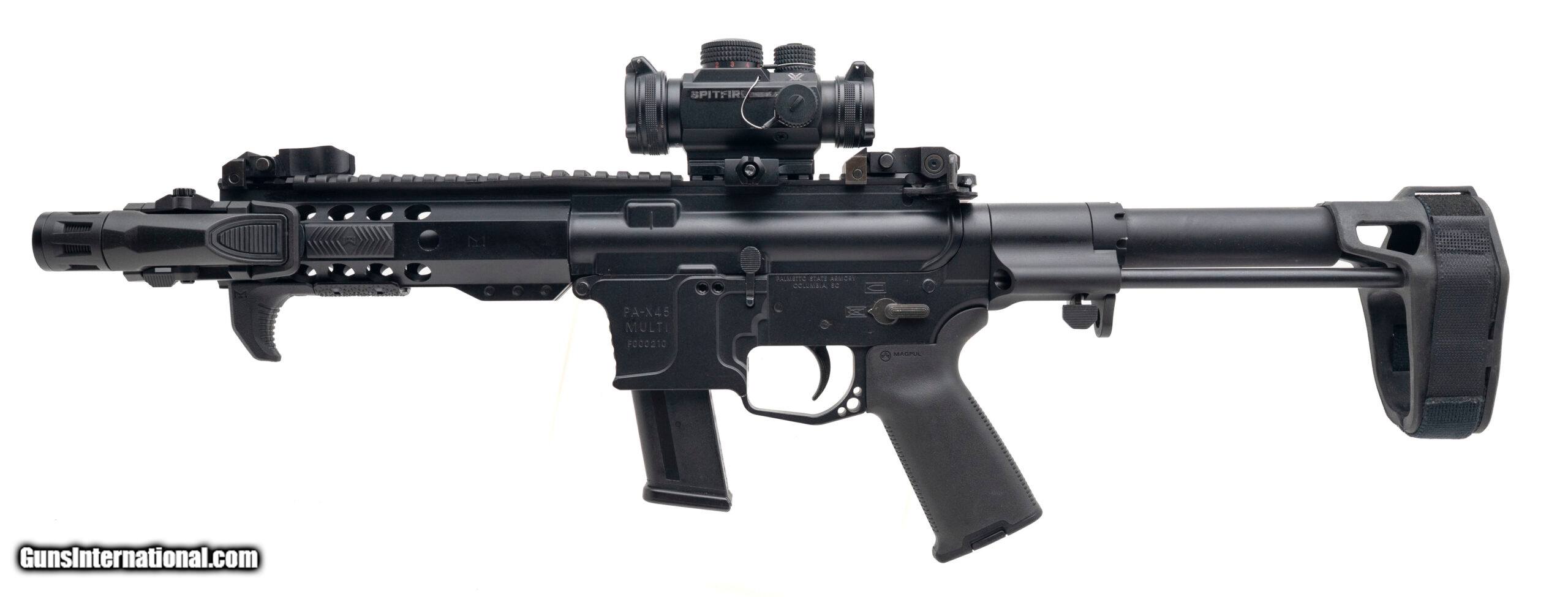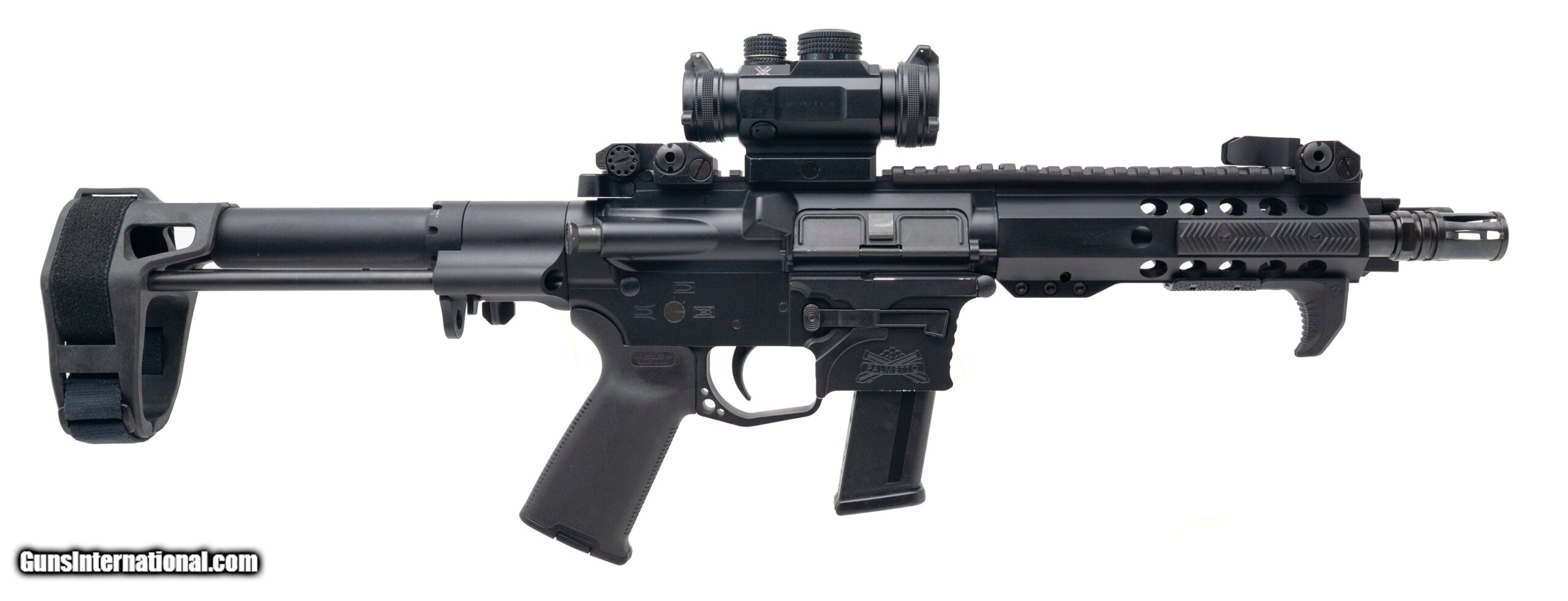 Description: "SN: F000210. Modern production, .45 Auto with a 8"" barrel. Bore is bright with strong rifling. Semi-auto tactical pistol with a Vortex Spitfire circle dot optic, Inforce flashlight, Magpul angled grip, and a PDW style brace. Overall condition is very good. SOLD |