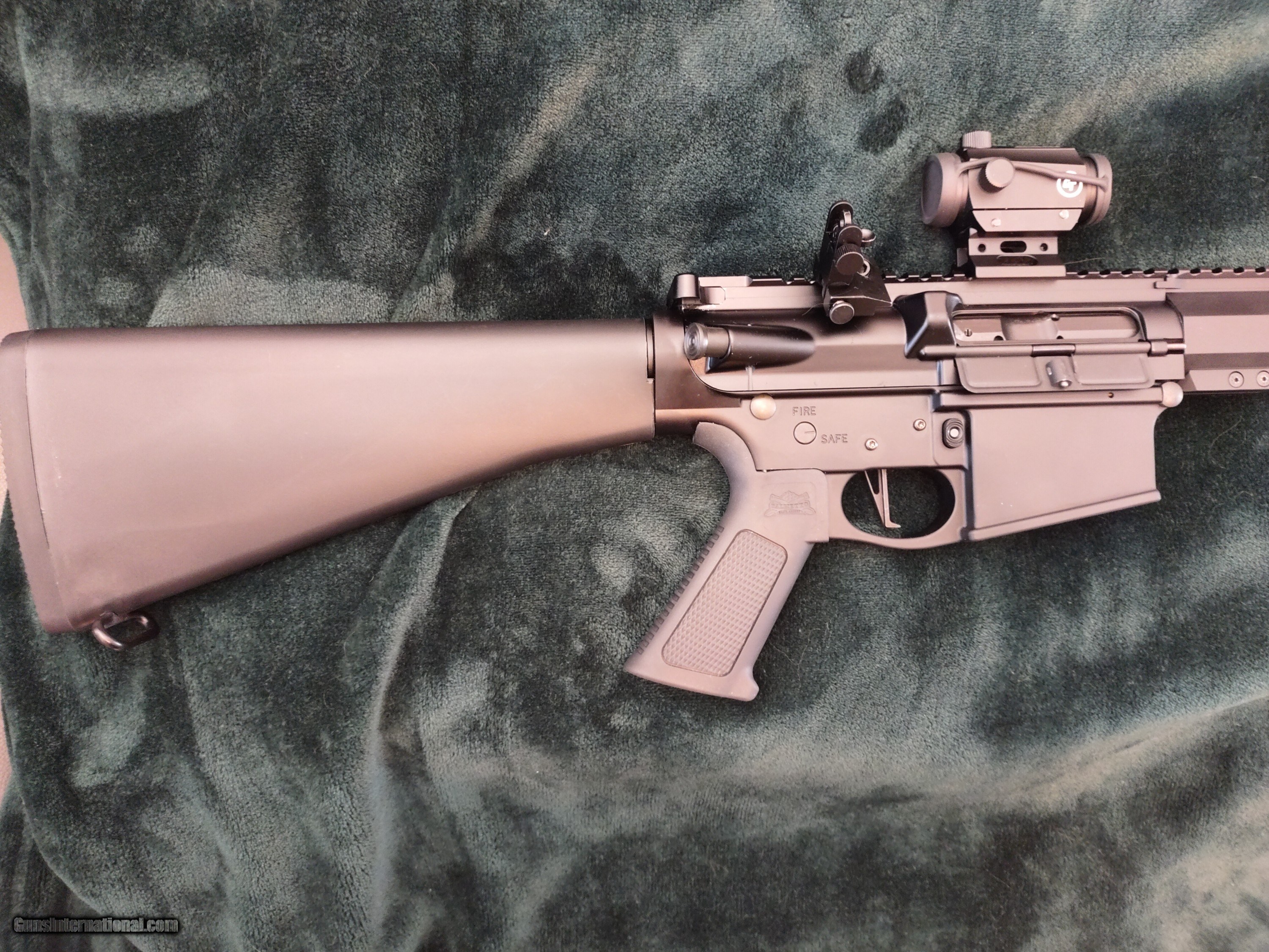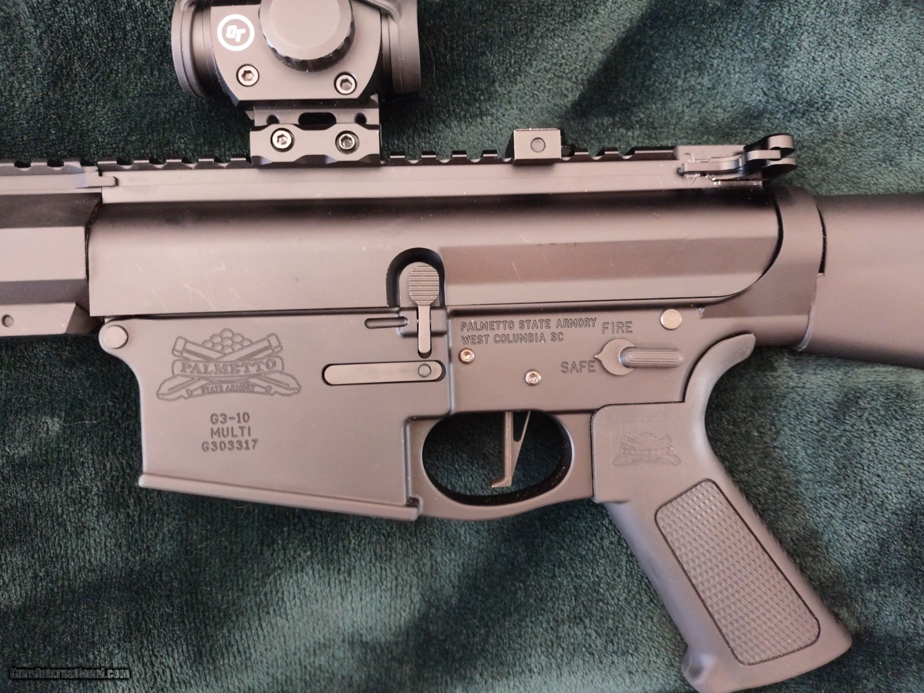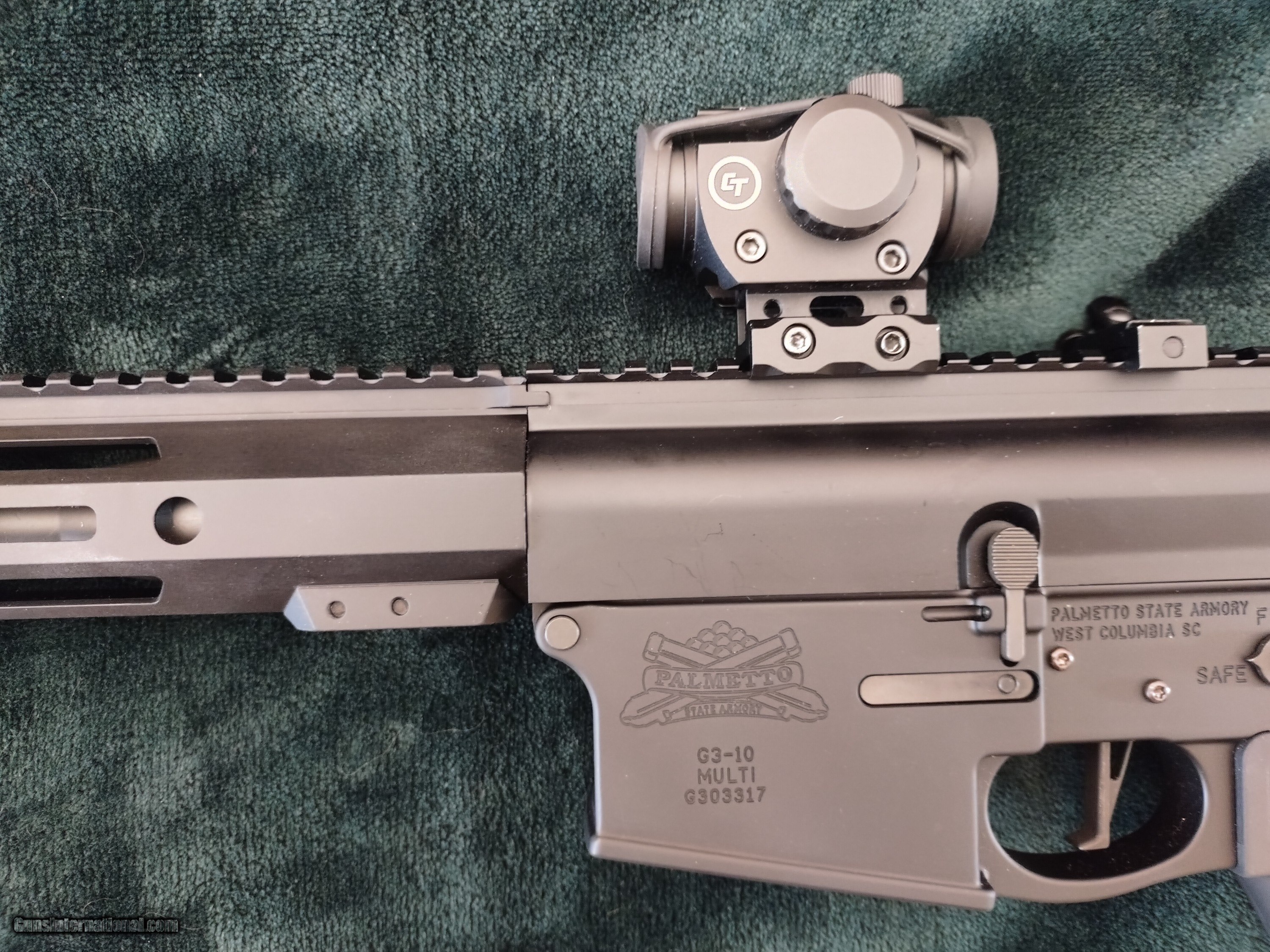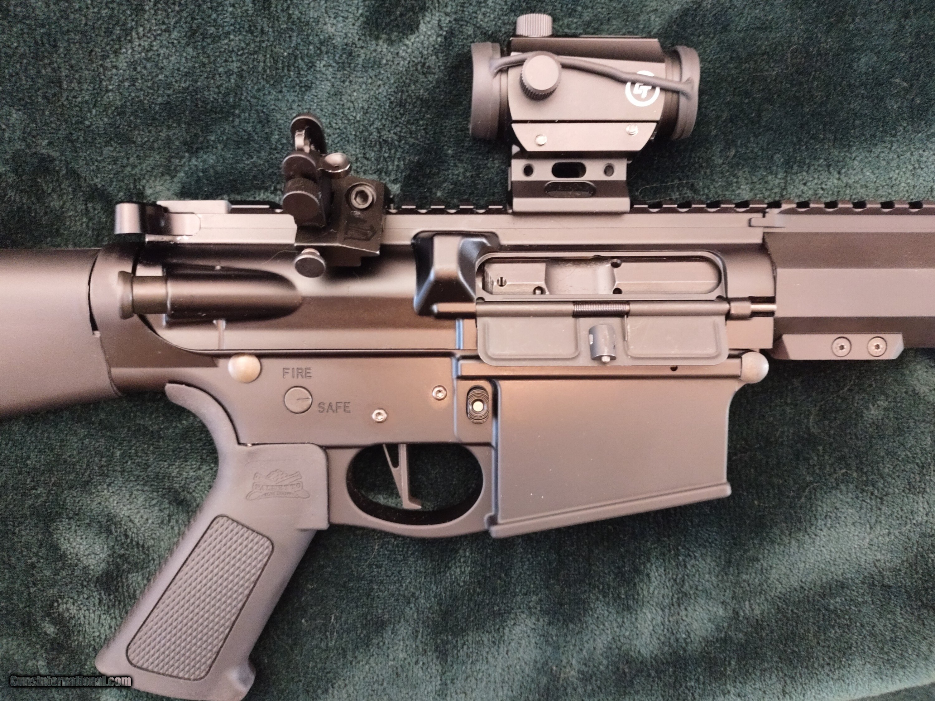 Description: Here is a new AR 10 rifle. A Bear Creek Arsenal upper assembly (including Bear Creek Arsenal BCG) with forward bolt assist. The rifle comes with a heavy barrel (1 in 10 twist) that is Parkerized with a spiral cut flash hider. The lower assembly is by Palmetto State Armory with a CMMG straight trigger and an A2 stock. A full length picatinny rail system with metal BUIS (off-set) and a new Crimson Trace red dot optic. Rifle has a mid length gas system and a full length M-lok handguard with a detachable sling swivel. The rifle comes with (3) twenty round new Mag Pul magazines. The rifle is in new/excellent condition, having been fired one mag for function check and then put back in my cabinet. For additional info or pics feel free to contact me. Thanks for looking. SOLD Rifle Caliber: .308 Winchester Manufacturer: PSA/BCA Model: AR 10 Barrel Length: 18 Condition: New Metal Condition: New Bore Condition: New |