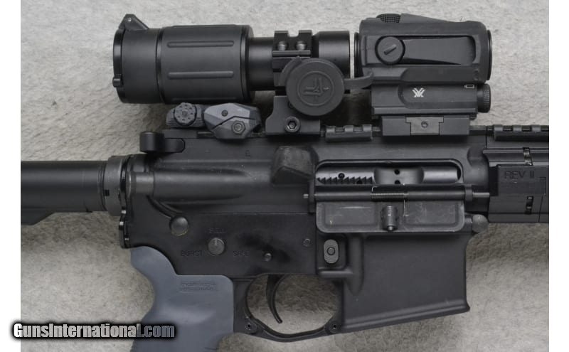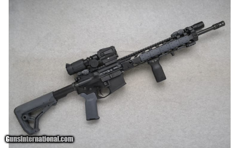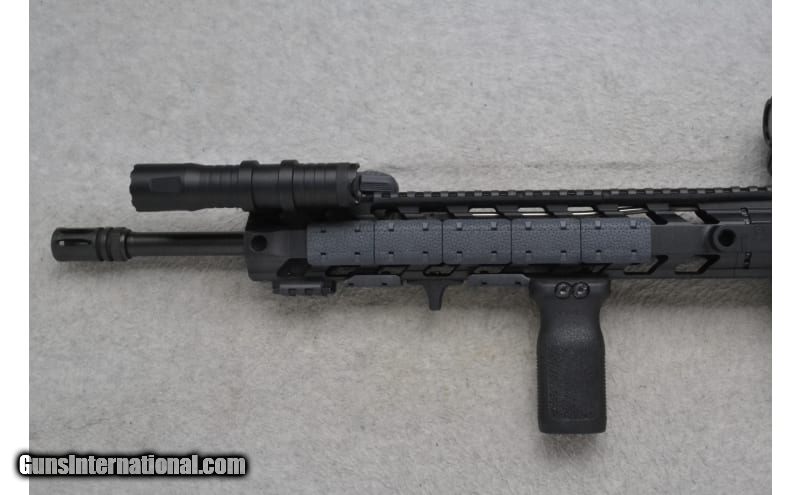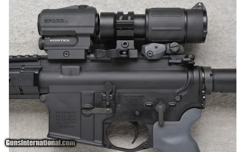 Description: This Palmetto State Armory Model M4 Carbine is a right-hand semi auto rifle in 5.56mm NATO Cal. It has a 16-inch barrel with a 1:8 rate of twist plus a flip-up adjustable post front sight with side protectors and a flip-up adjustable aperture rear sight with side protectors. It also has a Vortex Sparc AR red dot, unbranded magnifier and rail-mounted flashlight. The forearm is a black metal floating handguard with grey polymer covers and a textured grip black polymer front pistol grip. The adjustable buttstock is grey polymer with a black rubber buttpad and a smooth grip grey rubber pistol grip with storage. 5.56x45mm NATO SOLD Chambers: 30 round detachable magazine Bore Condition: Very good Barrels: 16 inches plus flash hider. 1:8 ROT Fore End: Metal free-floating handguard. Front pistol grip. Butt Pad: Black rubber buttpad Weight: 8 lbs 6 oz Sights: Flip-up adjustable post front sight with side protectors. Flip-up adjustable aperture rear sight with side protectors. Vortex Sparc AR red dot plus unbranded magnifier. Item Location: Richfield, WI |