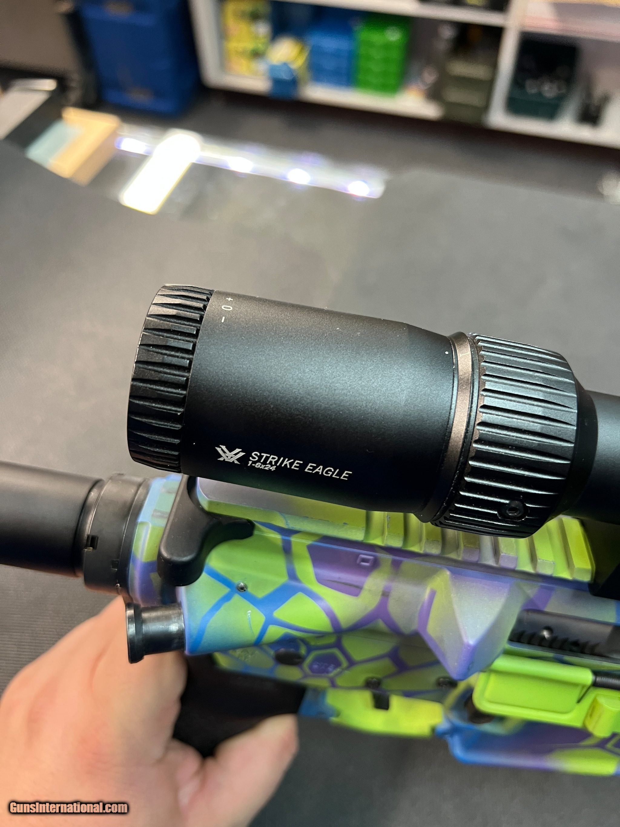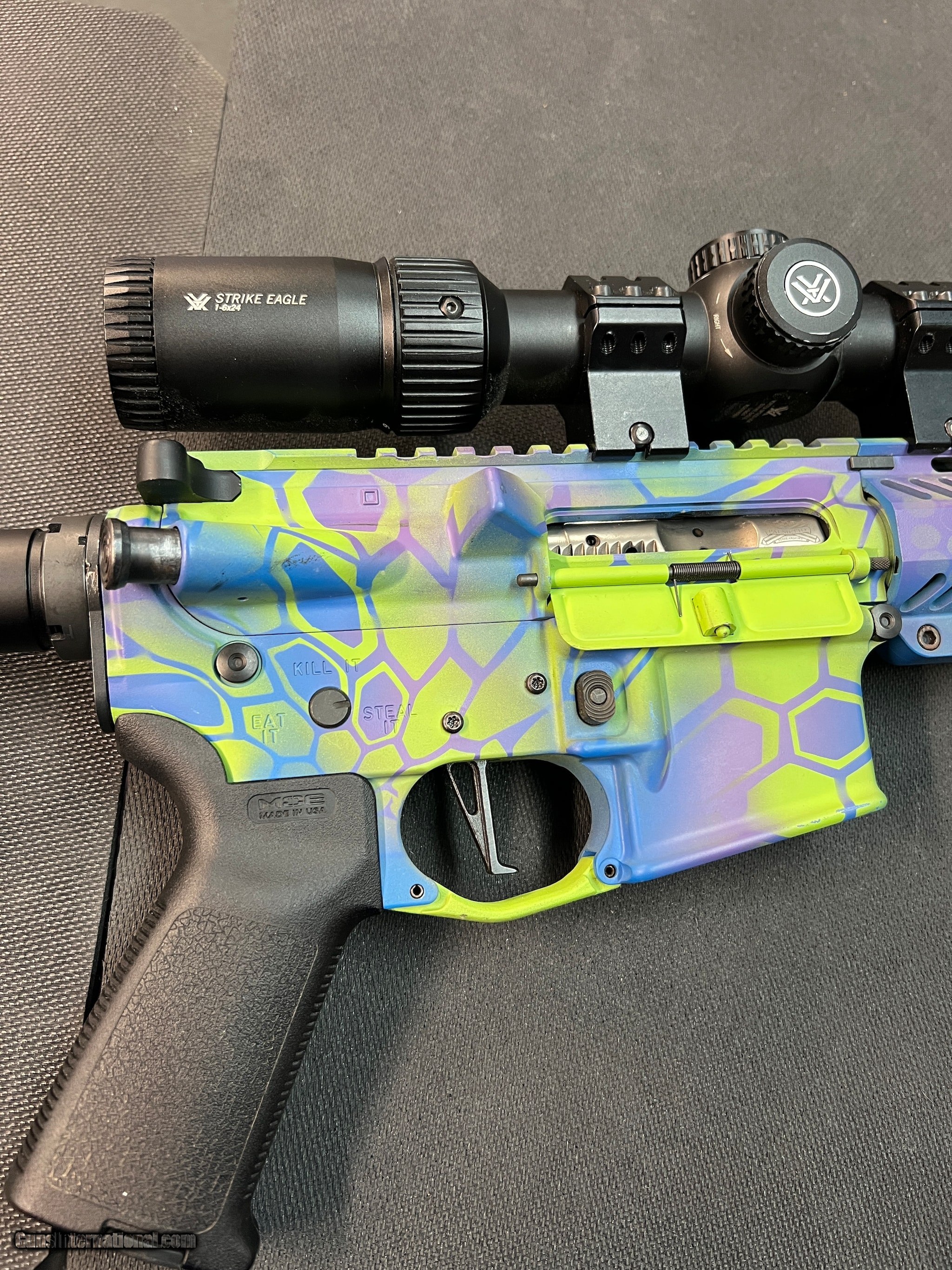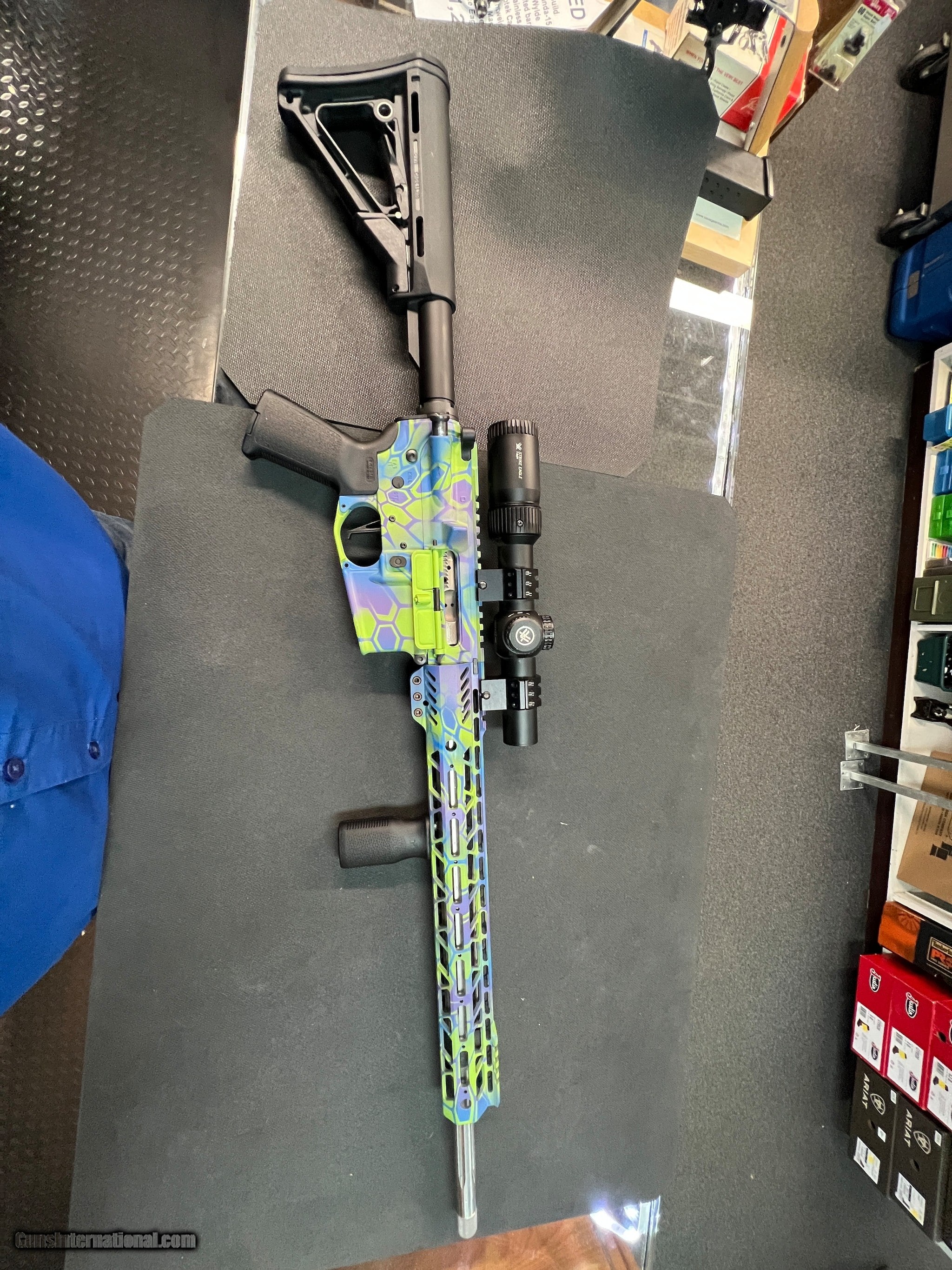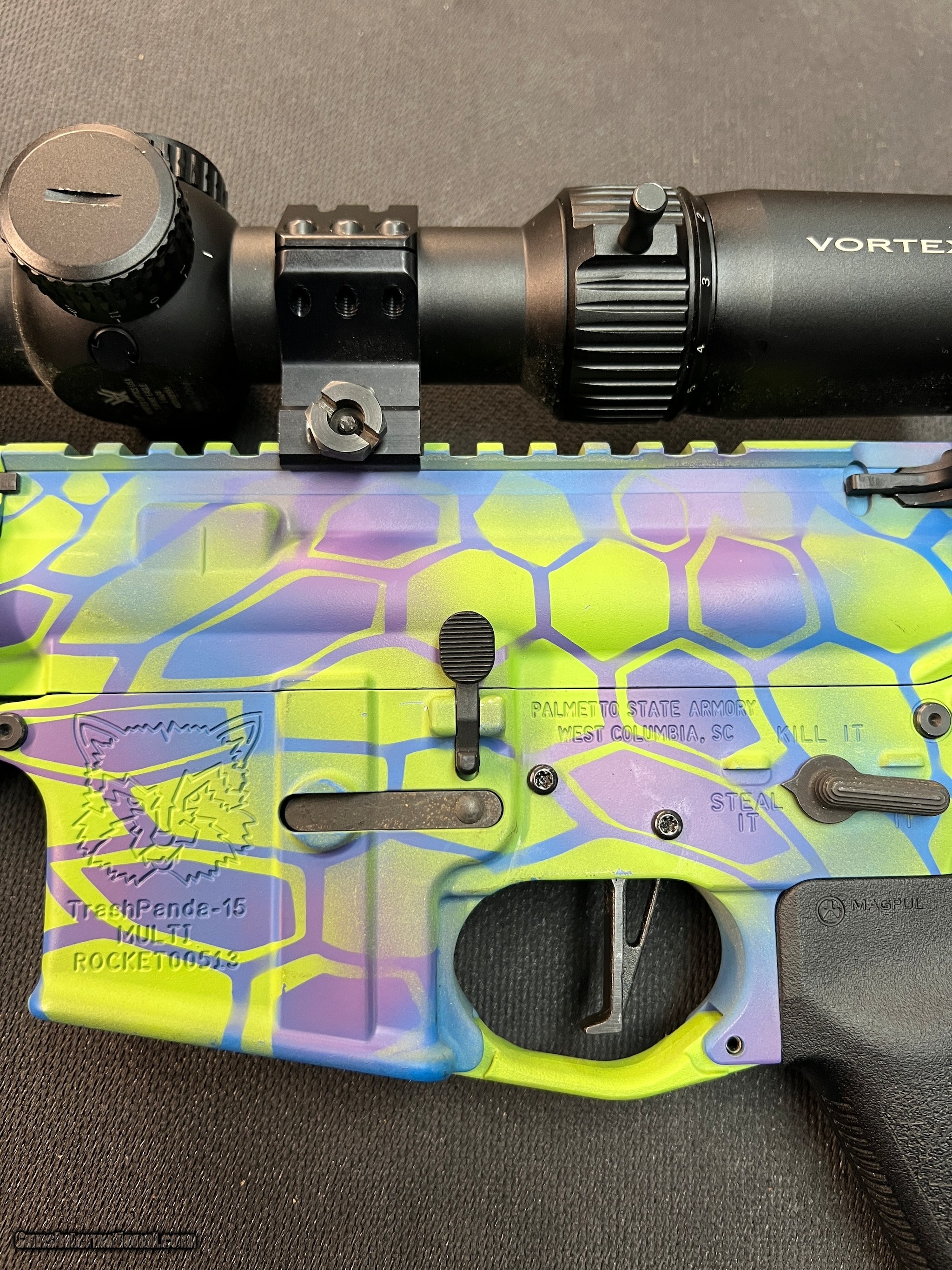 Description: Guns Listing ID: 675953 This is one of my employee‚‚s personal PSA built AR-15. It has many different custom parts including: Custom 18\" Stainless steel heavy fluted Varmint barrel through AAR-15parts Custom cerakoted handguard, lower, and upper receivers (Kryptek (Green, blue, and purple)) CMC custom single-phase flat face trigger Nickel boron PSA BCG All Magpul MOE Furniture Lower receiver is custom (Trashpanda aka Rocket) has a Vortex Strike Eagle LPVO 1-6x24mm tube scope This firearm is one of the best shooting AR platform rifles with custom reload ammunition (not included), Iwas shooting 1/2\" groups at 100yd. Factory ammo not far from that SOLD Manufacturer: PALMETTO STATE ARMORY Model: trashpanda-15 Caliber Info: .223 WYLDE Condition: Used - Non-Certified Barrels: 18 BARREL Finish: KRYPTEK CAMO |