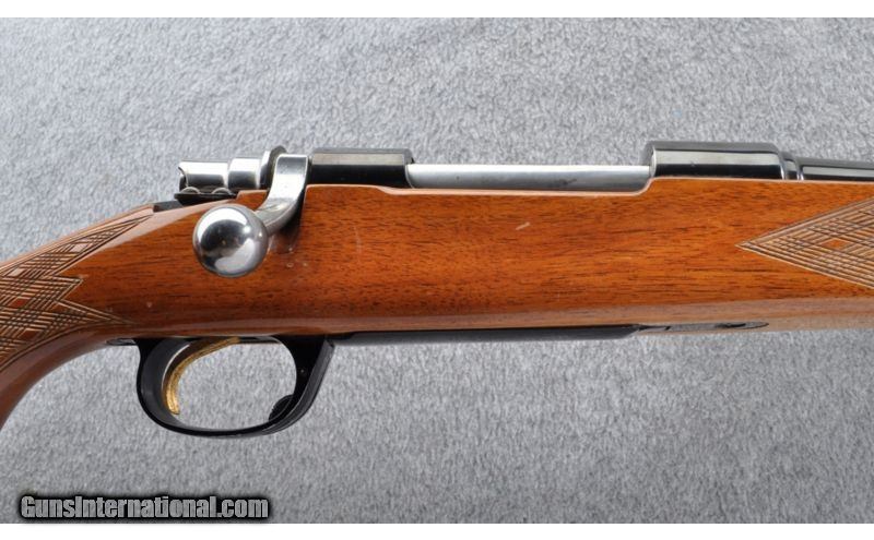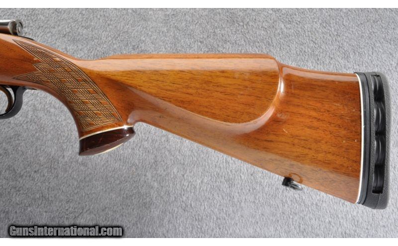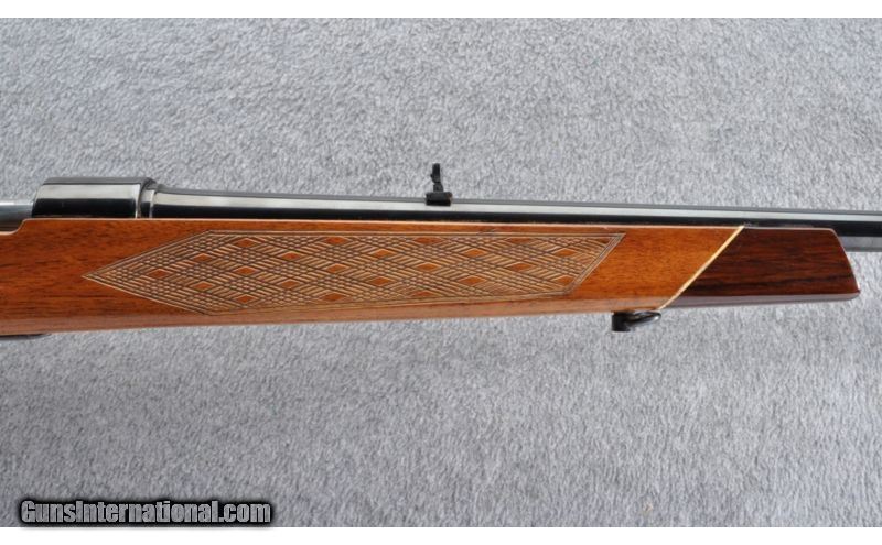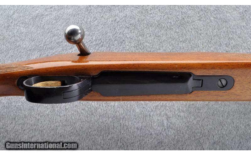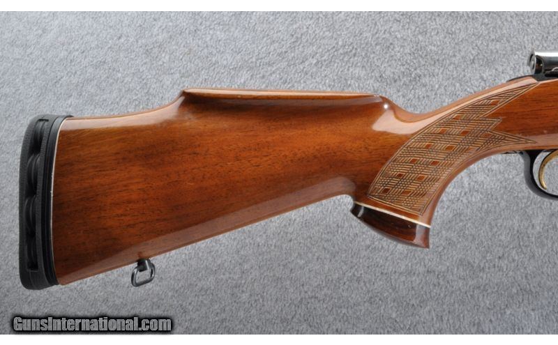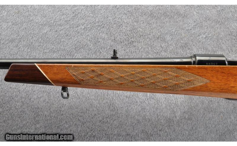 Description: Imported by Jana of Denver, Colorado most likely in the 1970's SOLD Caliber Info: 6MM Remington Metal Condition: Very good showing a few light field marks on the trigger guard & floor plate. a small area of surface pitting at the left side of the barrel near the receiver Wood Condition: Very good showing a scattering of small marks and dents Bore Condition: Sharp with bright rifling Barrels: 24 Stock: Skip line checkered pistol grip stock with rollover cheek piece and rose wood grip cap and fore end tip Stock Dimensions: 14" LOP Butt Pad: Limbsaver not original to the rifle Weight: 7 lbs 8 oz Sights: Flip-up adjustable leaf rear with Hooded blade front Item Location: Grand Junction, CO |