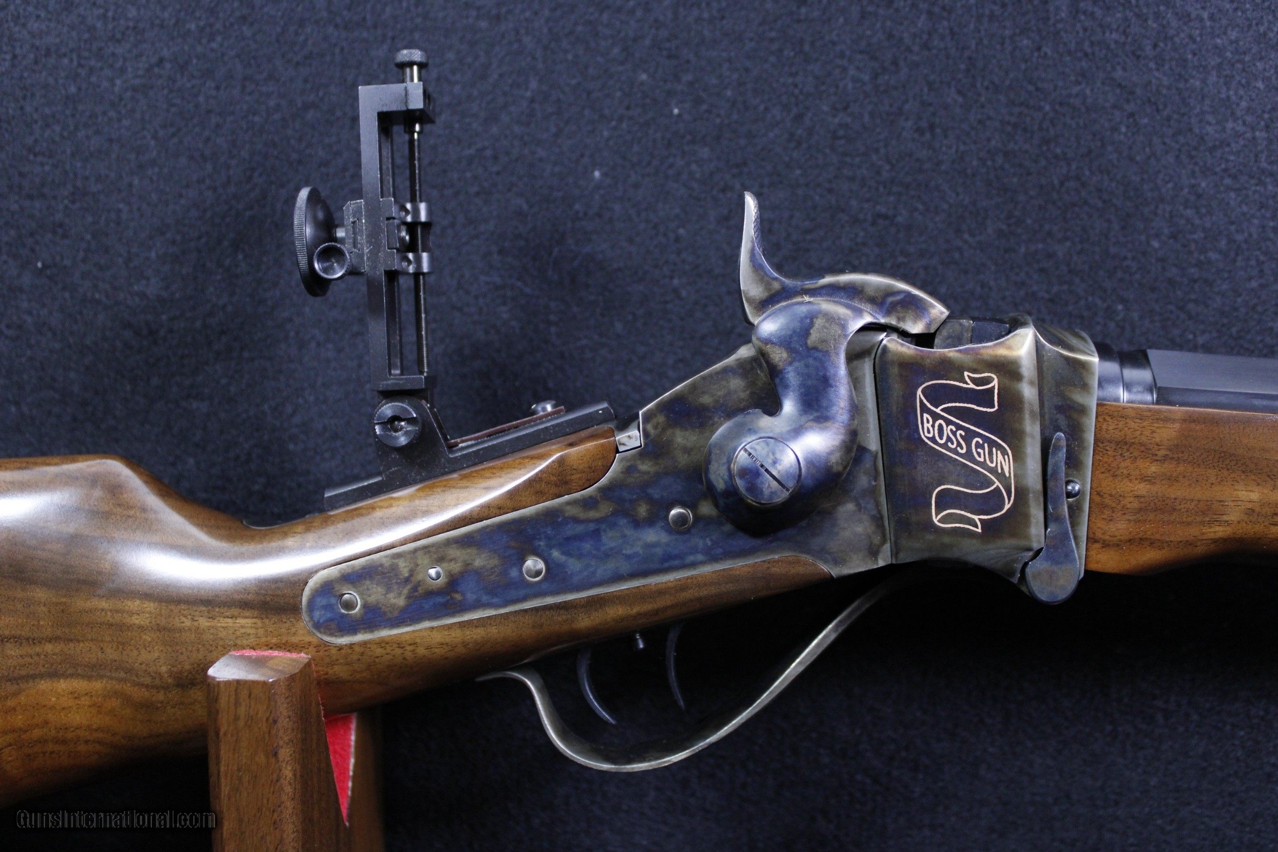 Description: New in box D. Pedersoli/Taylor's 1874 Sharps Boss Rifle chambered in .45-110 Win. This rifle has a beautiful walnut stock and a receiver boasting some rather gorgeous case colors with "Boss Gun" in gold inlay. Octagon heavy barrel, creedmoor tang sight and double set triggers complete the classic look of an old west era rifle. Dimensions are as follows; BBL. 34" WT. 13lb. 2oz. DIM. 14 1/8" L.O.P. SOLD |