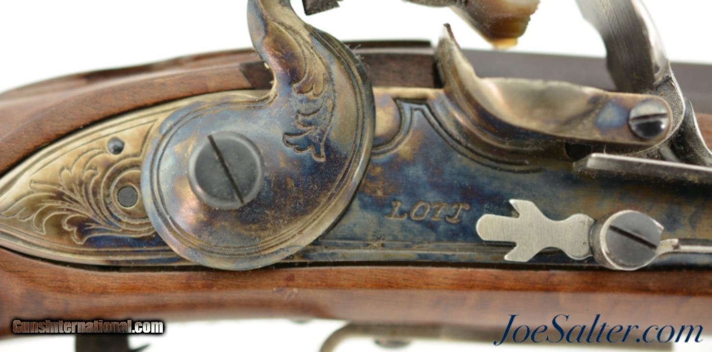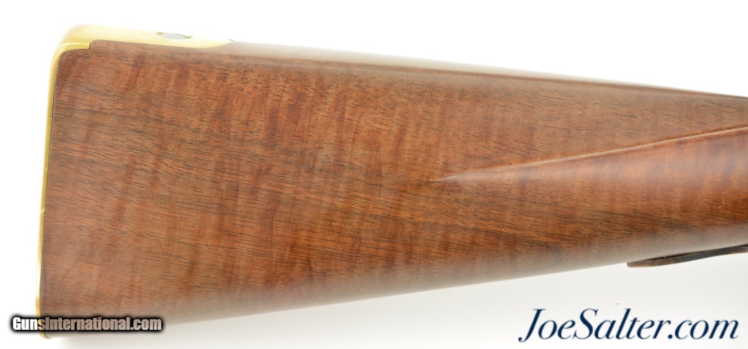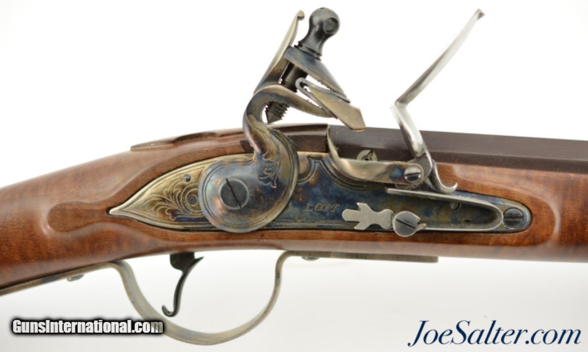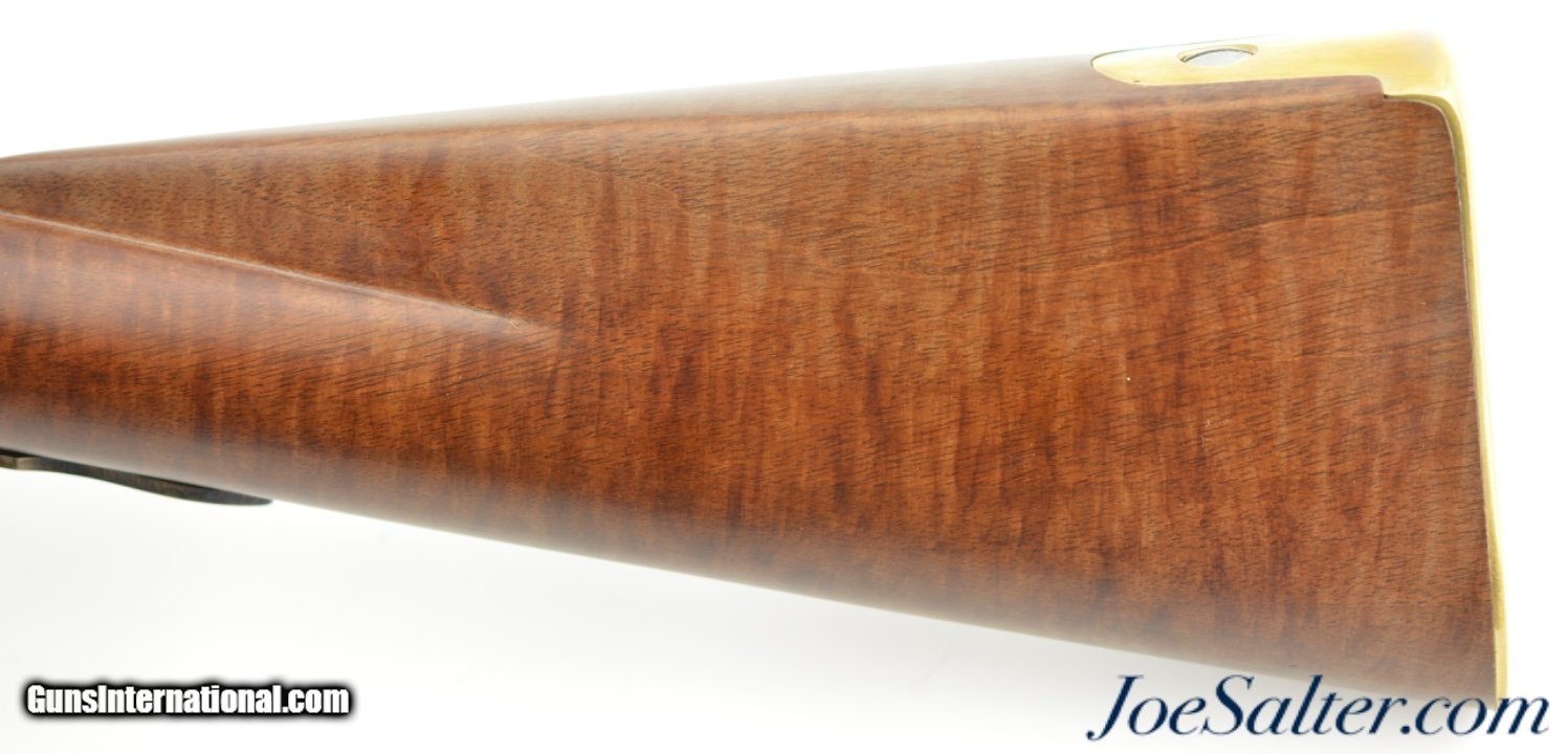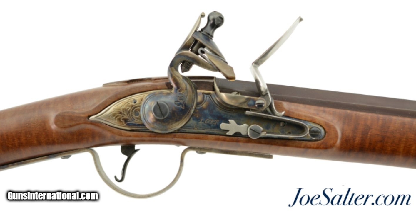Description: Serial #DA137289, 20 Bore (.62 Caliber), 36" part octagon barrel with an excellent, bright bore. This is a modern take on the classic 18th century trade musket and features an attractive octagon breech barrel with wedding band transitions to round, a color case-hardened "LOTT" marked lock, and nicely figured, full length, pin-fastened walnut stock. The barrel retains practically all of the original browned finish, with a commensurate amount of original color case-hardening on the lock and trigger guard. The stock has virtually no handling marks or wear, the brass sea serpent sideplate is still bright, and the original brass-tipped ramrod is present. The musket is housed in the original shipping box with the original papers and DVD instructional video. This is a very handsome and well made musket that is in virtually unused condition overall. Antique; SOLD |