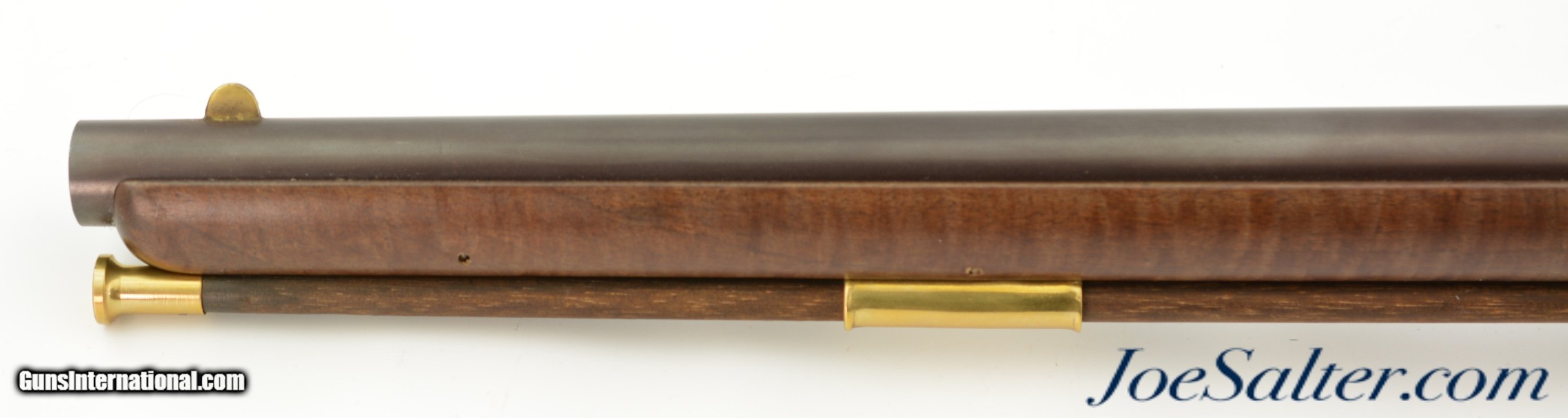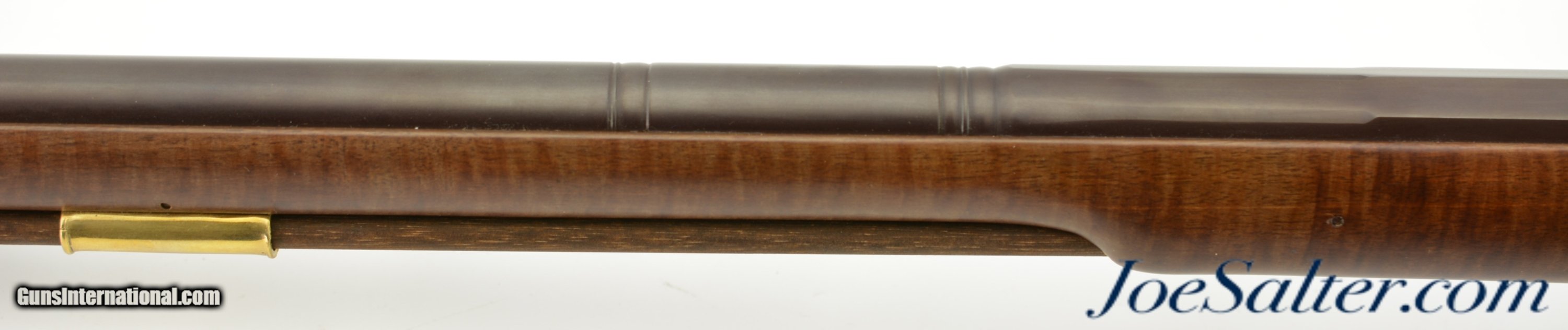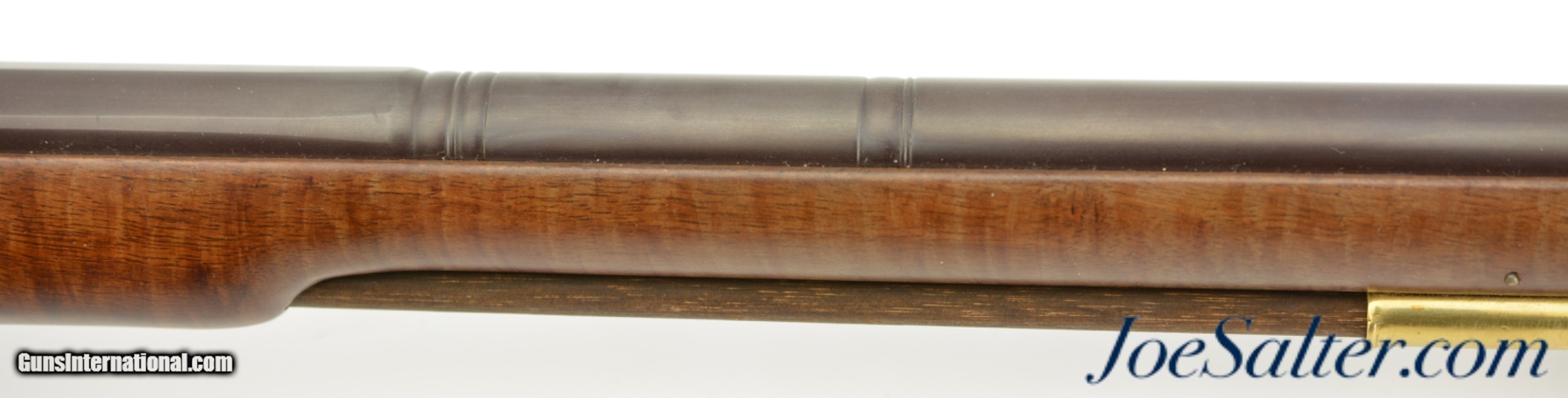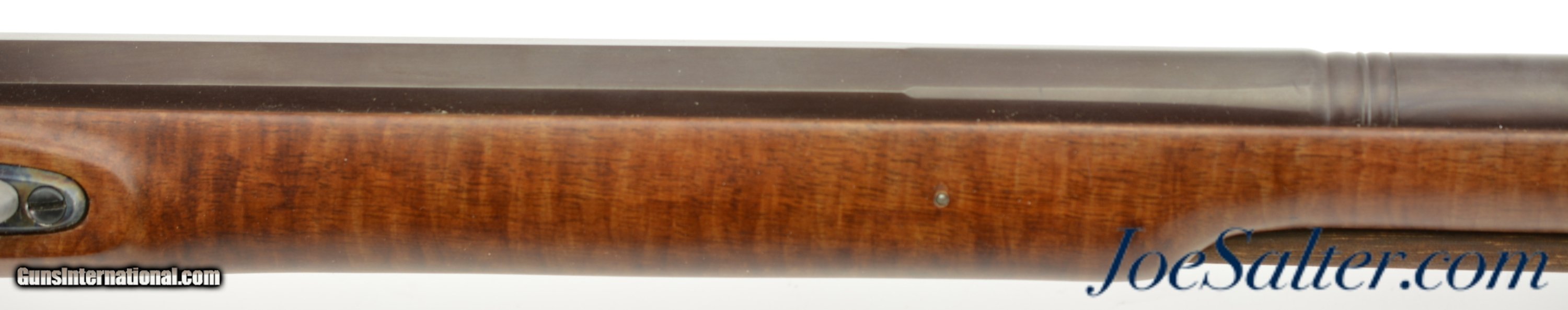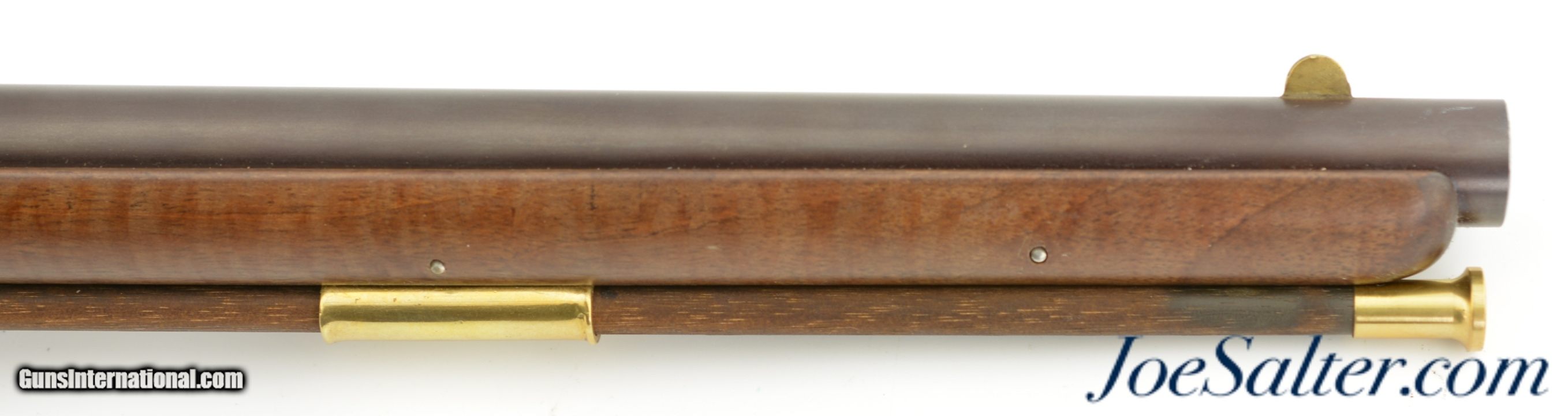 Description: Serial #DA137289, 20 Bore (.62 Caliber), 36" part octagon barrel with an excellent, bright bore. This is a modern take on the classic 18th century trade musket and features an attractive octagon breech barrel with wedding band transitions to round, a color case-hardened "LOTT" marked lock, and nicely figured, full length, pin-fastened walnut stock. The barrel retains practically all of the original browned finish, with a commensurate amount of original color case-hardening on the lock and trigger guard. The stock has virtually no handling marks or wear, the brass sea serpent sideplate is still bright, and the original brass-tipped ramrod is present. The musket is housed in the original shipping box with the original papers and DVD instructional video. This is a very handsome and well made musket that is in virtually unused condition overall. Antique; SOLD |