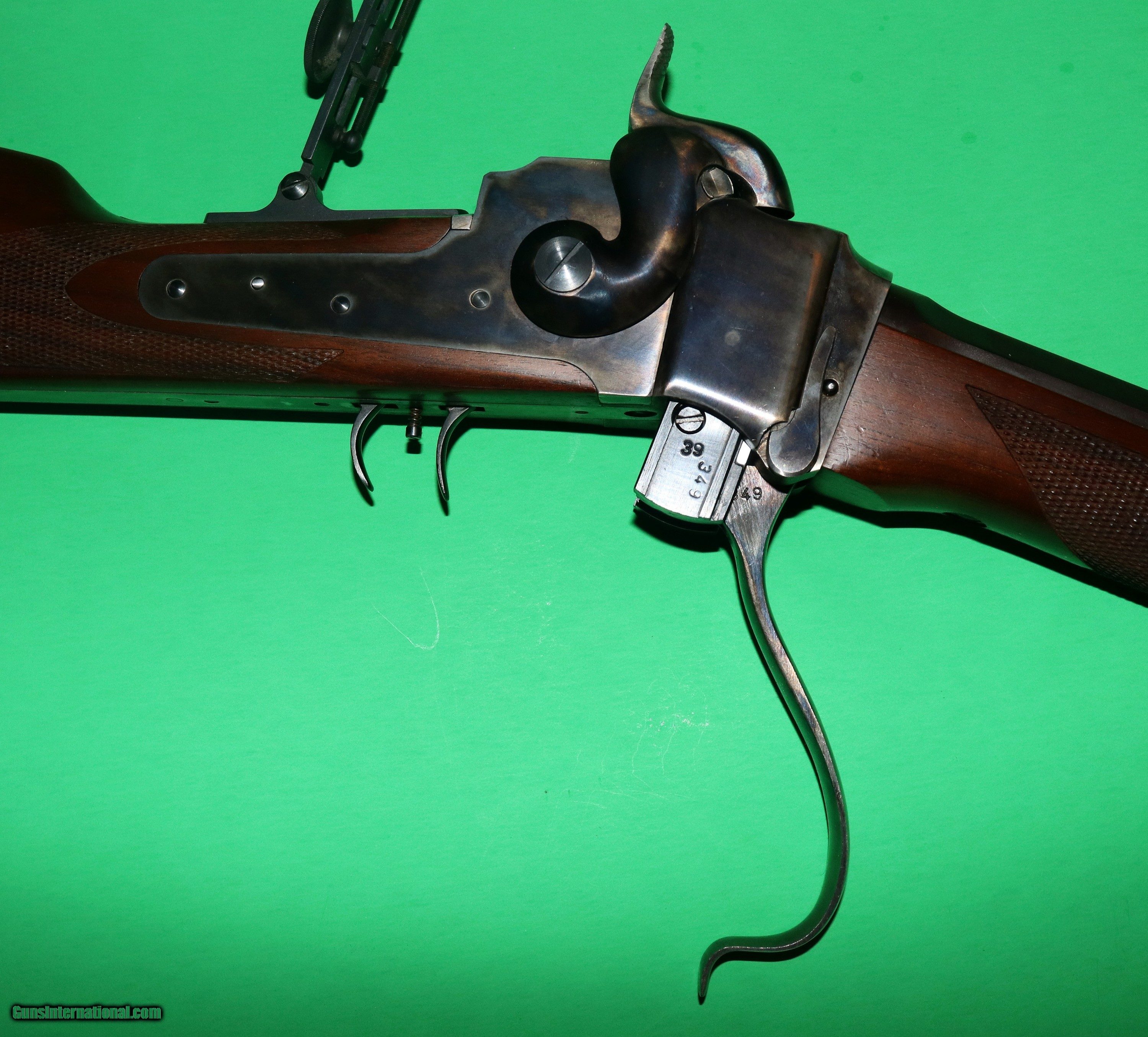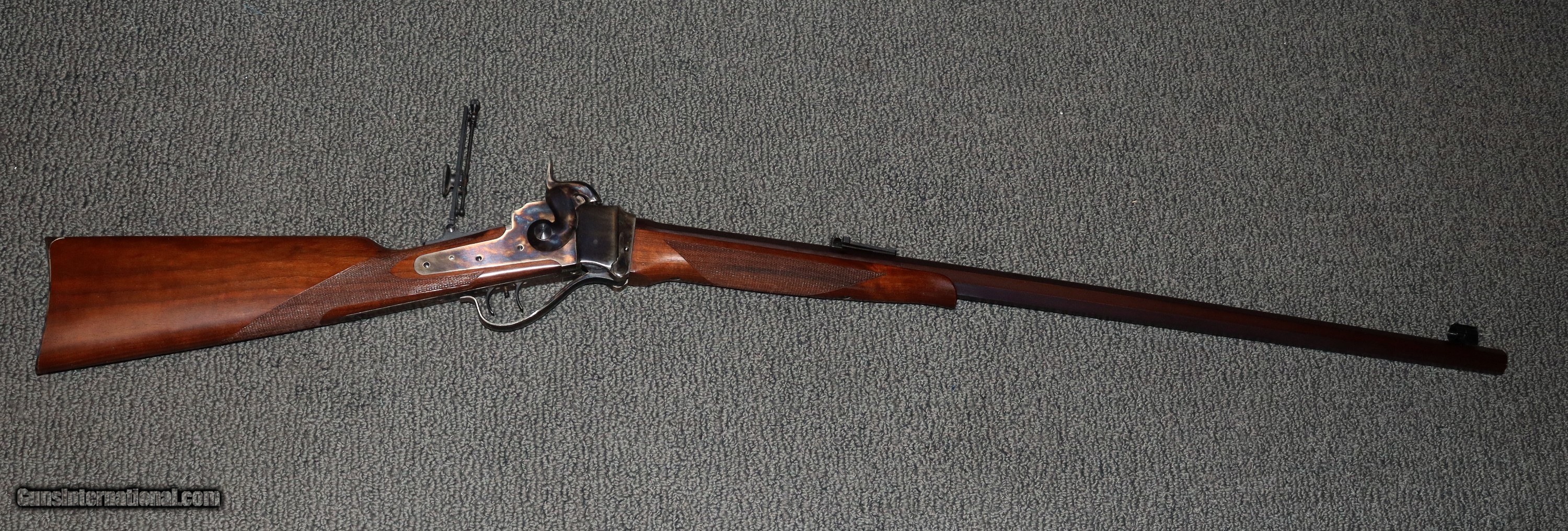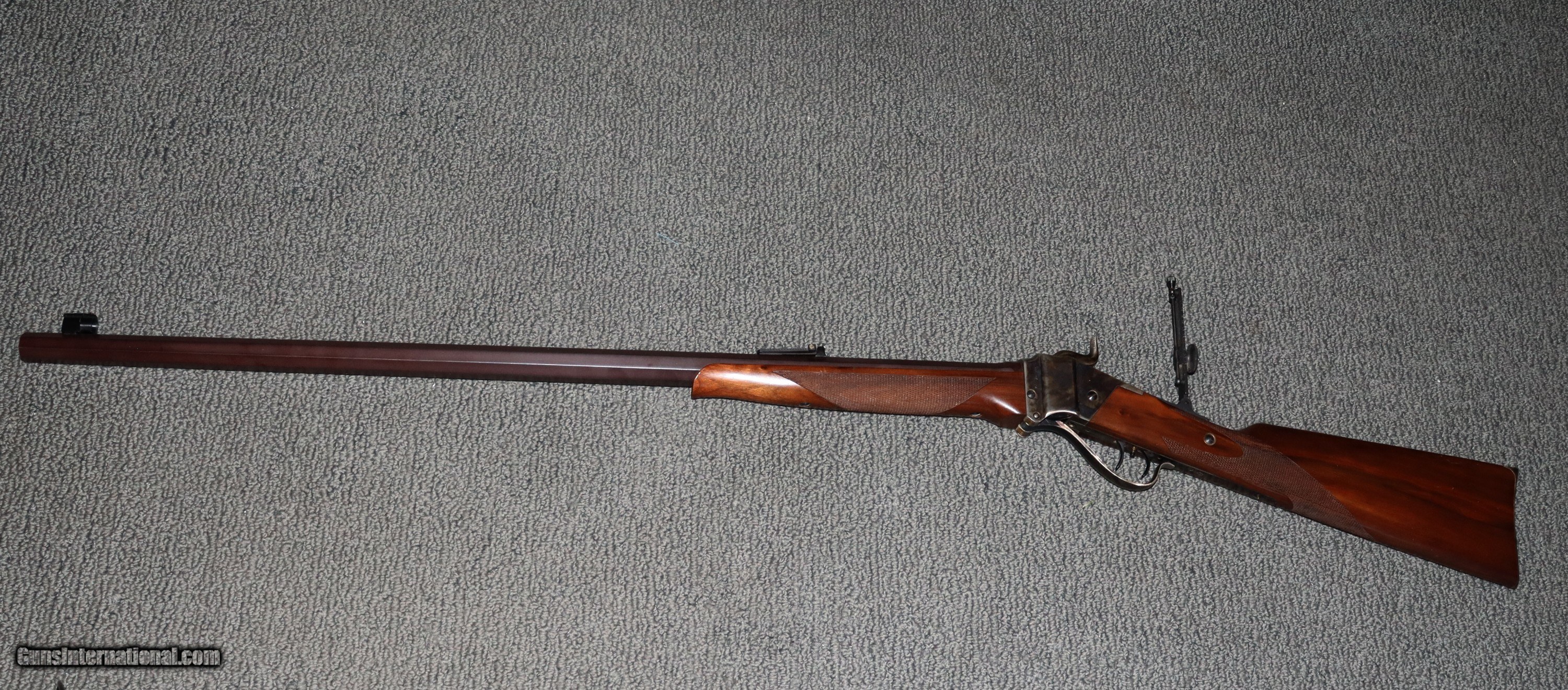Description: This is a Pedersoli, Sharps 1863 (or 1859) breach-loading, paper-cartridge, black-powder Sharps reproduction. The caliber is .54, black-powder. The condition is as good as you will ever see in a used firearm. This firearm was a transition from muzzle-loading and ultimately metallic cartridge. It has a falling block design that opens the breach. Then a paper-cartridge is inserted. They are made by wrapping high-flammability paper (that you can buy or make) around a .54 caliber bullet, adding black-powder and twisting the end. The lever-action falling-block is then elevated, sealing the breach. Ignition is by a percussion cap. I did shoot this rife several times. I didn't bother making the paper-cartridges. Instead, I simply inserted the bullet with one or two Pyrodex pellets, added the percussion cap and fired. The rifle is very heavy with gorgeous wood and sharp, very precise checkering. The receiver and non-barrel parts are case-hardened with the case-hardening fresh and unfaded. The 32” barrel is very heavy and octagonal, finished in a dark, dark brown. The rifle has adjustable set triggers for a very light trigger pull (adjustable to even lighter if you wish) Front sight is as indicated in the photos. There are two rear sights. The first is the standard, “ladder-type” and the other is an additional tall “Creedmore” type. I purchased this firearm with the additional sights so I don't know what their brand is nor what they would cost. I have seen similar for $350 and up. Perhaps a reader can identify them. I assume this is a 1863 model rather than the 1859 model which appears identical to me. The Pedersoli pictures don't provide any visible differences except for stock designs. I have taken a great many photos of this elaborate rifle and I will supply others, if necessary, upon request. I will ship this firearm either USPS-ground or UPS-ground. I believe that it does not qualify as a “firearm” under NFA rules. So... I can ship to an individual but I will require adequate identification. Shipping costs, plus insurance and signature confirmation will be required. I cannot ship to NY, NJ, Conn. Or Mass unless we make arrangements to comply with those states specific requirements. The rifle is approximately 50” overall and weights about 12 pounds. SOLD Rifle Caliber: .54 Manufacturer: Pedersoli Model: 1863 Serial Number: SS33349 Barrel Length: 32 Condition: Excellent- No wear Metal Condition: Excellent- No wear Wood Condition: Excellent-No wear Bore Condition: Excellent Action: Falling Block Weight: 12 Pounds Sights: Regular and Added Creedmore Manufacture Date: 2011? |
