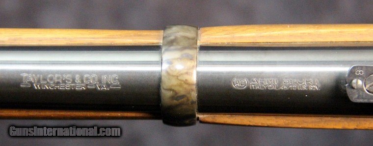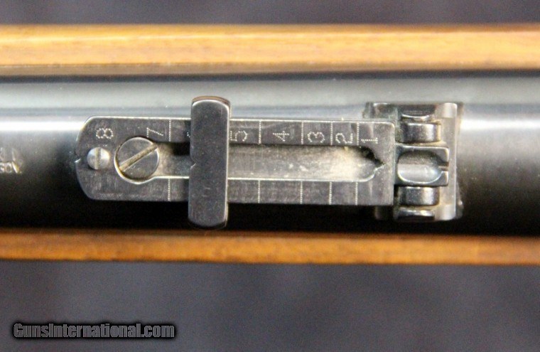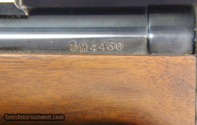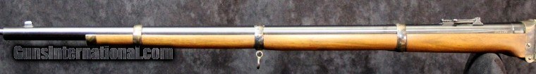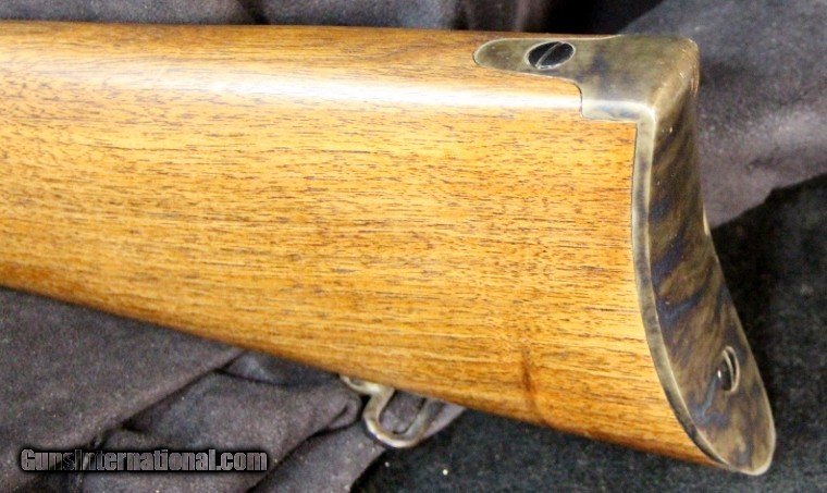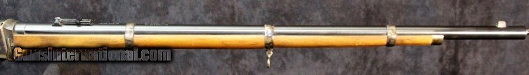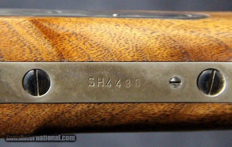 Description: .45-70, #SH4430, 30 inch barrel, blue and case collor finish, walnut stock with military style forearm, '59 style patch box, original sights, double set trigger, sling swivels. Condition: excellent bright bore, missing spring for middle barrel band, looks as new, no box. SOLD |