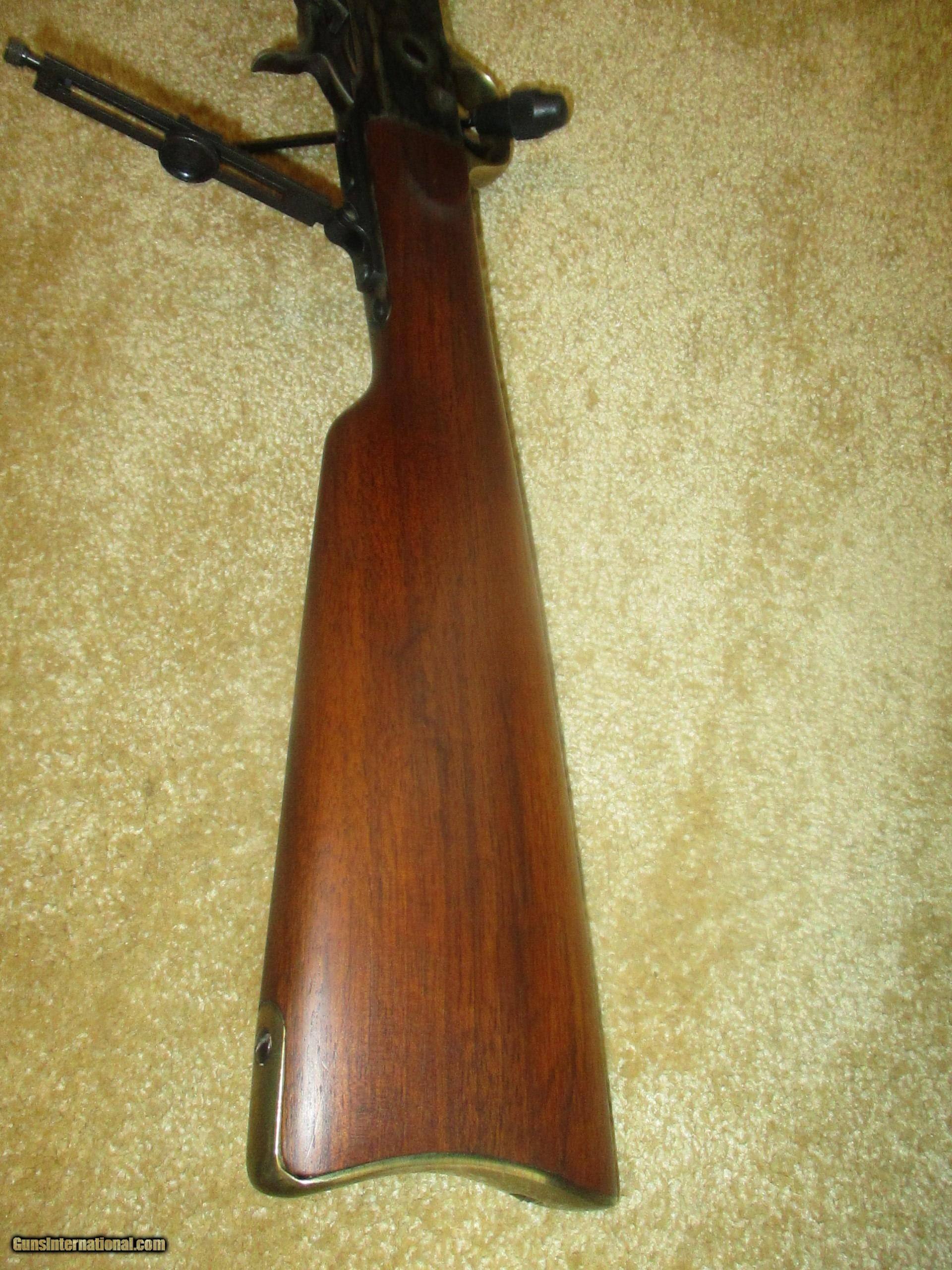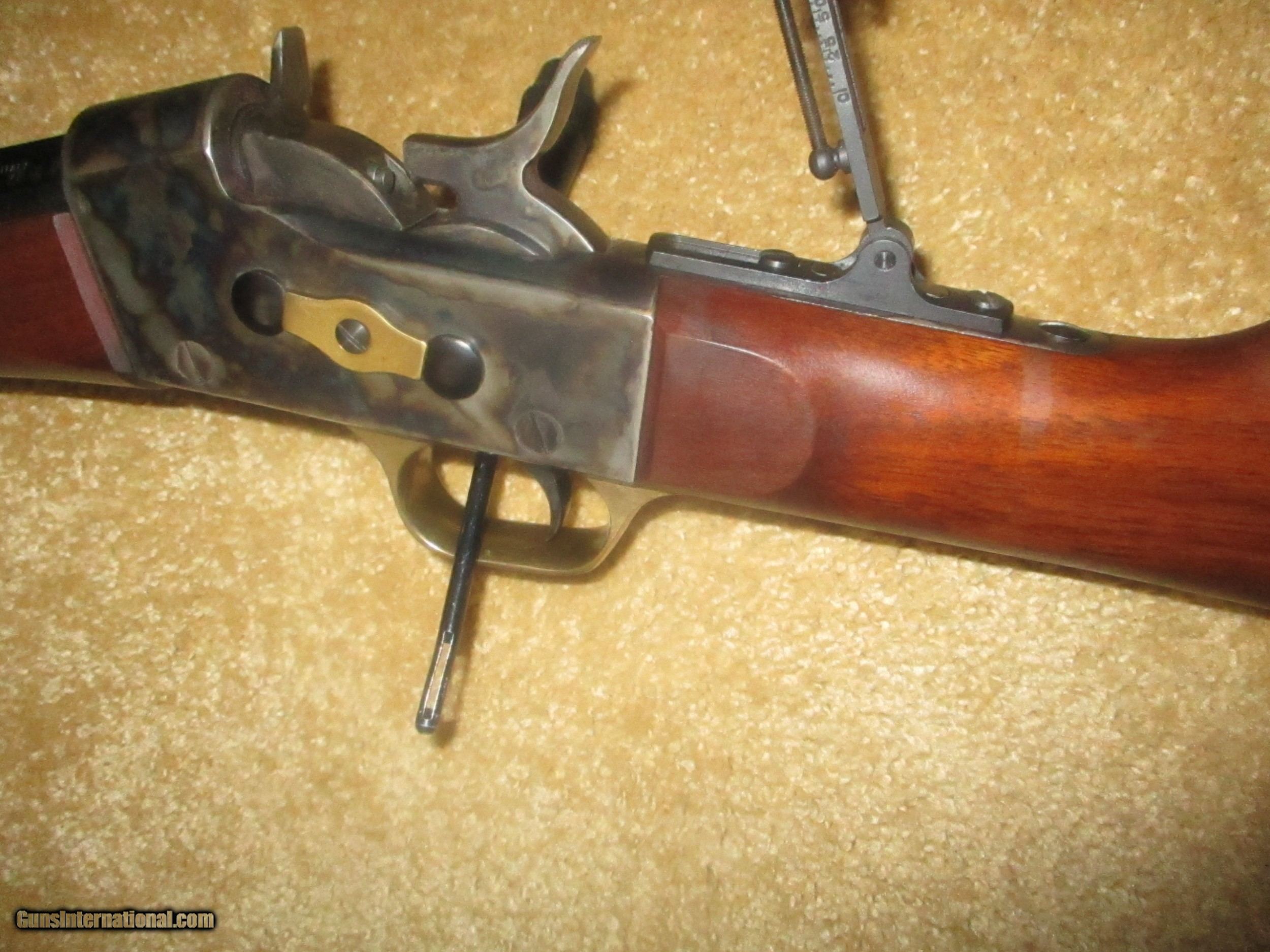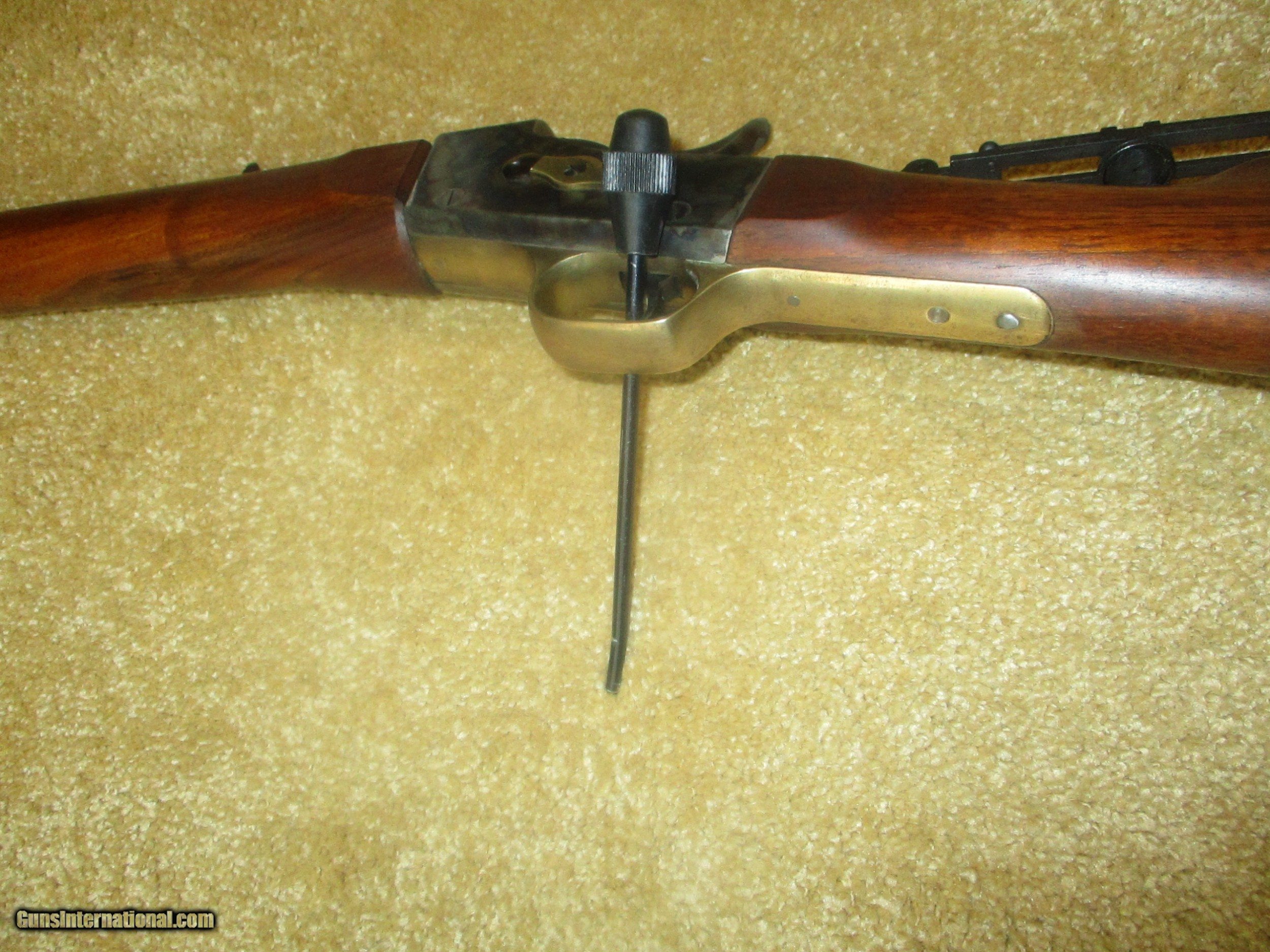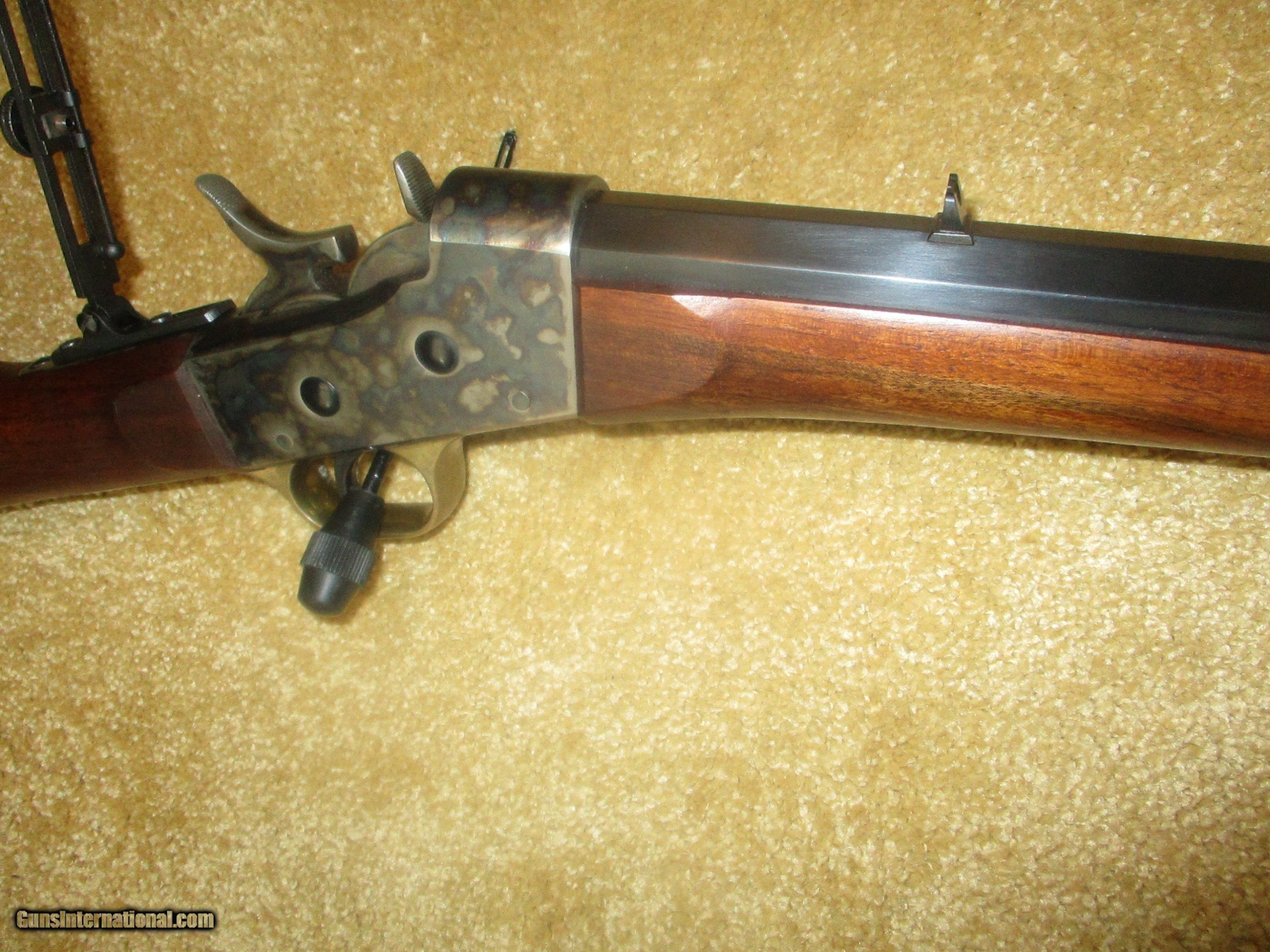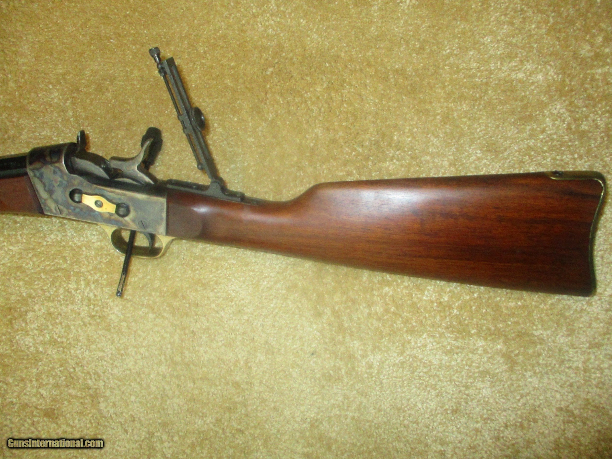 Description: long range peep sight, 24 1/2" bbl., octogon bbl., straight walnut stock, solid brass creseant butt, front brass banded forearm, brass trigger guard & tang, rich vivid case colors, (11 lbs.) protects against 45/70 recoil, 99% blue bbl.,excellent bore, looks pretty new, shot few times only!! SOLD |