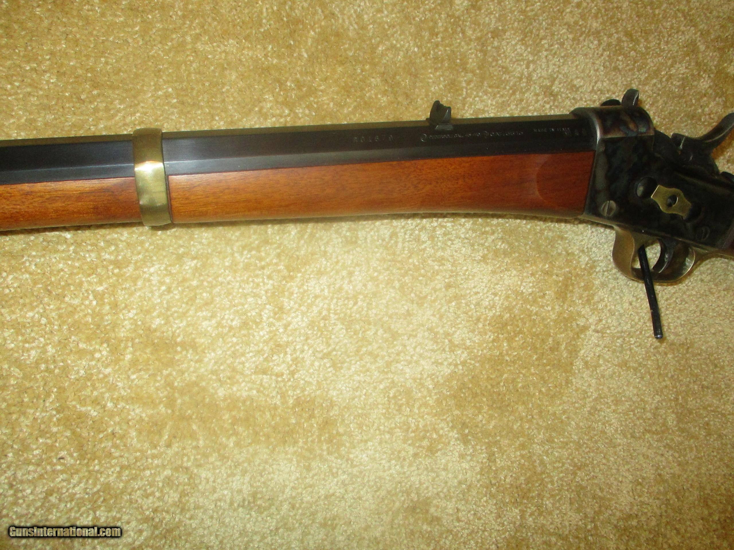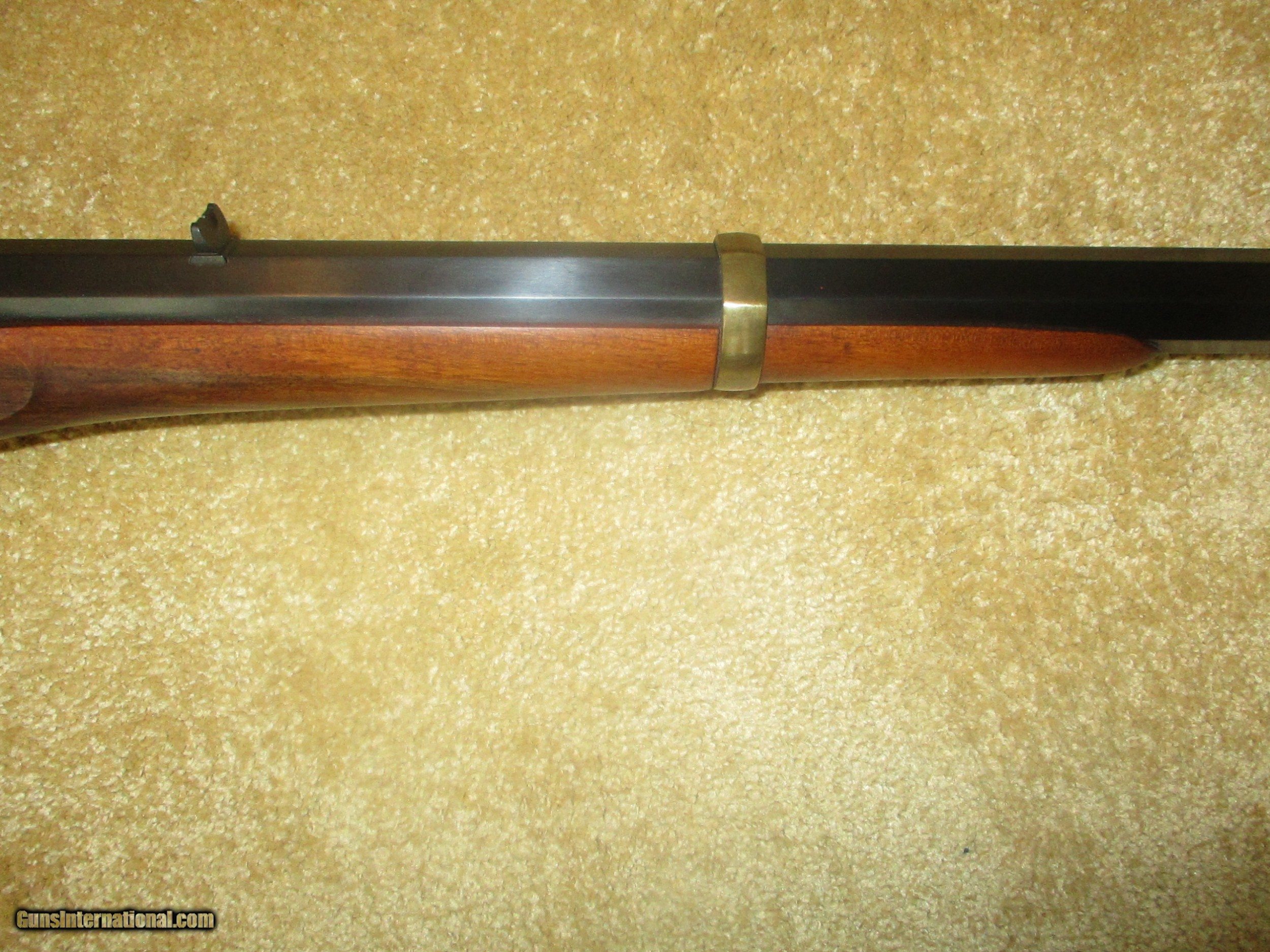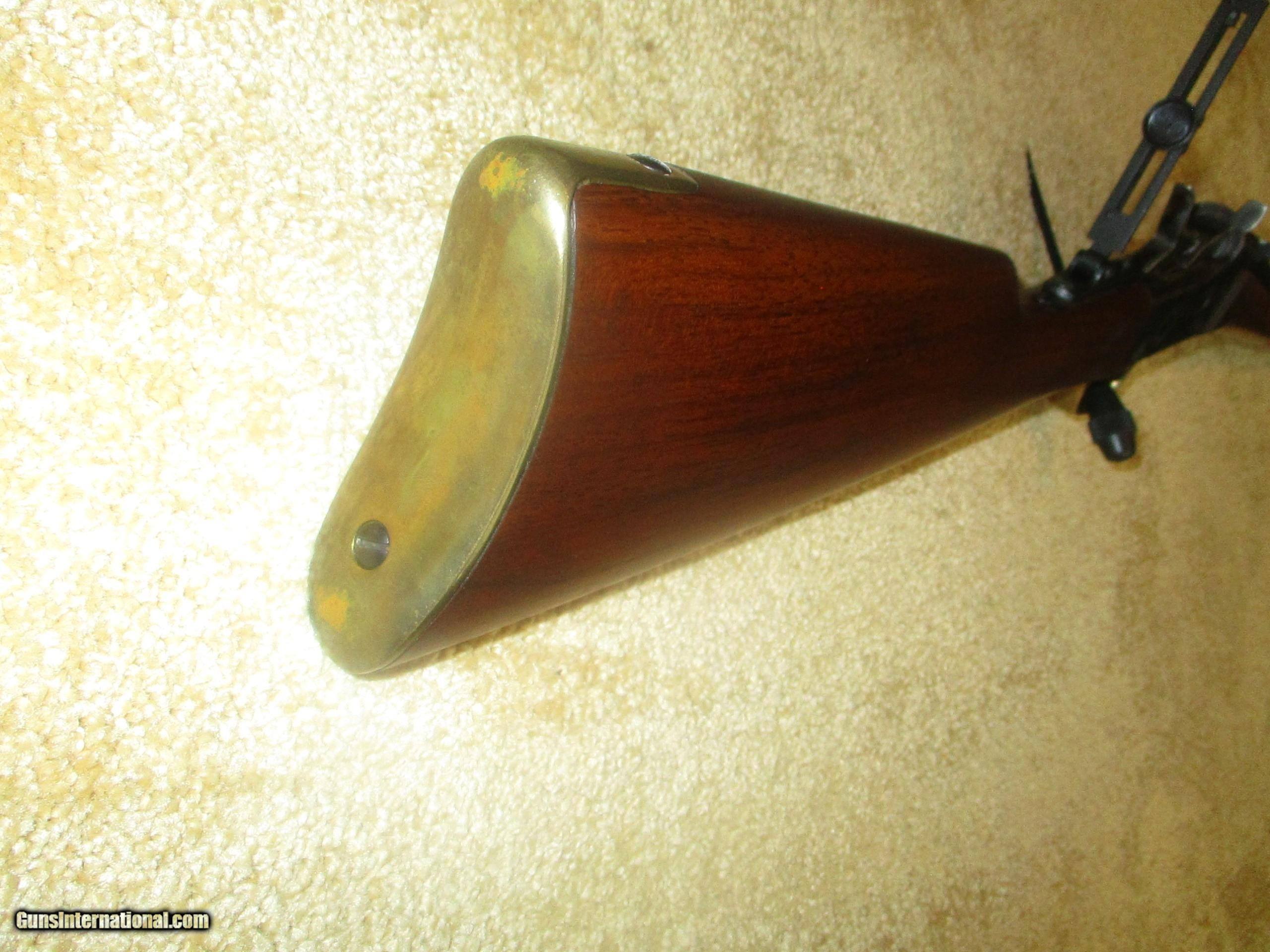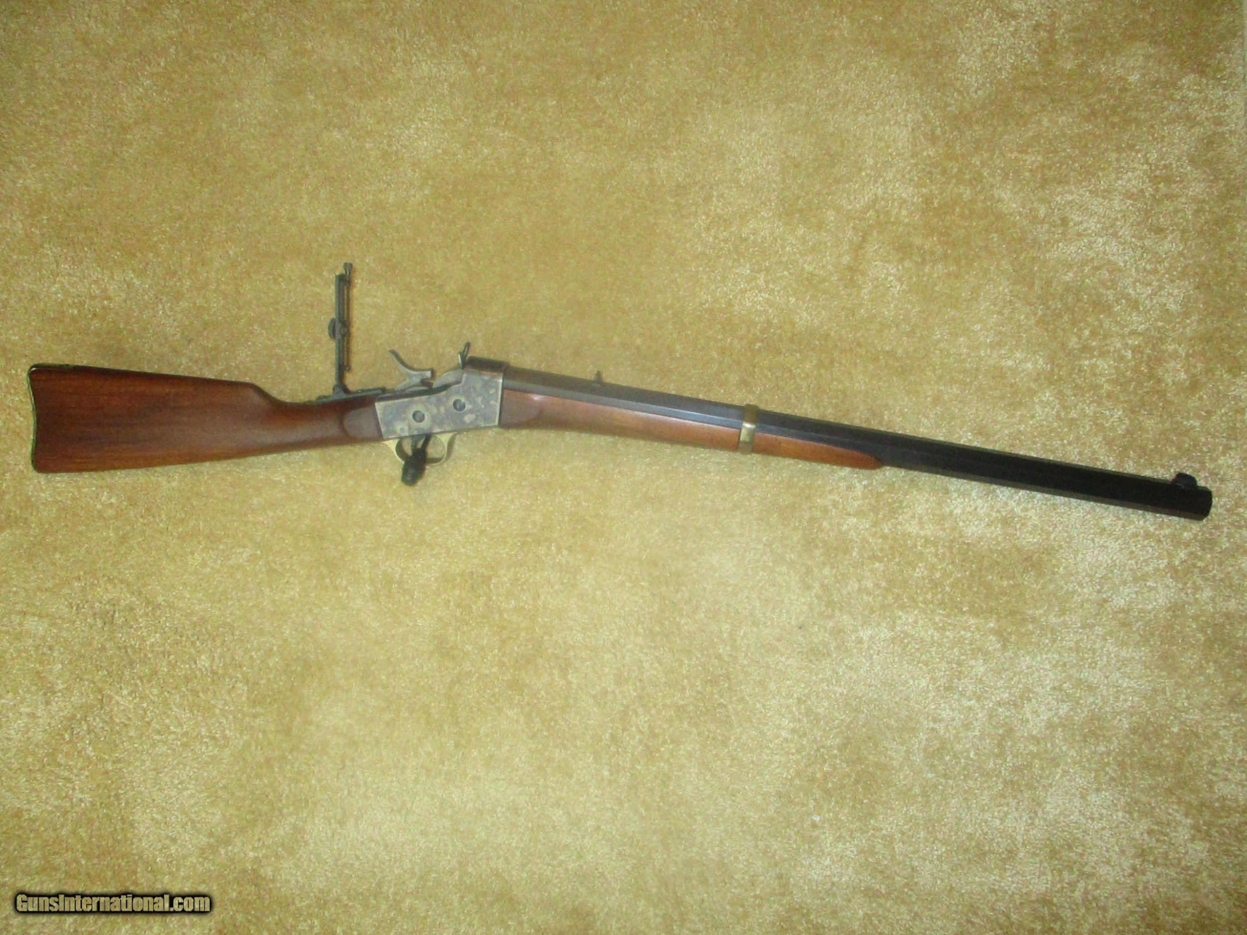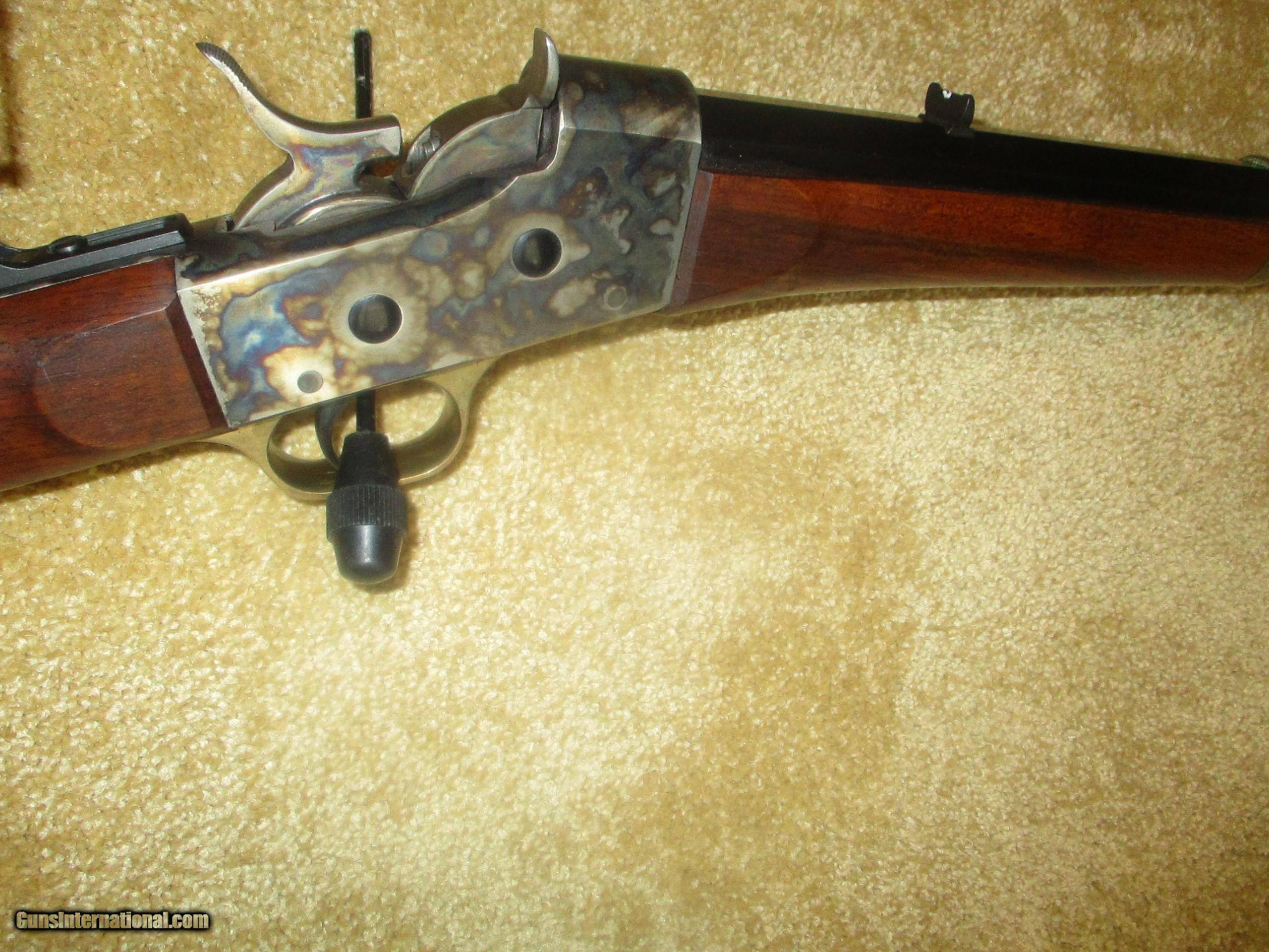 Description: long range peep sight, 24 1/2" bbl., octogon bbl., straight walnut stock, solid brass creseant butt, front brass banded forearm, brass trigger guard & tang, rich vivid case colors, (11 lbs.) protects against 45/70 recoil, 99% blue bbl.,excellent bore, looks pretty new, shot few times only!! SOLD |
